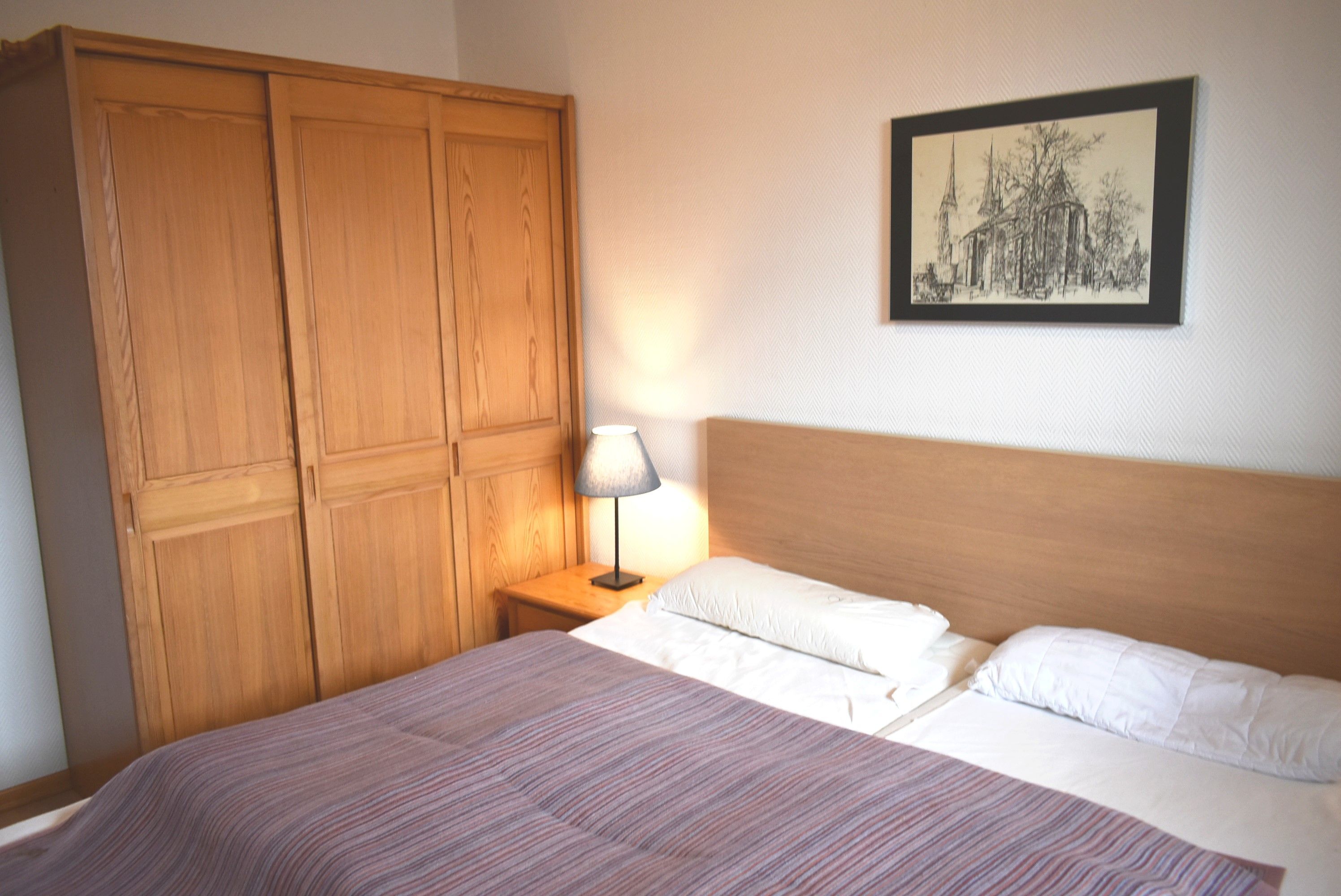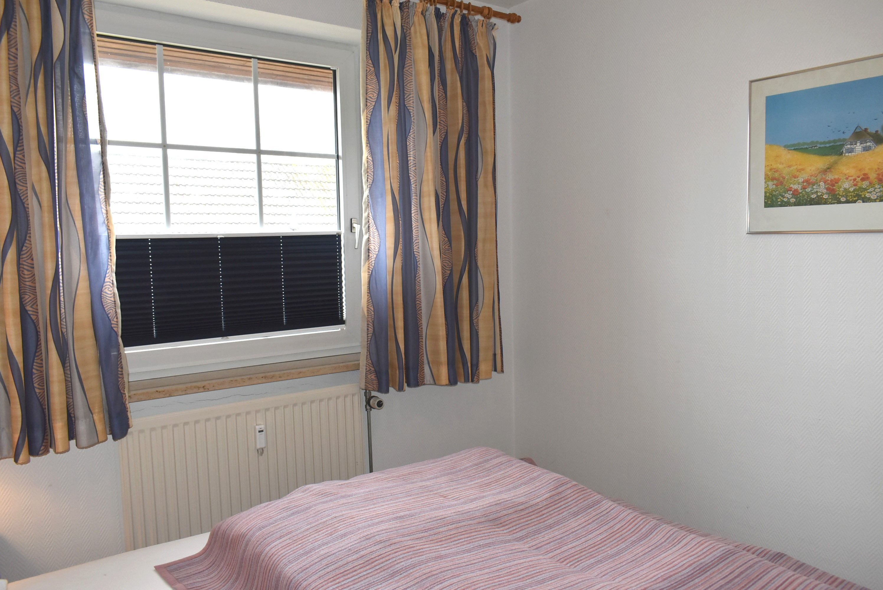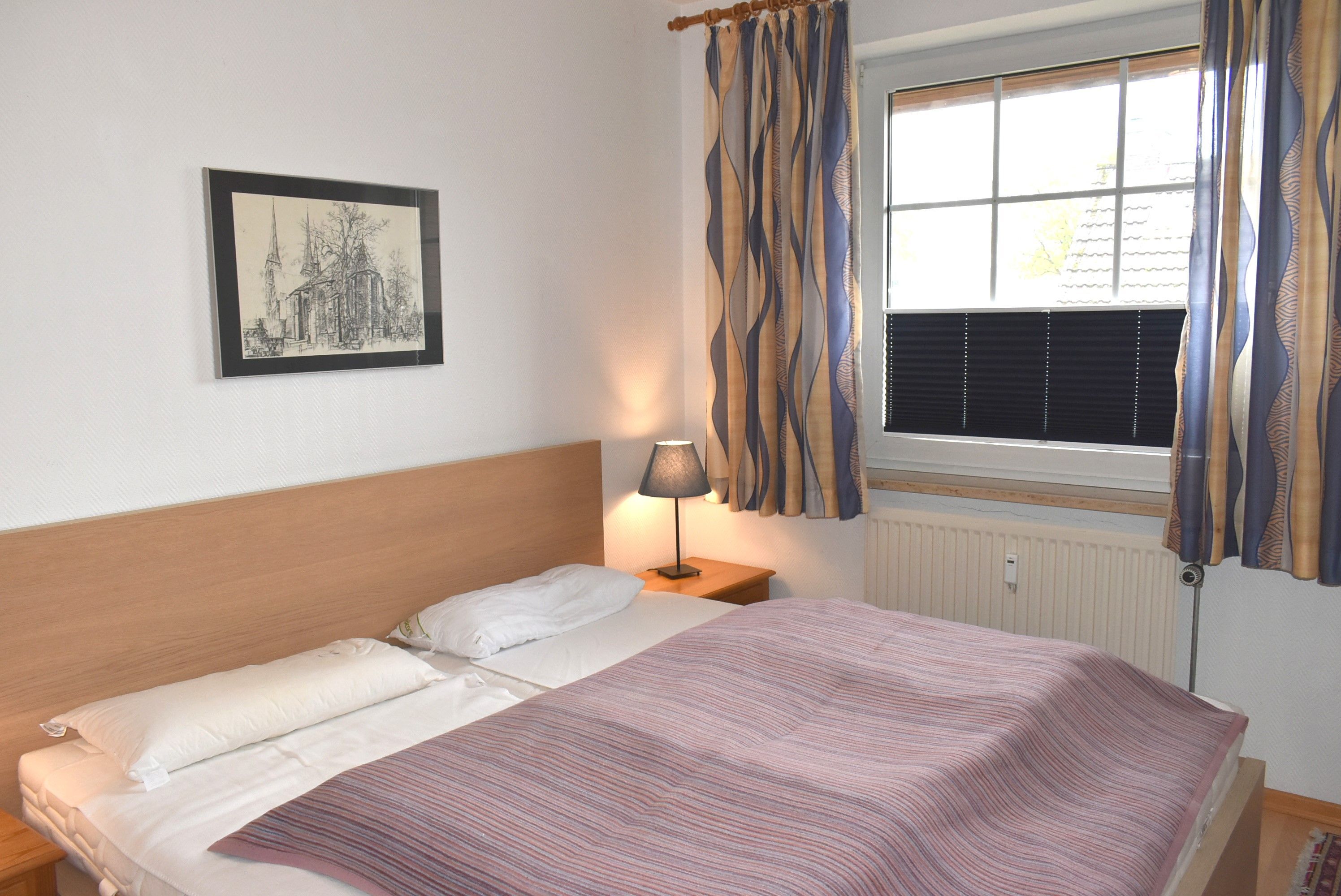 Schlafzimmer 1: 2 Matratzen, 2 Nachttische, 2 Nachttischlampen, Doppelbett 2,00 x 1,80 m, Kleiderschrank, Verdunklungsplissee