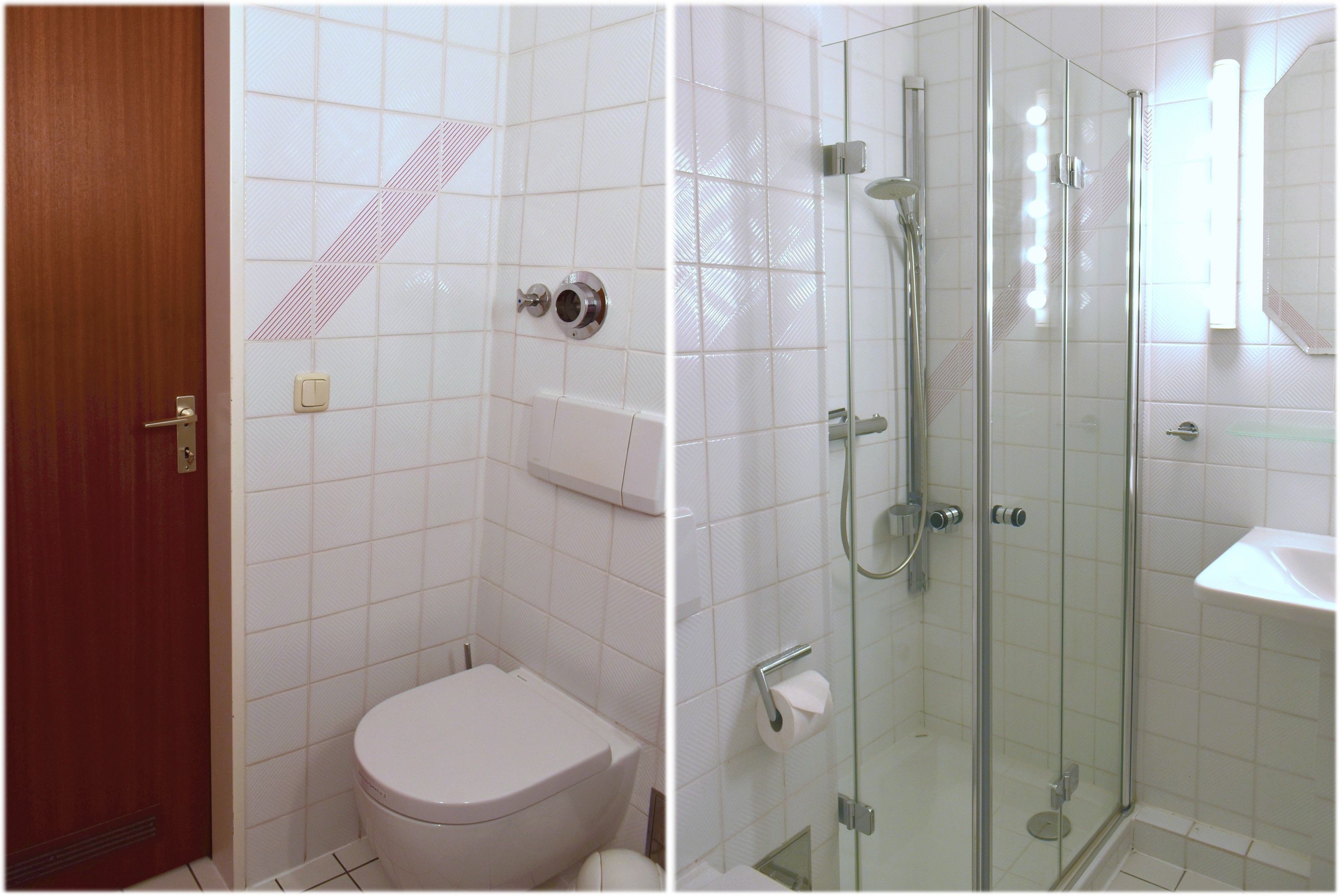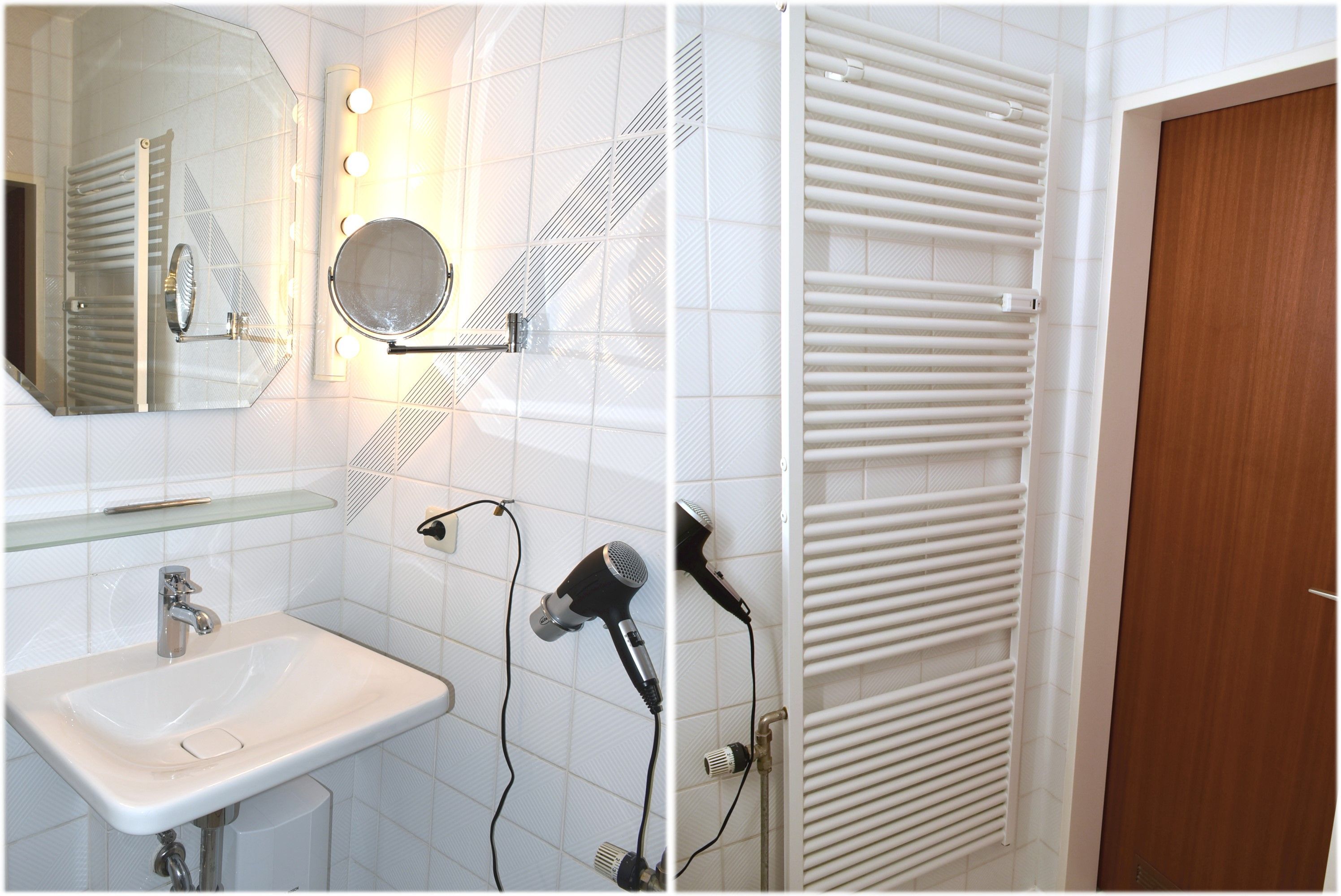Bad 1: Fön, Handtuchheizung, Spiegelschrank, Waschbecken, WC