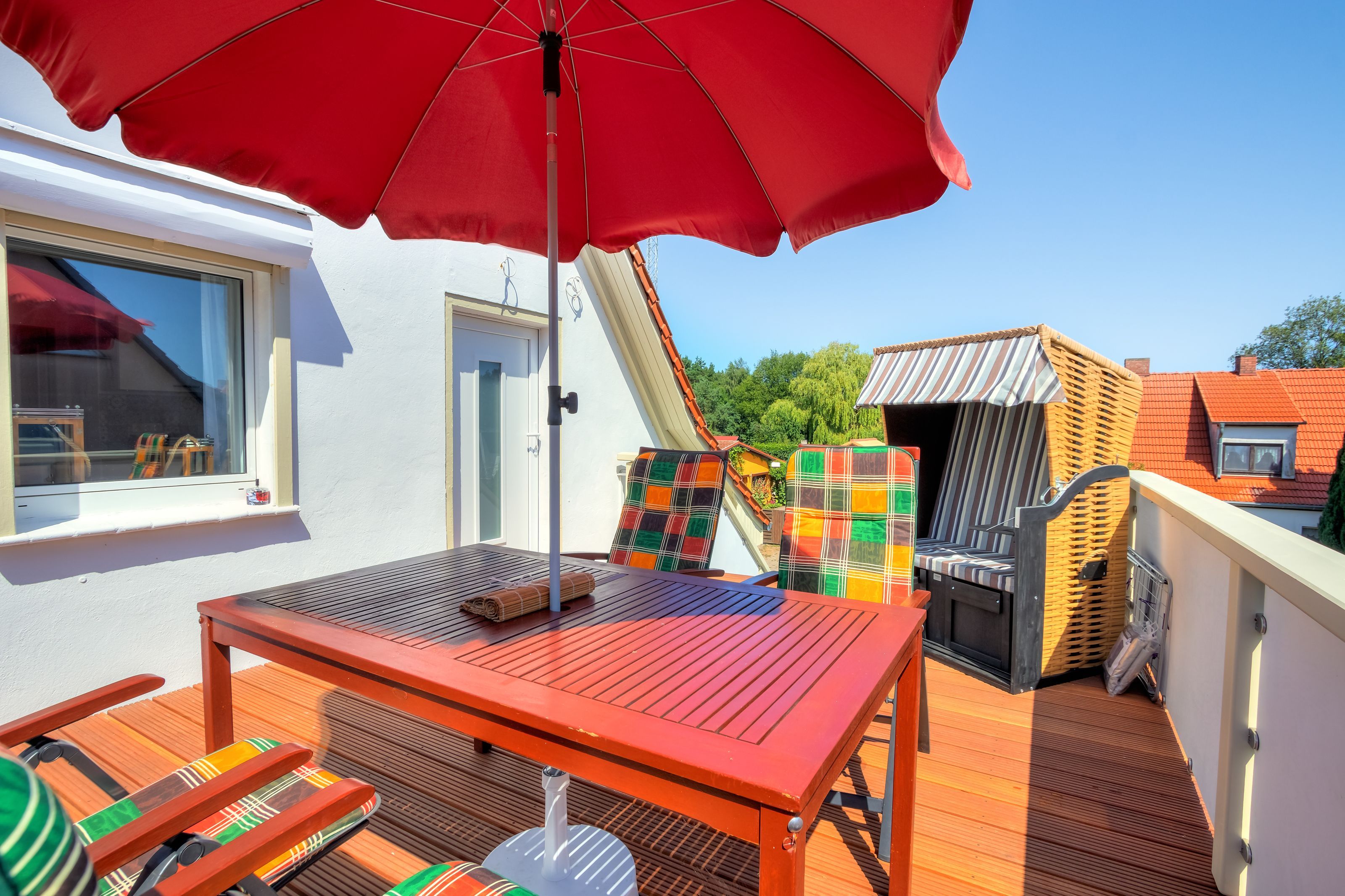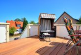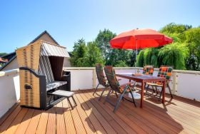 Die nach Osten ausgerichtete Balkon-Terrasse lädt auf Gartenmöbeln und einem windschützenden Strandkorb zum Relaxen und Sonnenbaden ein. Frühstücken Sie bei Sonnenschein und genießen Sie die Ruhe und den herrlichen Ausblick.