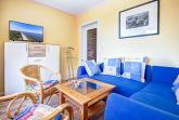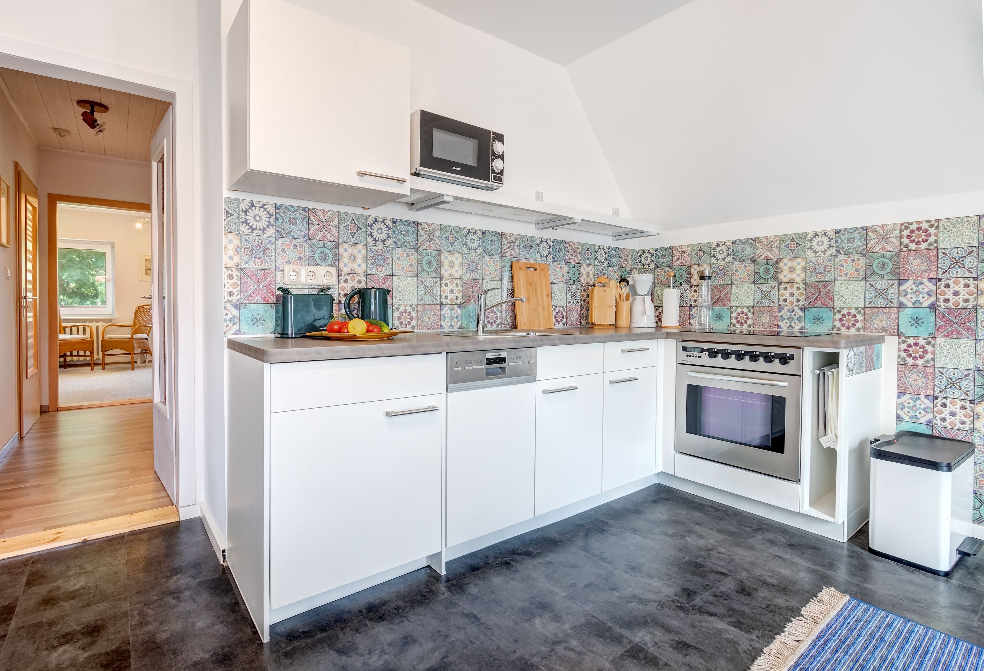 Über eine Außentreppe gelangen sie auf eine ca. 20 m² große Terrasse mit Sitz,- bzw. Liegemöglichkeiten und Grill. Von dort aus betreten Sie die geräumige Wohnung und kommen in eine Wohnküche mit einer voll ausgestatteten Küchenzeile mit Kühlschrank und integriertem Frostfach, Mikrowelle, Herd mit Backofen, Geschirrspüler, Wasserkocher, Toaster, Kaffeemaschine und weiteren nützlichen Ausstattungselementen.