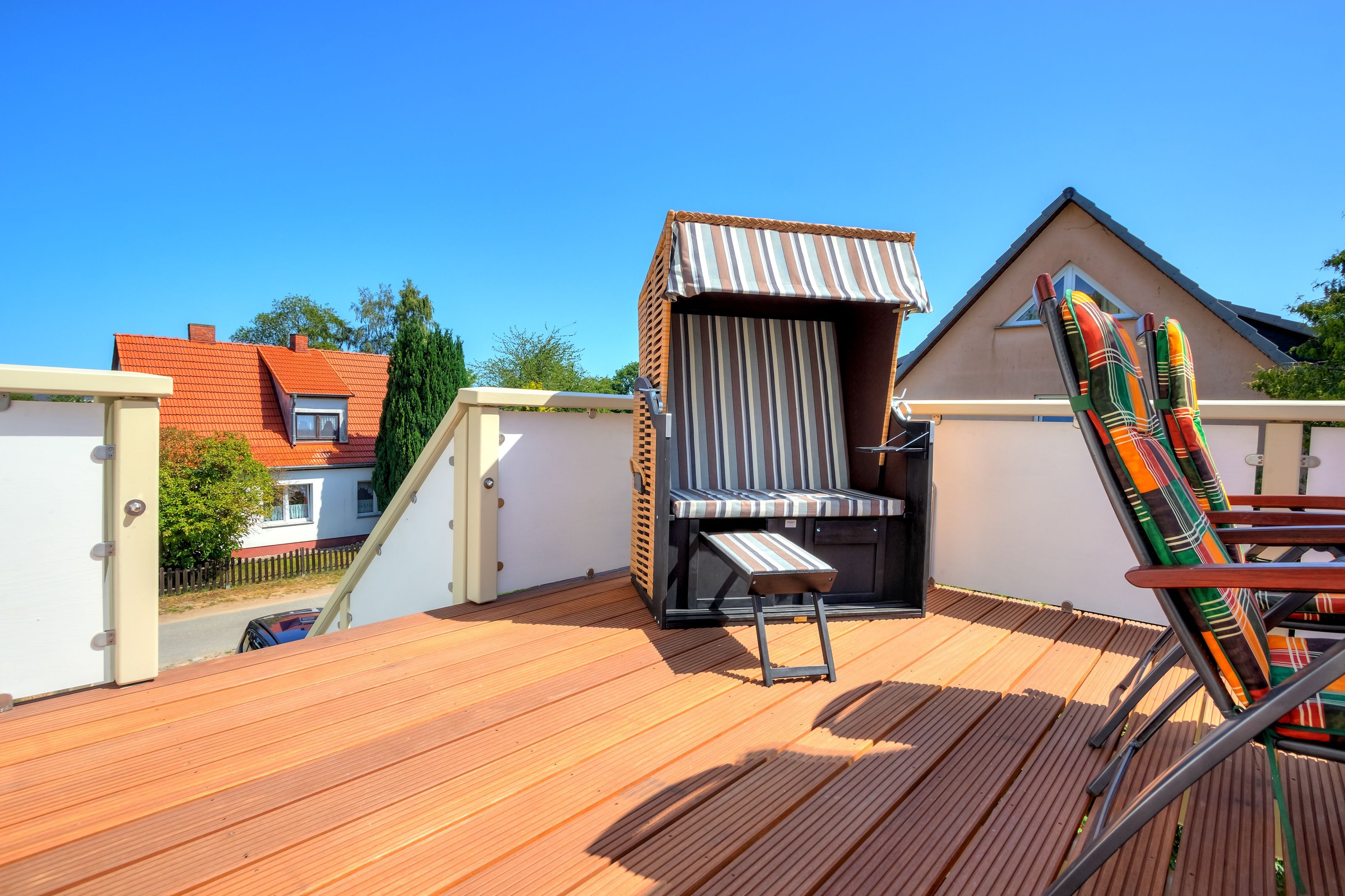 Ein echtes Highlight ist der Balkon, der nach Osten ausgerichtet ist und Ihnen den perfekten Ort für ein entspanntes Frühstück mit Blick auf die Natur bietet. Der windgeschützte Strandkorb rundet das Erlebnis ab hier können Sie die Seele baumeln lassen und den Tag genießen.