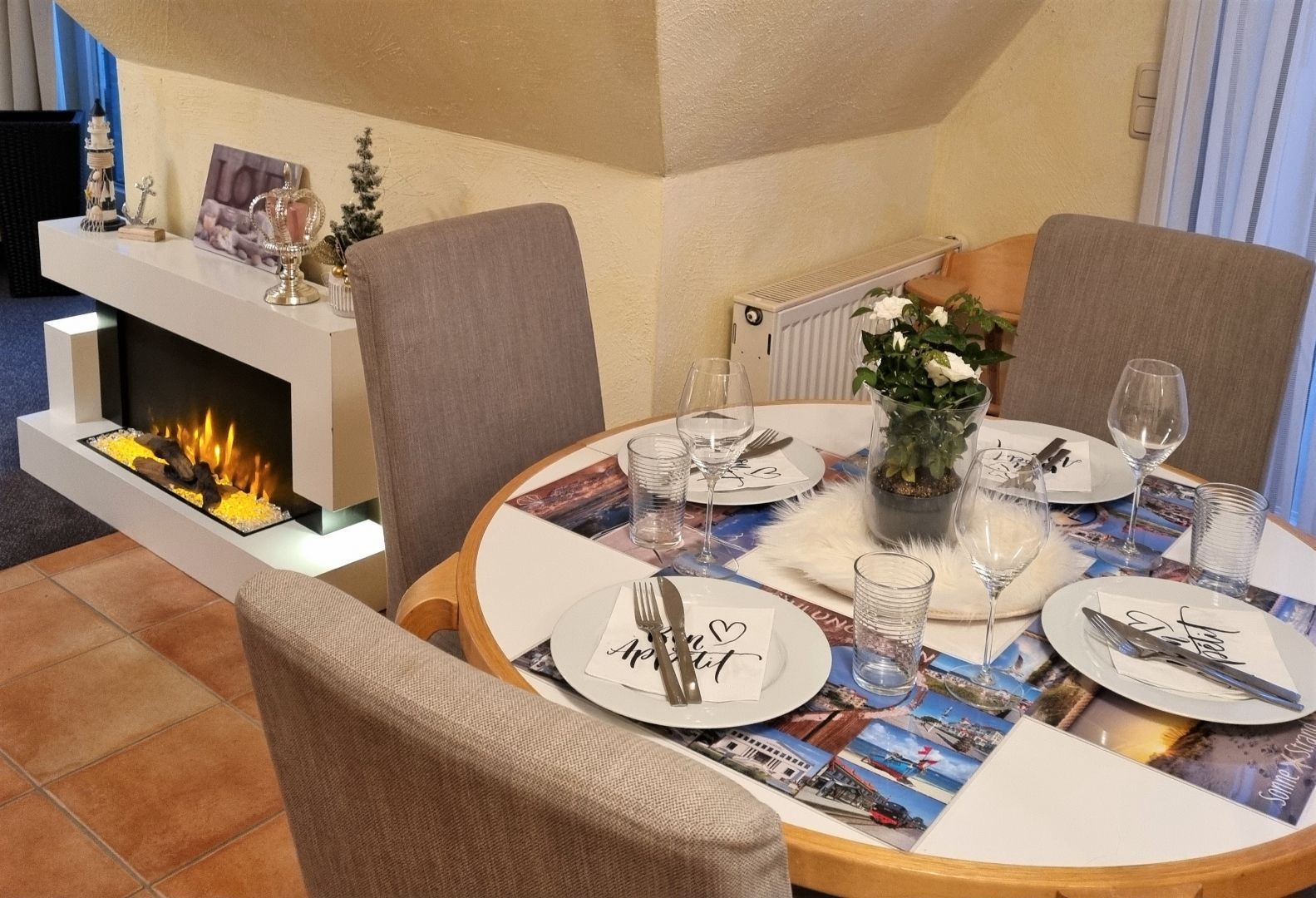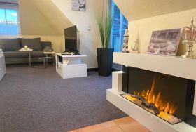 Ein großer, moderner E-Kamin rundet, insbesondere in den kalten Monaten, Ihre Urlaubsabende ab.
