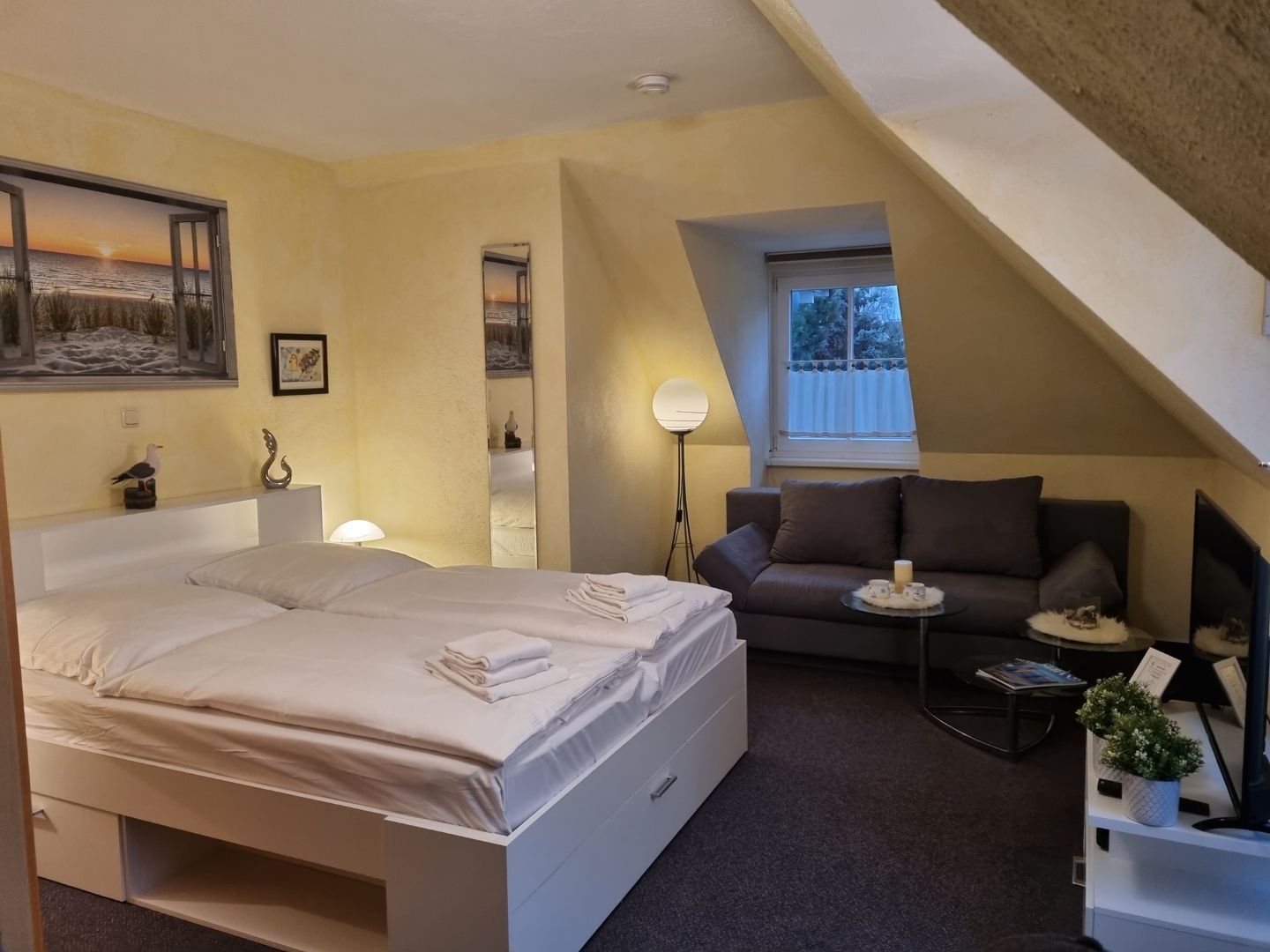 Ein gemütliches neues Doppelbett, ein bequemes Schlafsofa, ein großer Smart-TV mit Netflix/Amazonprime (eigener Account erforderlich), ein DVD-Player, eine Stereoanlage und die bodentiefen Fenster sorgen für ein hervorragendes Urlaubsambiente.