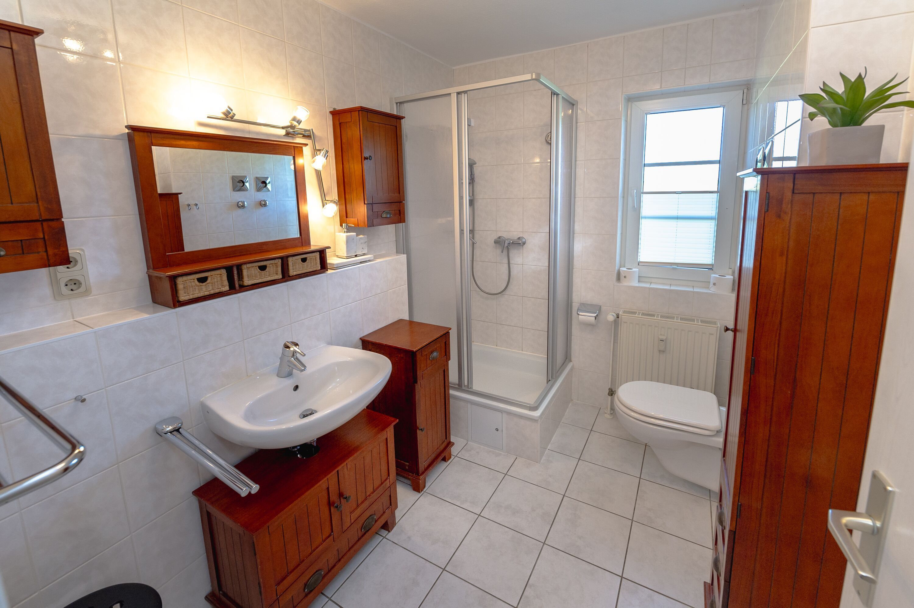 Die Fewo 16 ist ein 3-Raum-Appartement mit ca. 56 m² Wohnfläche. Unter leichten Dachschrägen erwartet sie Sie im Obergeschoss des reetgedeckten Hauses.