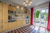 Die Küche ist komplett ausgestattet mit einem 4-Zonen-Cerankochfeld, einem Backofen, einem Kühlschrank, einer Geschirrspülmaschine, einer Mikrowelle, Wasserkocher, Kaffeemaschine, Toaster und diversem Kleininventar. Von hier aus hat man ebenfalls den Zugang zur möblierten Terrasse nach Süden.
