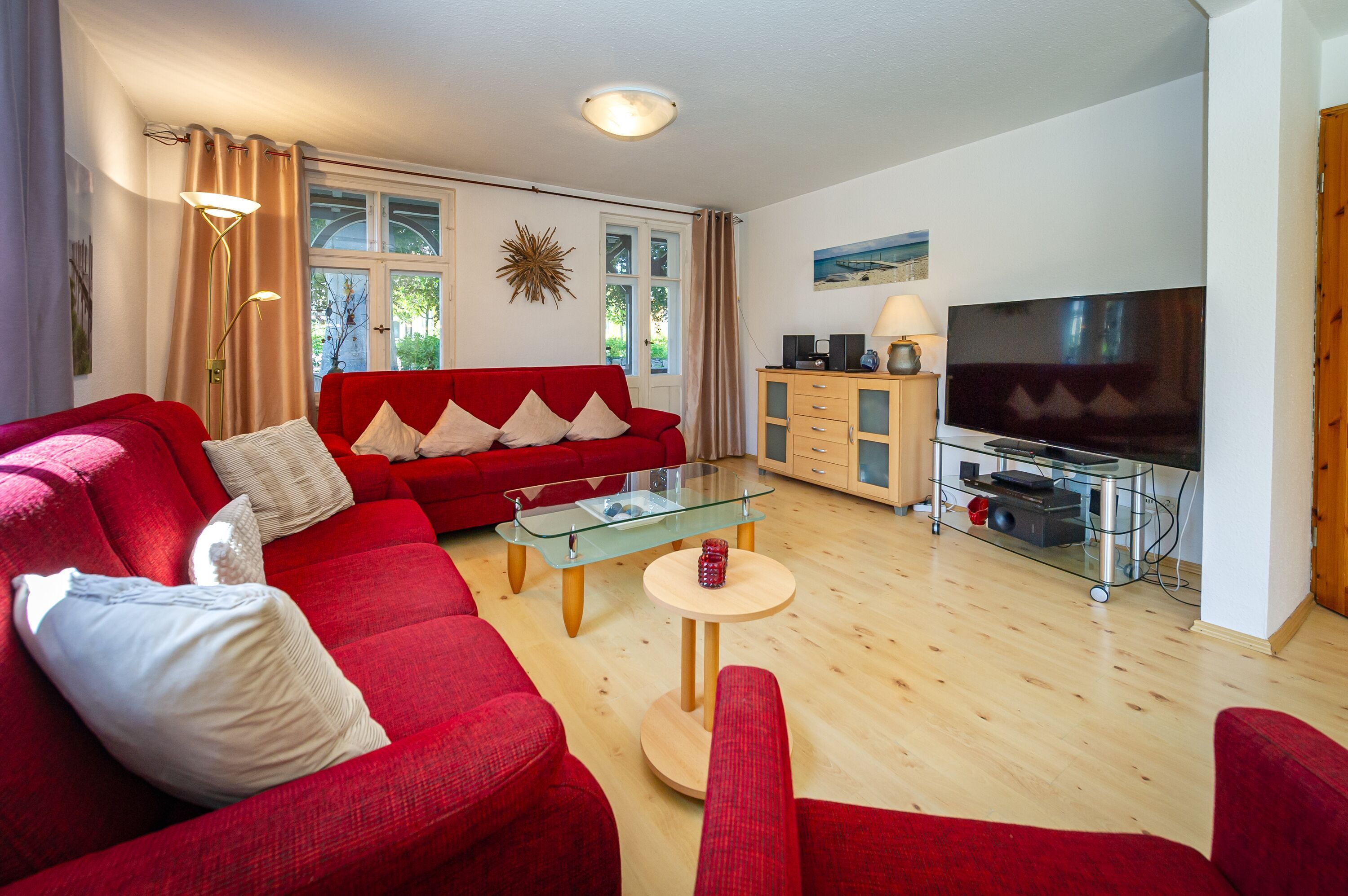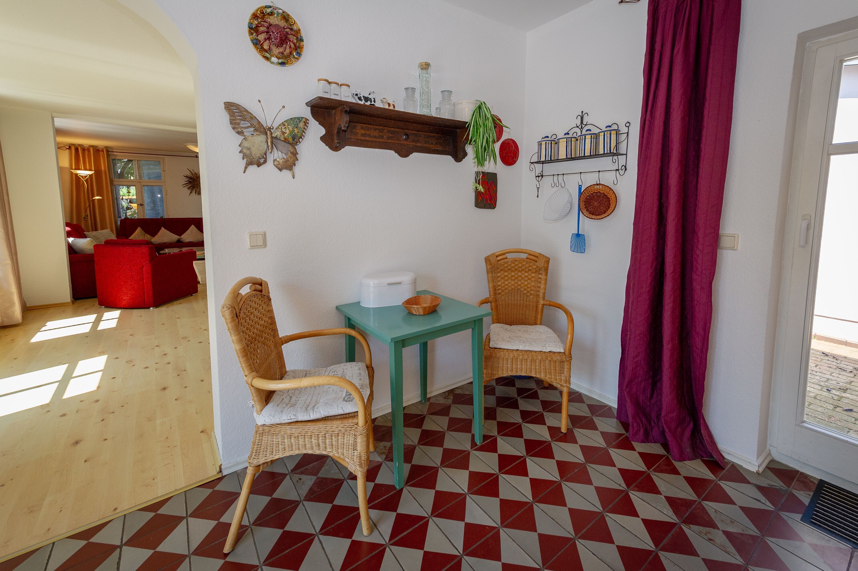 Diese gemütliche 4-Raum-Wohnung mit einer Wohnfläche von ca. 90 m², einer vorgelagerten Sonnenterrasse und einer Einrichtung im Landhausstil erwartet Sie im Erdgeschoss des historischen Hauses. Ein kleiner Garten sowie ein kleiner Innenhof gehören ebenfalls dazu. Die Balkon- bzw. Terrassenmöbel stehen saisonal - in der Regel von Mai bis Ende September - zur Verfügung.