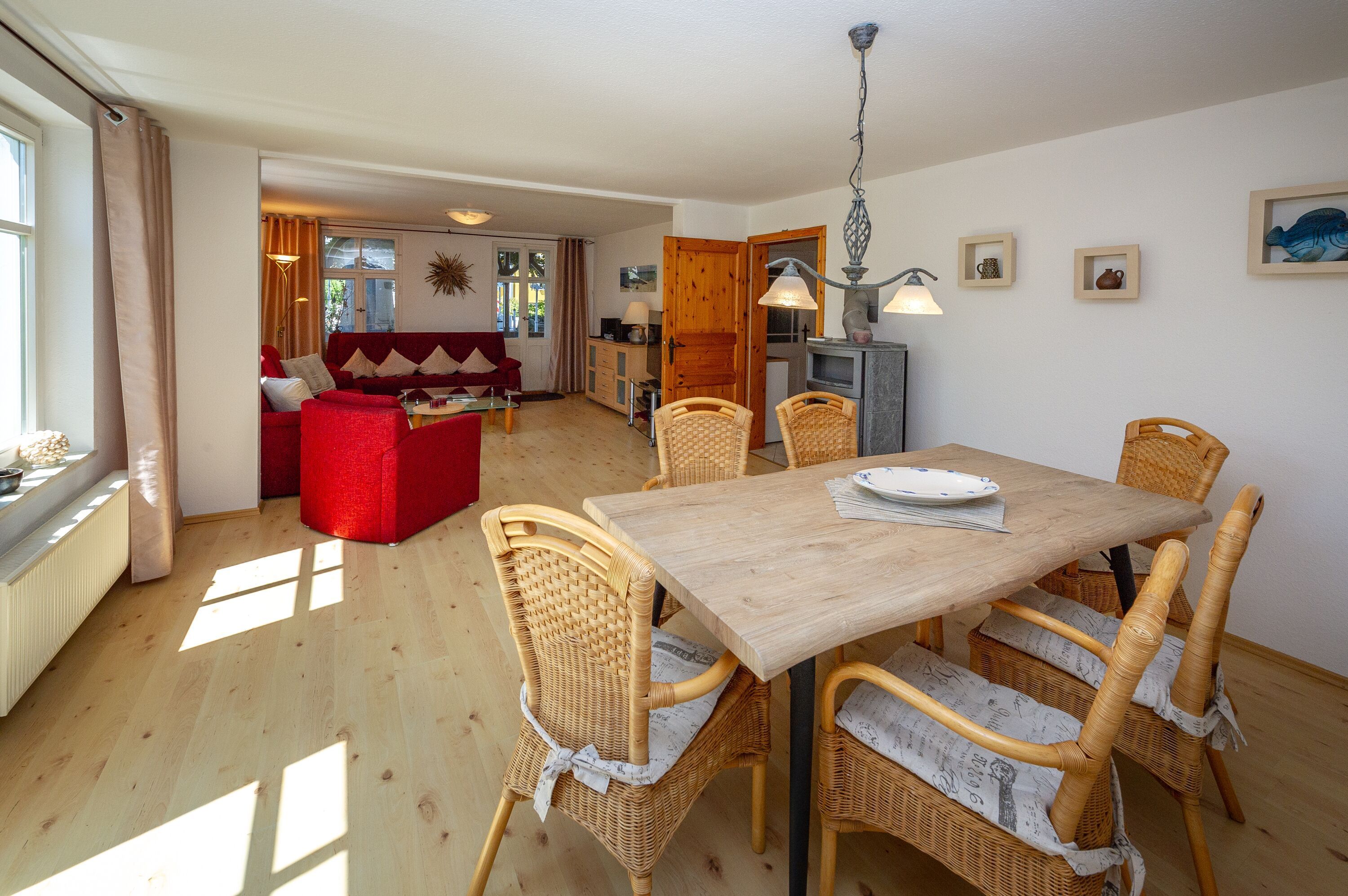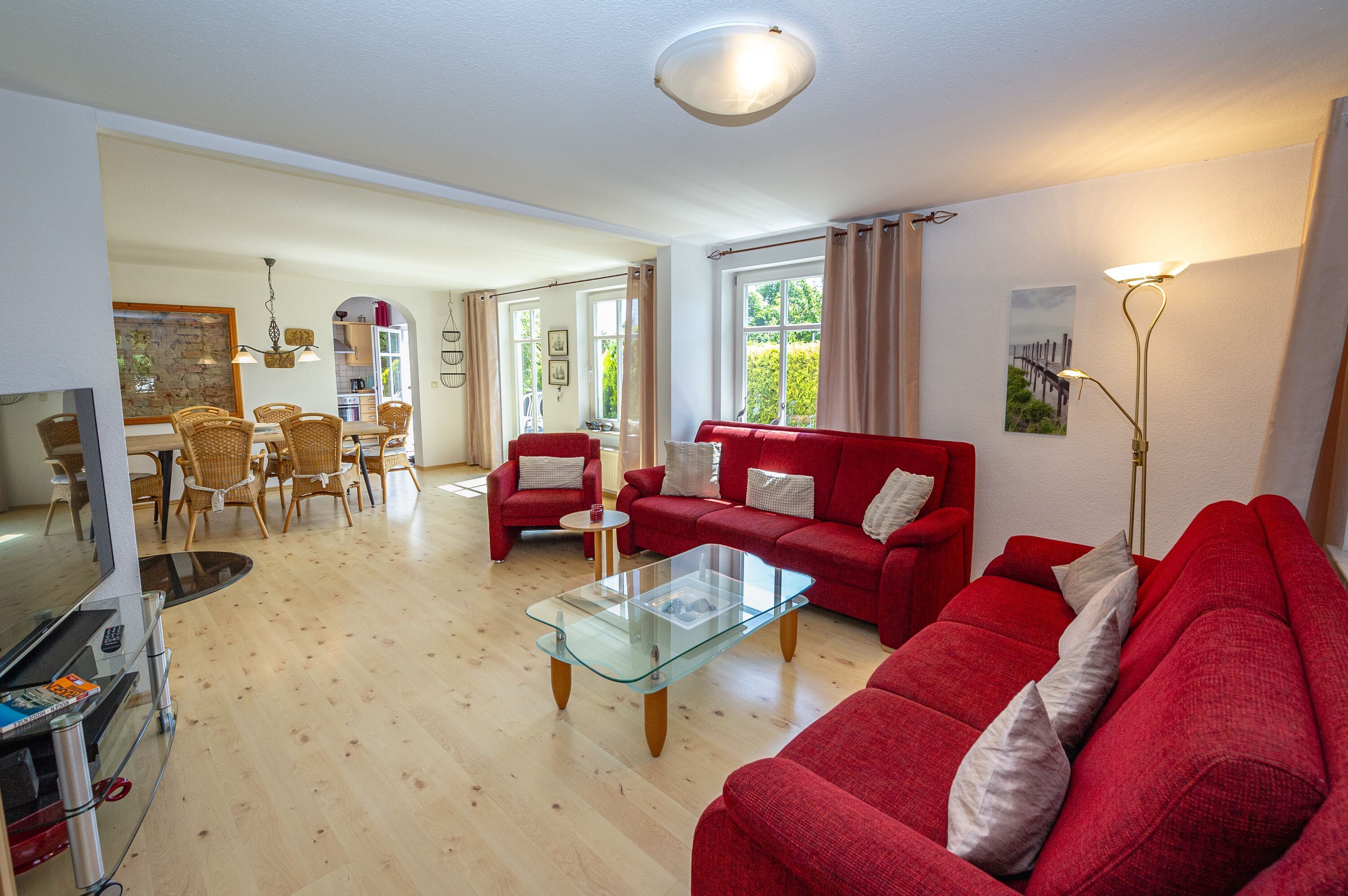 Das weiträumige, zur Küche hin offen gehaltene Wohnzimmer verfügt über eine Essecke mit einem großen Esstisch, eine großzügige Sitzlandschaft mit zwei großen Couchen und einem bequemen Sessel mit Fußhocker. Ein Flachbild-TV, ein DVD-Player und eine kleine Stereonlage mit CD-Player sorgen für Unterhaltung. Kostenfreies W-LAN steht Ihnen natürlich ebenfalls zur Verfügung. Ein schöner Kaminofen verspricht gemütliche Stunden vor dem knisternden Feuer.