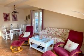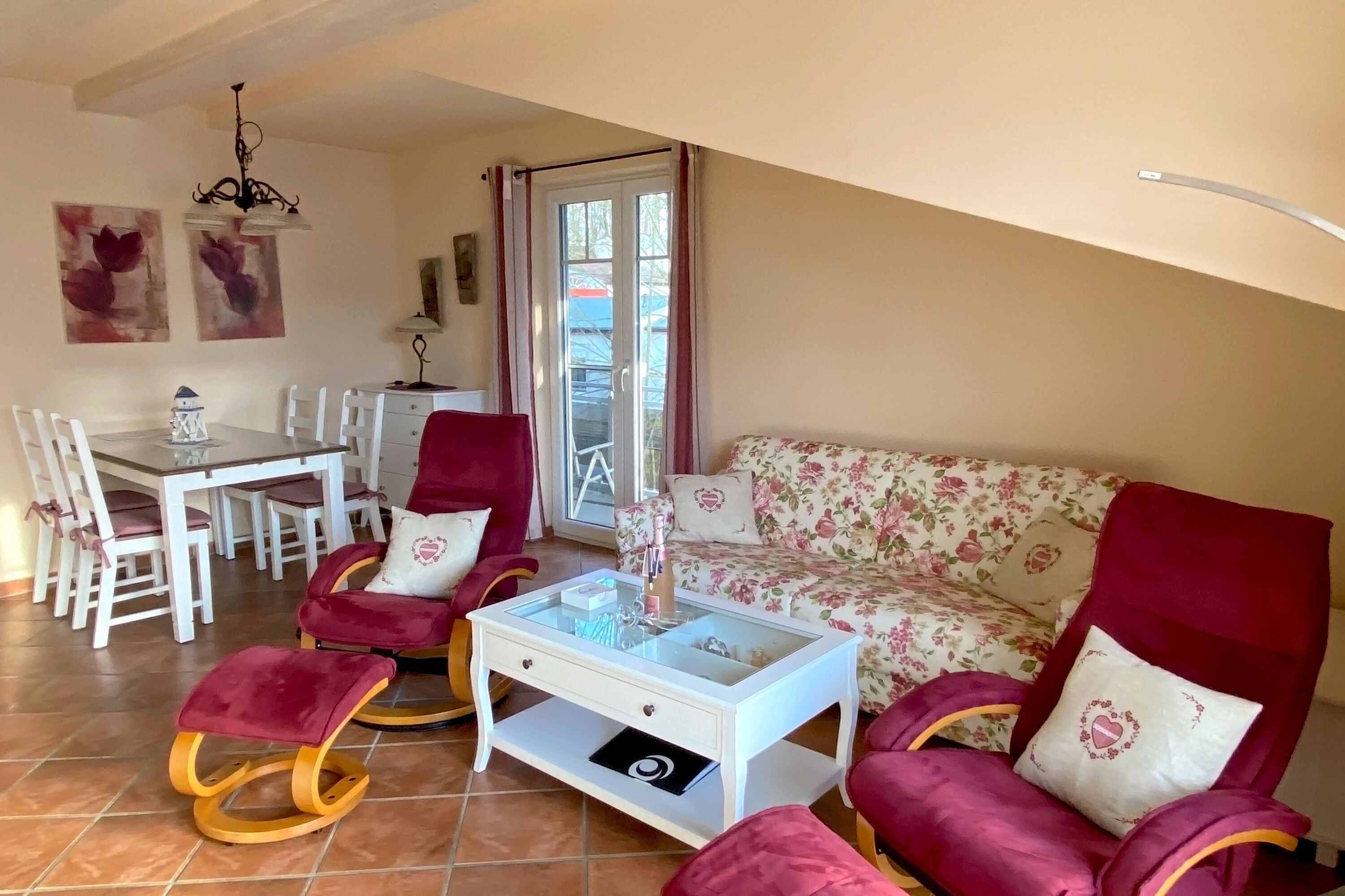 Das große Wohnzimmer (Klick zum Video) mit sichtbaren Deckenbalken verfügt über ein gemütliches Sofa mit Schlaffunktion (hochwertige Matratze für angenehmen Schlafkomfort), einen Esstisch, einen 50 Zoll Smart-TV und eine Musikanlage mit Radio/CD/USB- sowie Smartphoneanschluss. Kostenfreies W-LAN mit 20 Mbit/s steht Ihnen in der Wohnung ebenfalls zur Verfügung.
