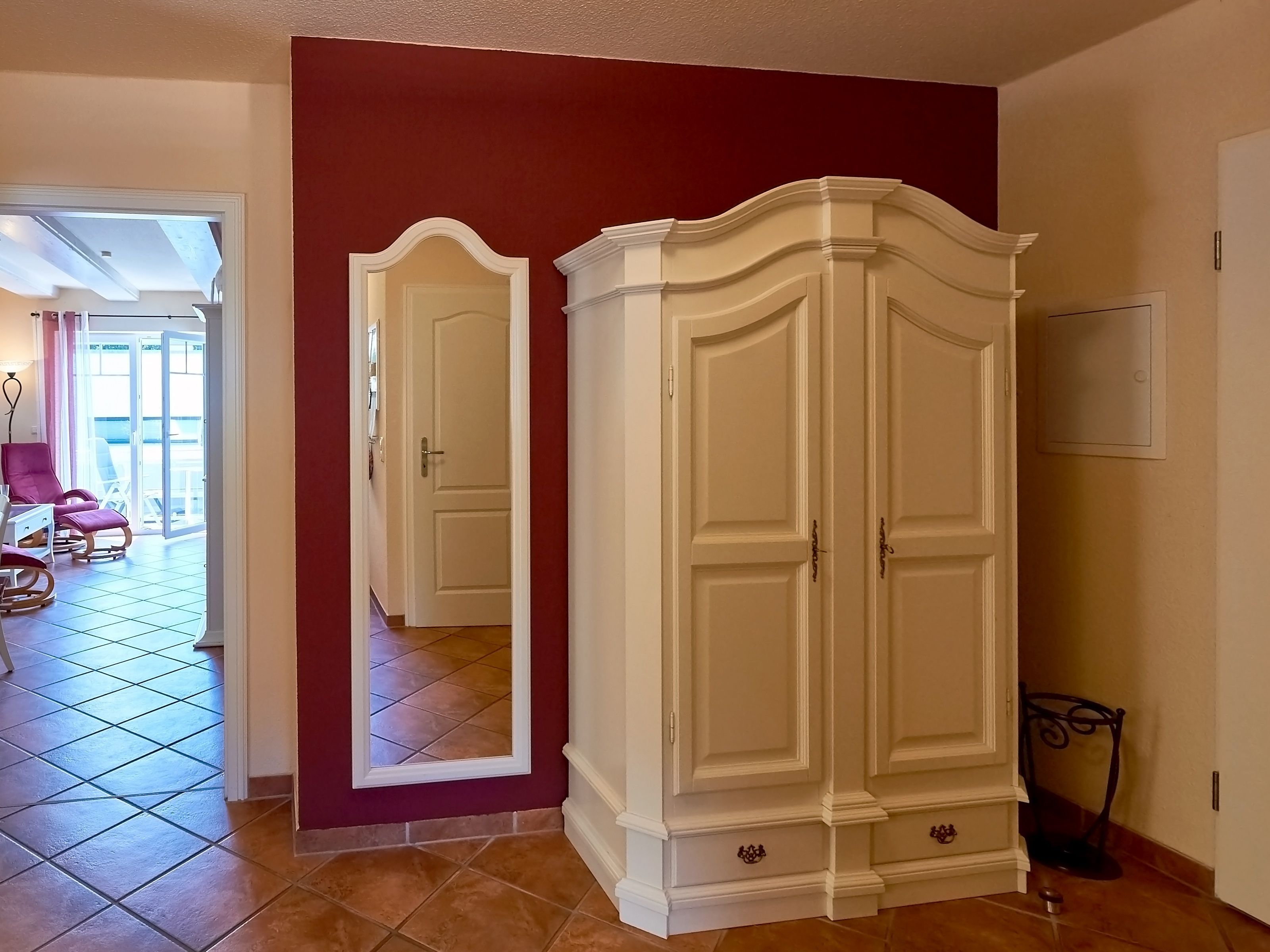 Dieses gut 65 qm große 2-Raum-Appartement begrüßt Sie im Dachgeschoss des Hauses und ist geschmackvoll & romantisch mit weißen Landhausmöbeln eingerichtet.