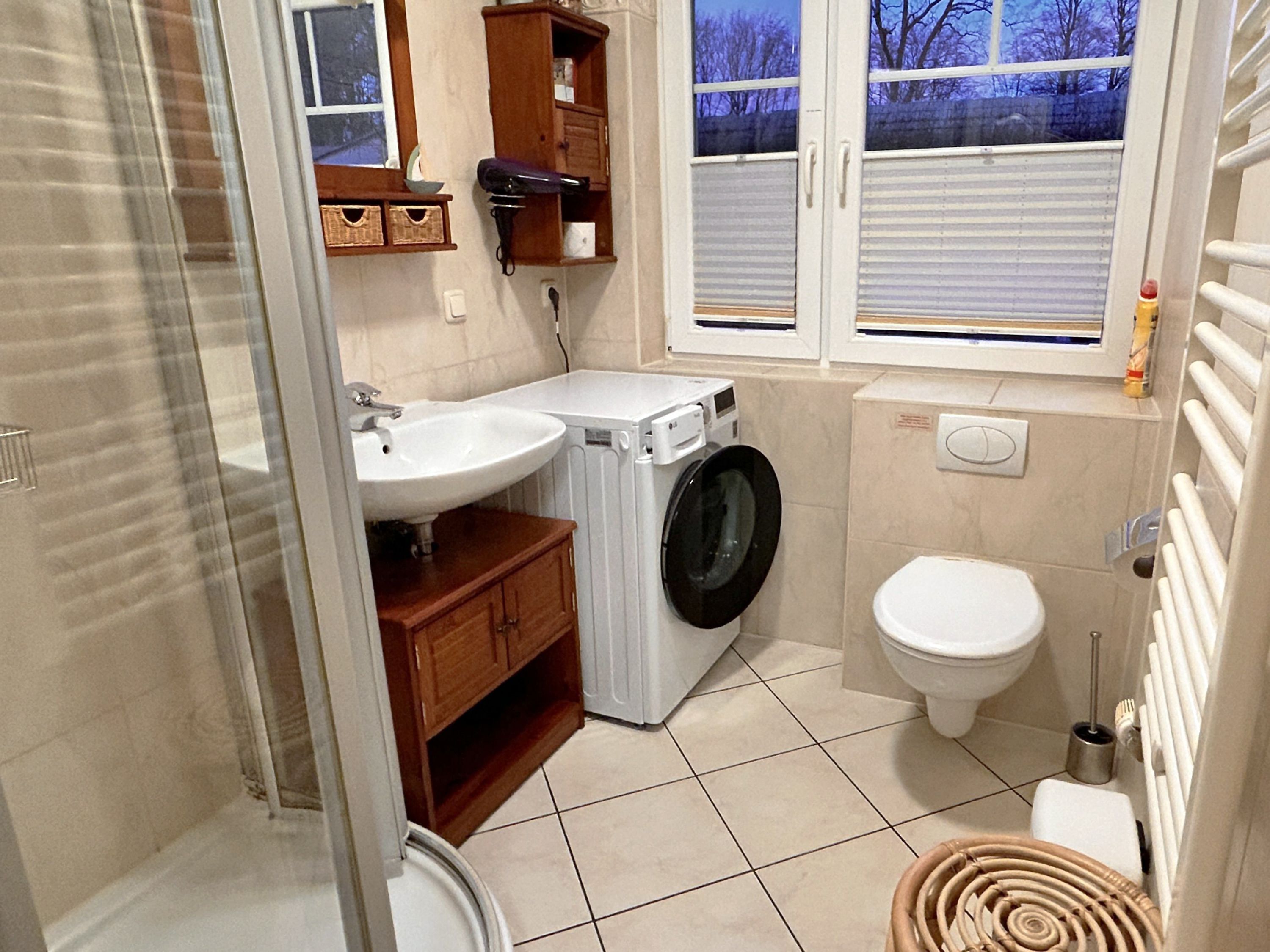 Das elegant geflieste Tageslichtbad überzeugt mit Dusche/WC, Waschtisch, beheizbarem Handtuchtrockner und Fön. Sogar einen Waschtrockner zur kostenfreien Nutzung finden Sie hier.