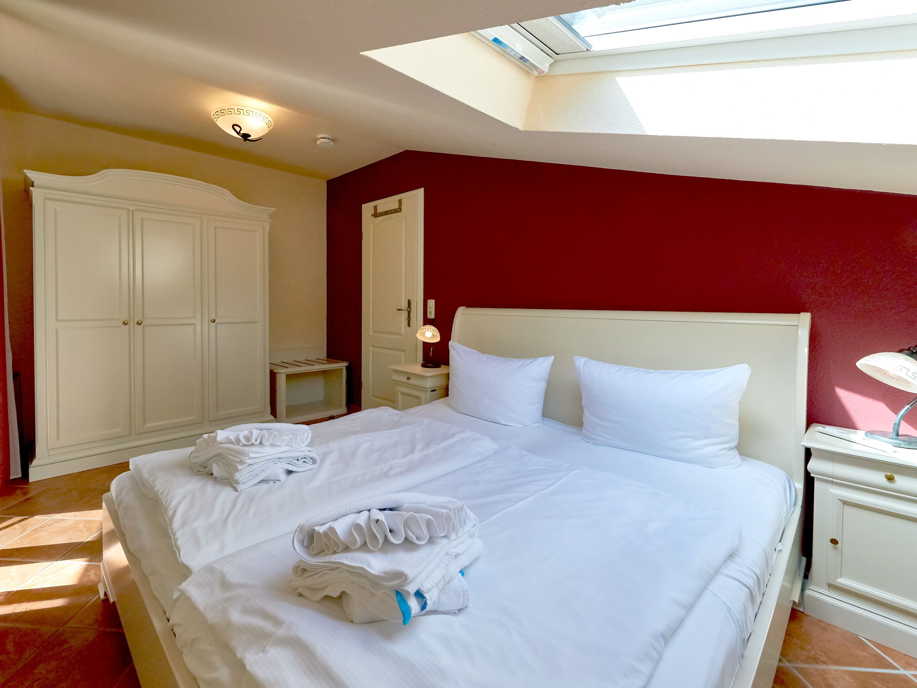 Ihr Schlafzimmer unter leichten Dachschrägen ist mit einem komfortablen Doppelbett und einem 32 Zoll-TV ausgestattet und eröffnet Ihnen durch das Dachfenster einen freien Blick in den Sternenhimmel.