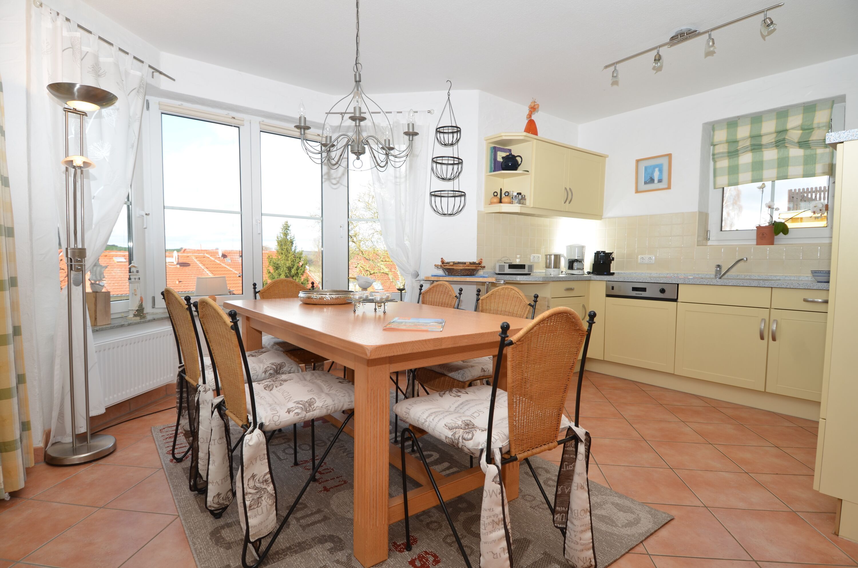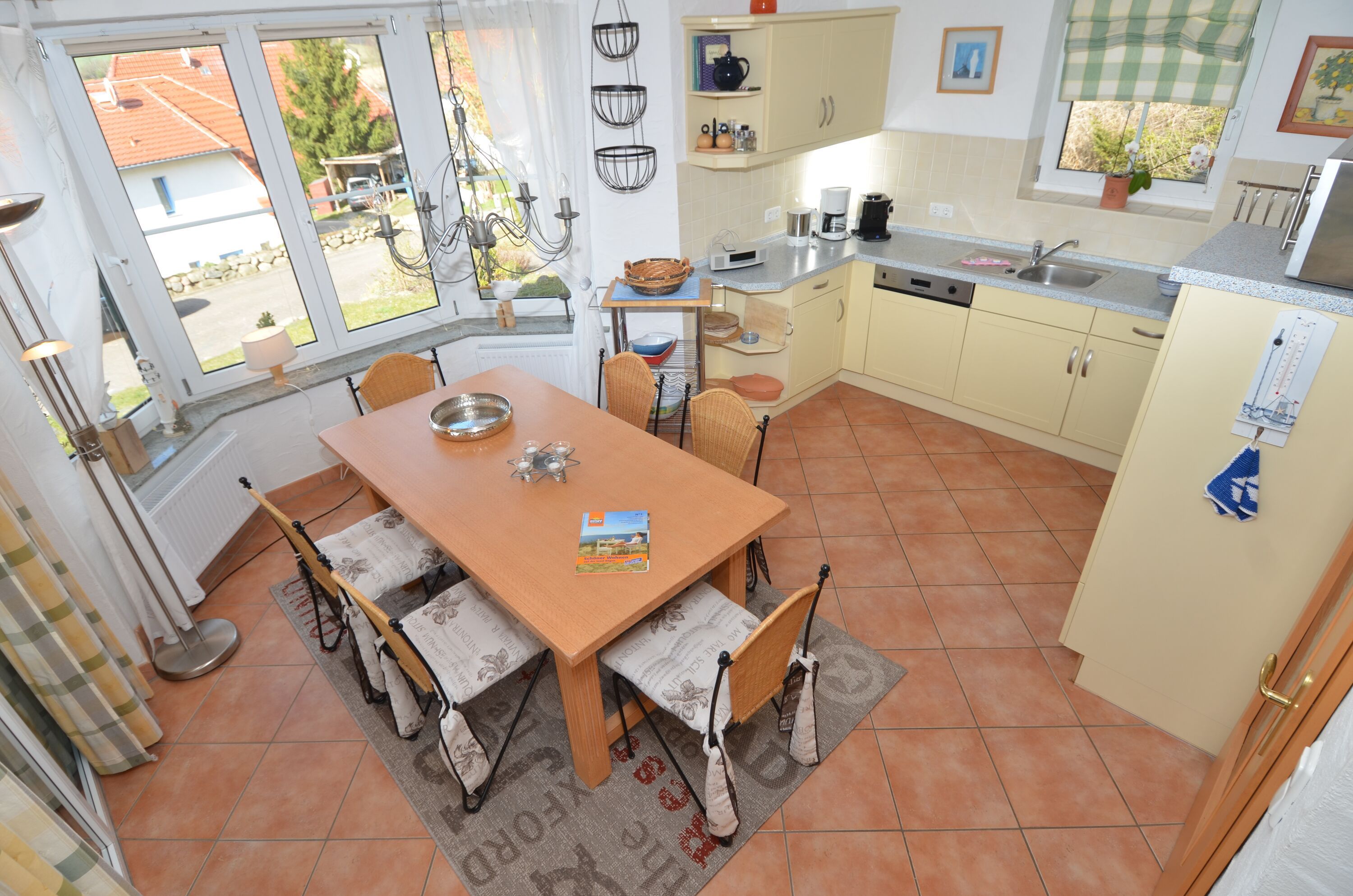 Die gut ausgestattete, offene Küche verfügt u.a. über einen Backofen, ein 4-Zonen-Ceranfeld, eine Mikrowelle, einen Kühlschrank und eine Spülmaschine. Selbstverständlich ist auch das nötige Koch- und Essgeschirr vorhanden. Speisen können Sie wahlweise am großen Esstisch drinnen oder natürlich auch gern draußen auf der Terrasse.