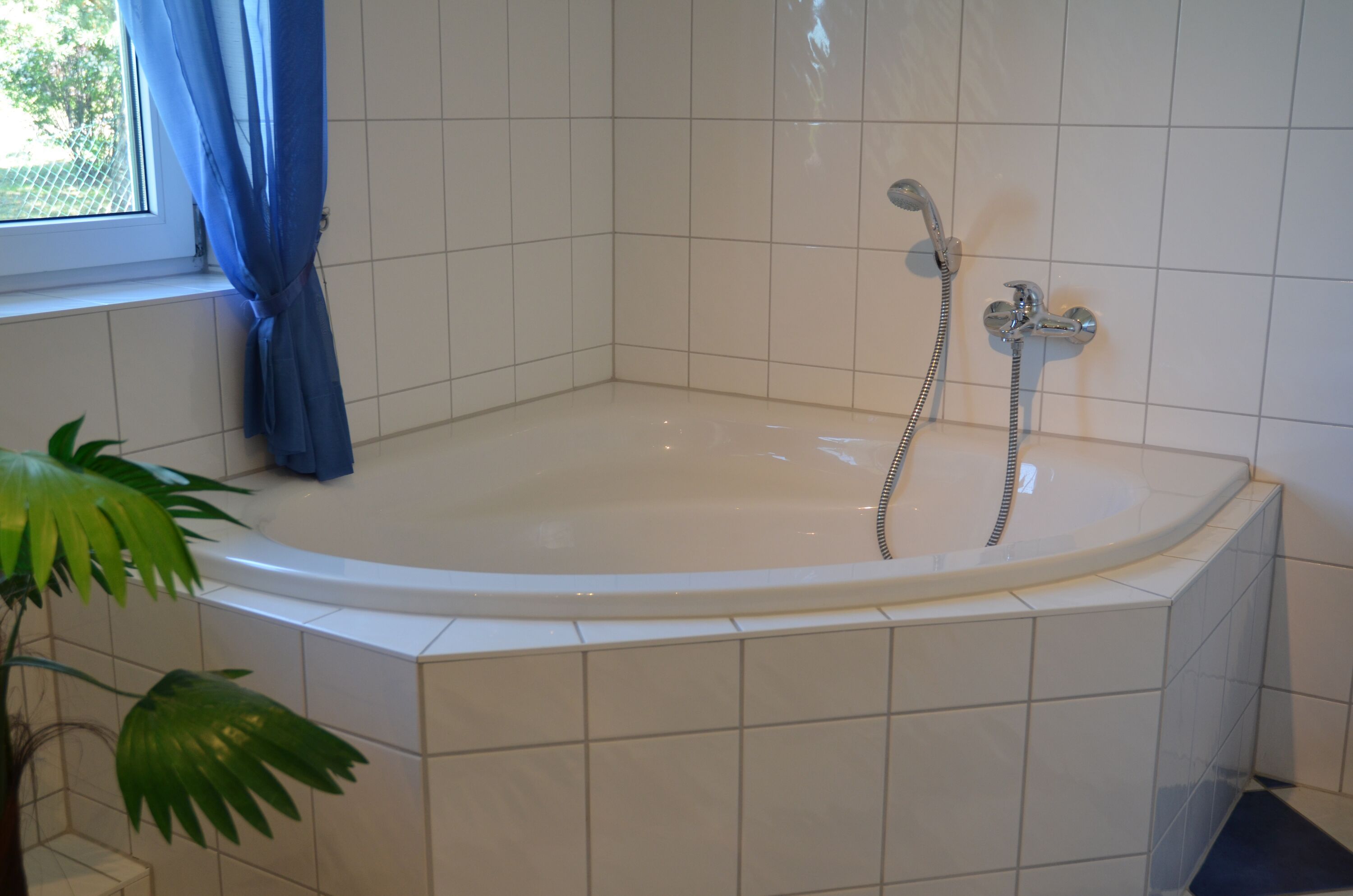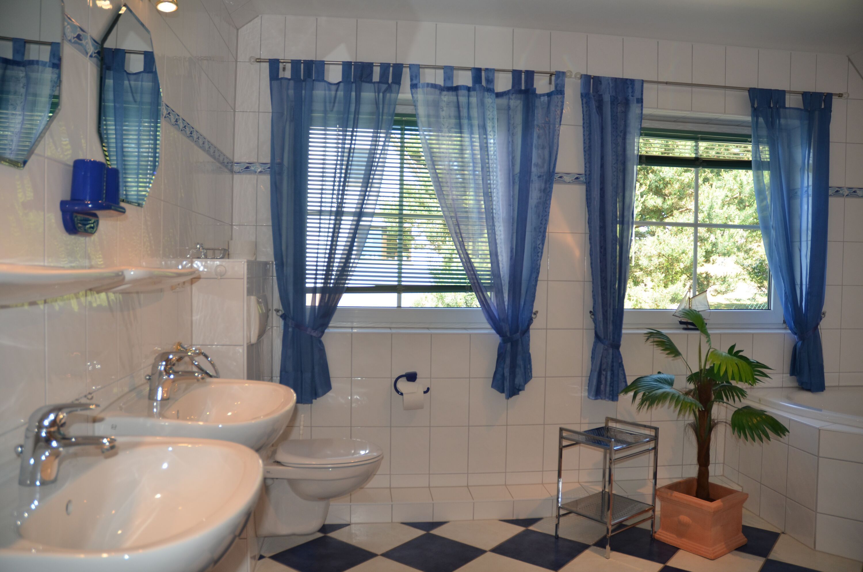 Das Badezimmer ist mit einer Eckbadewanne, einer Dusche, WC und einem Doppelwaschbecken ausgestattet. Außerdem gibt es ein separates Gäste-WC.