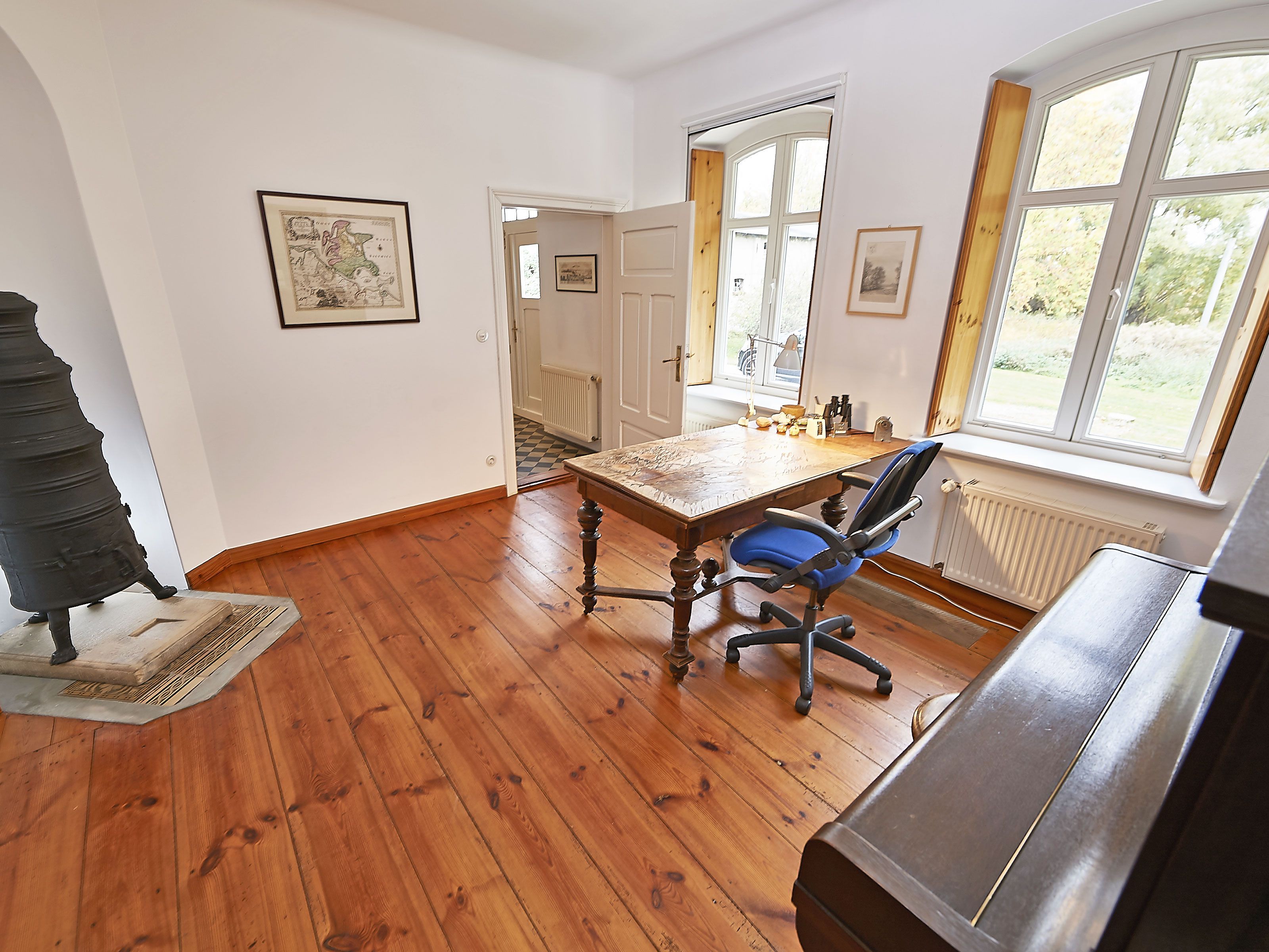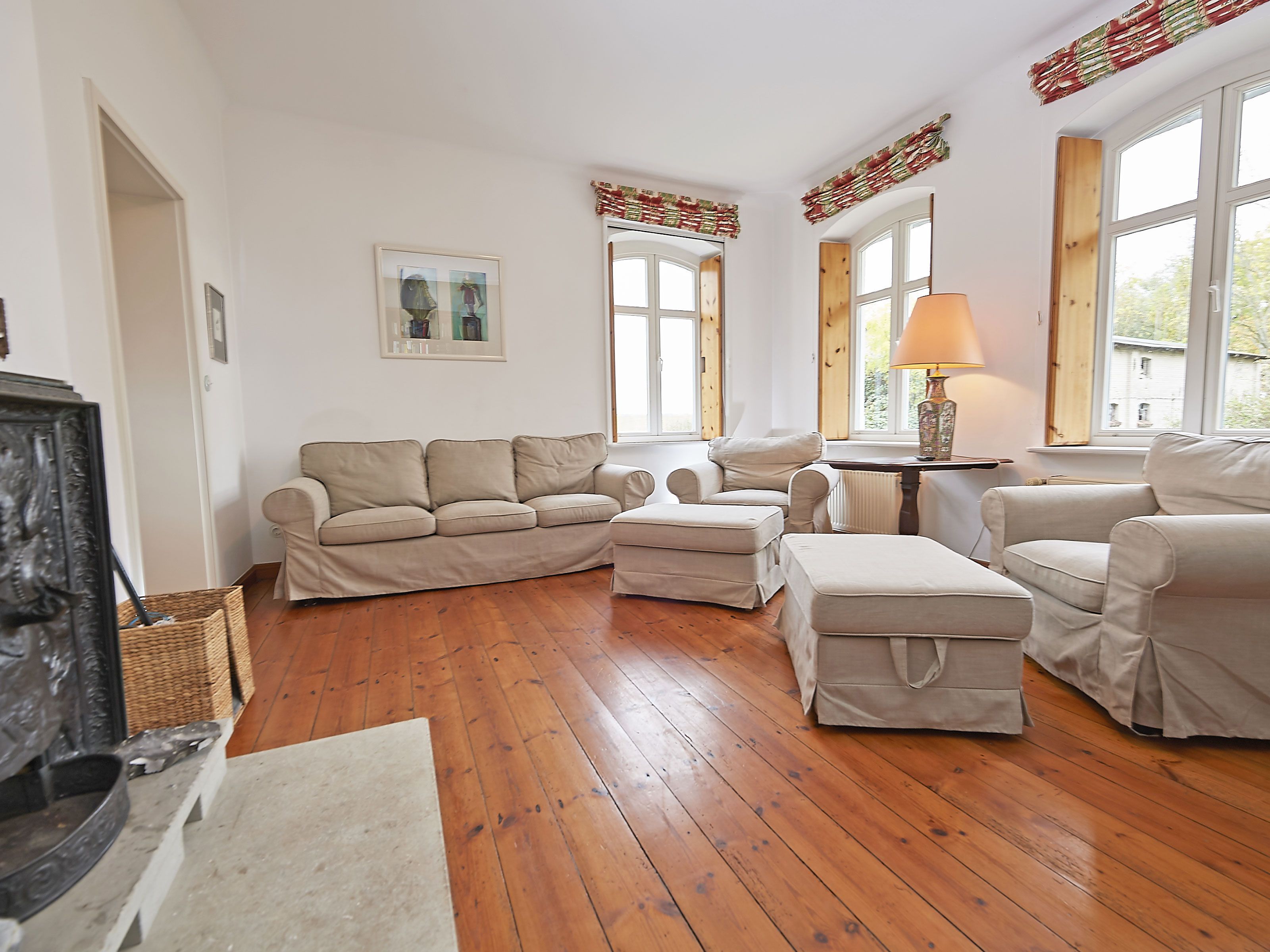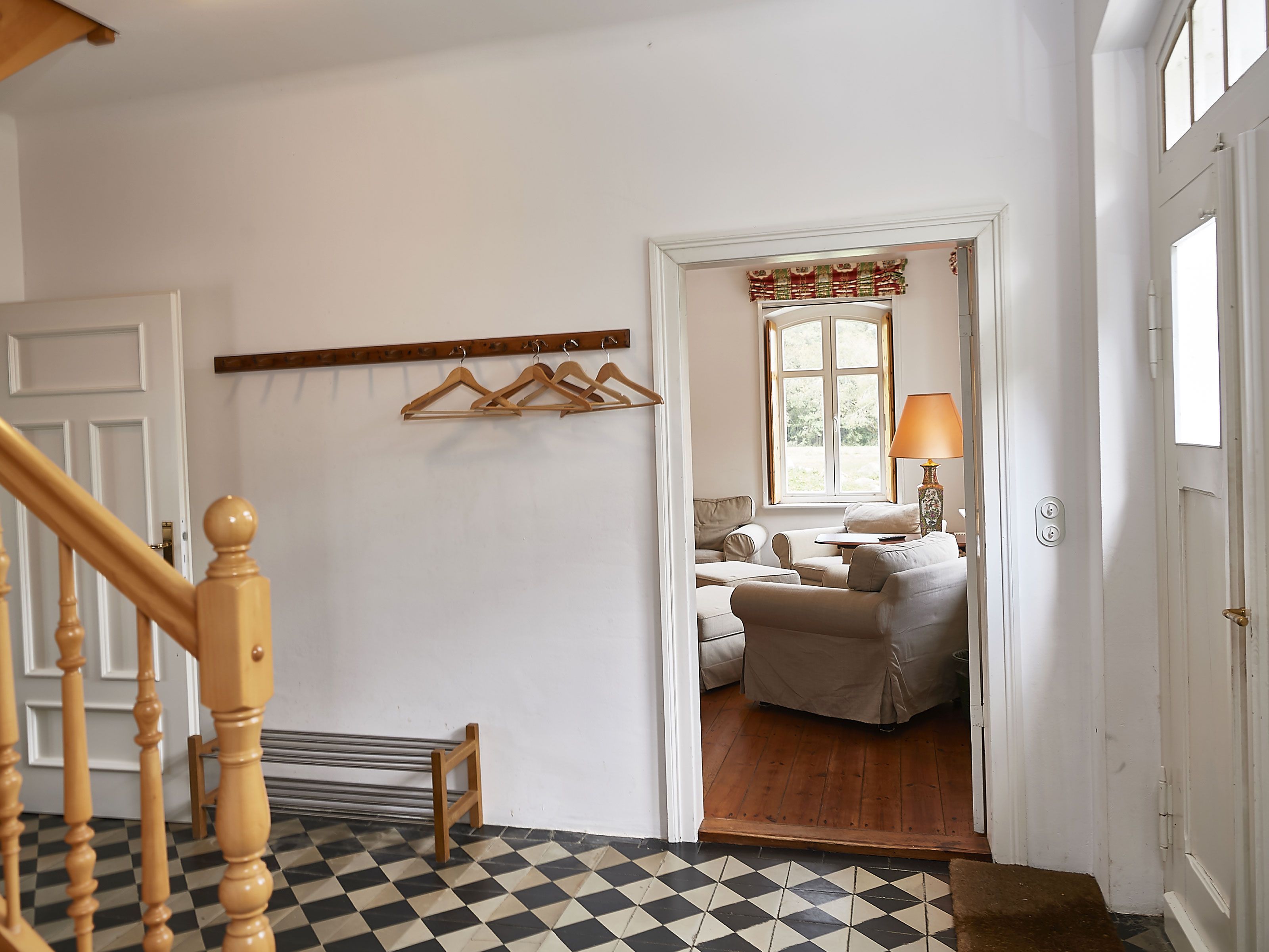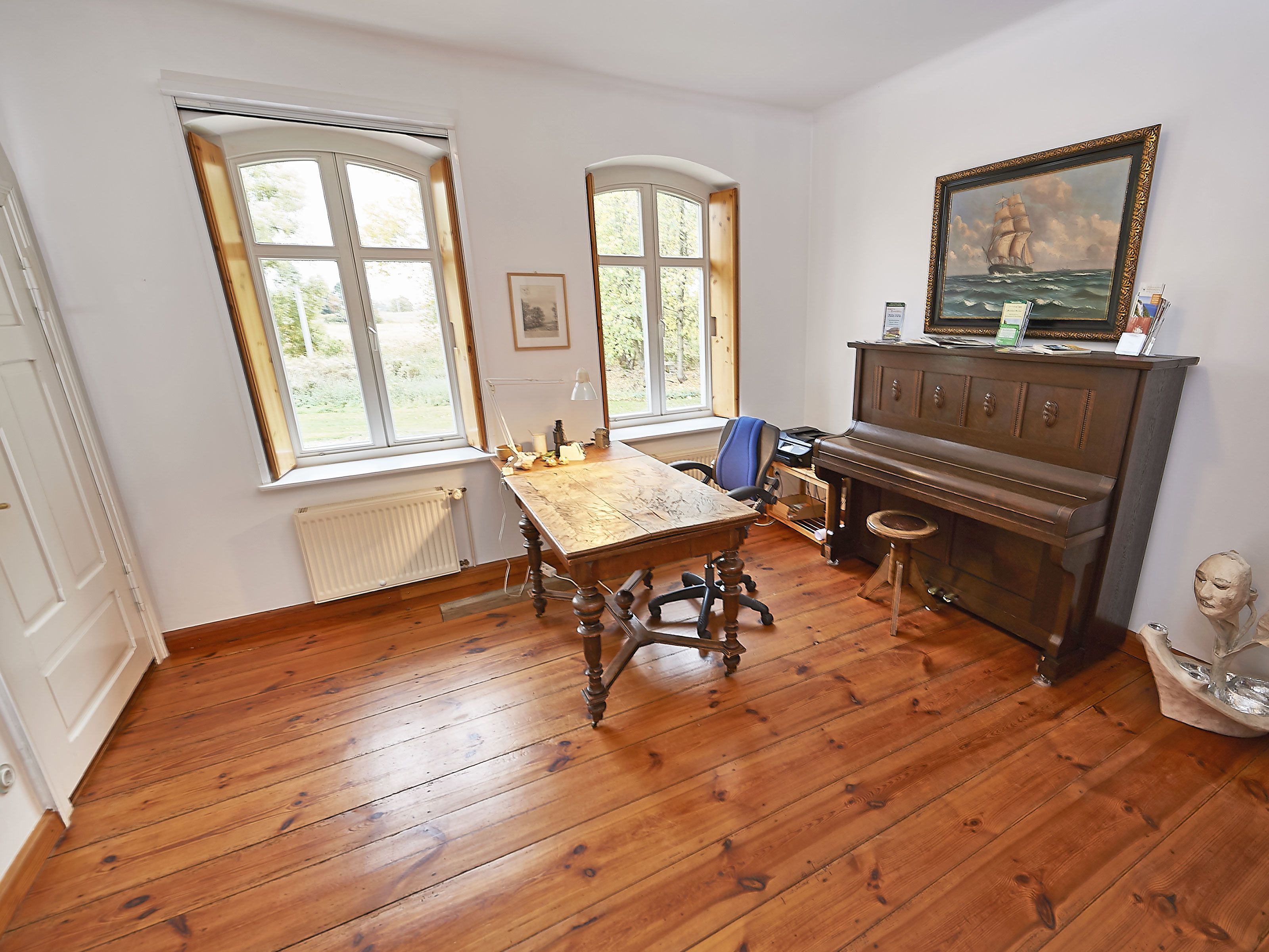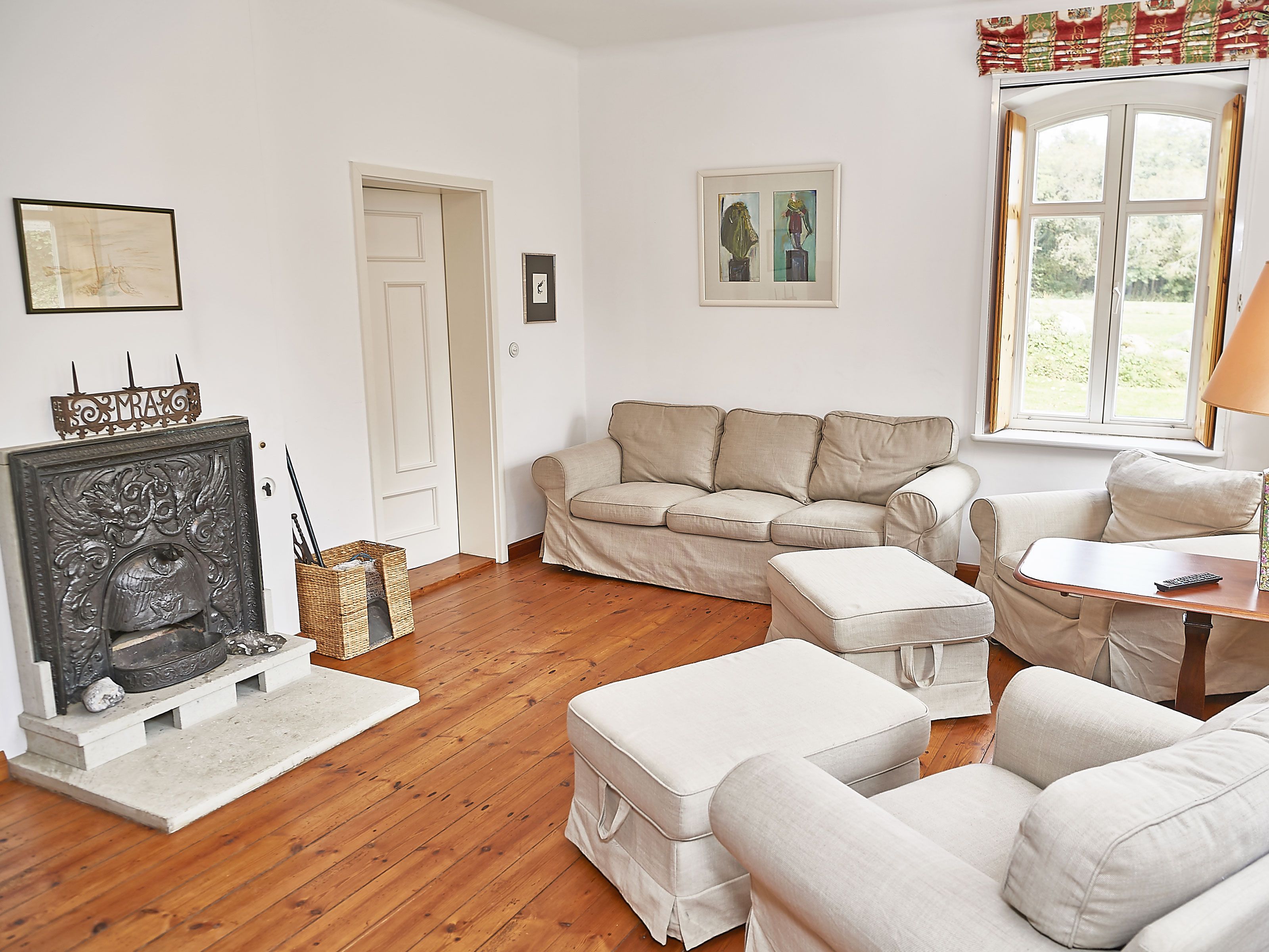 Das Gutshaus verfügt über ca. 220 m² Wohnfläche auf zwei Ebenen. Im Erdgeschoss gibt es ein Wohnzimmer mit gemütlicher Sitzecke, einem Kamin und zwei gemütlichen Ohrensesseln. Ein Esszimmer mit einem großen Esstisch und dem Durchgang zur großzügigen Veranda, die Küche, das Arbeitszimmer mit einem Schreibtisch, einem historischer Kanonenofen und einem Klavier befinden sich ebenfalls im Erdgeschoss. Auch ein Schlafzimmer mit einem Doppelbett, ein Bad mit Badewannen-Duschkombination sowie ein separates WC und einen Hauswirtschaftsraum mit Bügelutensilien und dem Zugang zur möblierten Terrasse sind hier zu finden. Sämtliche Räume dieser Etage sind - wie früher üblich - Durchgangszimmer.