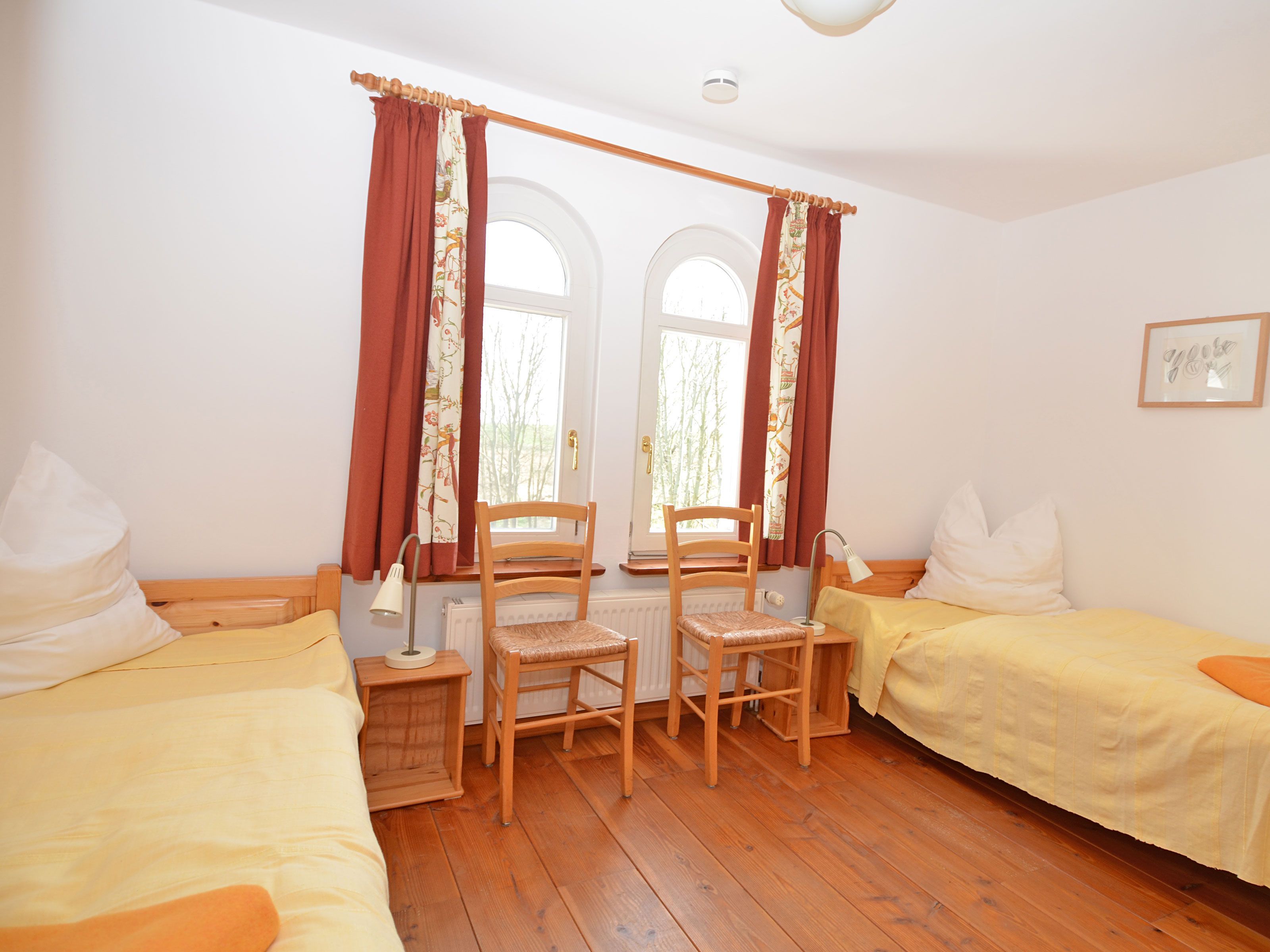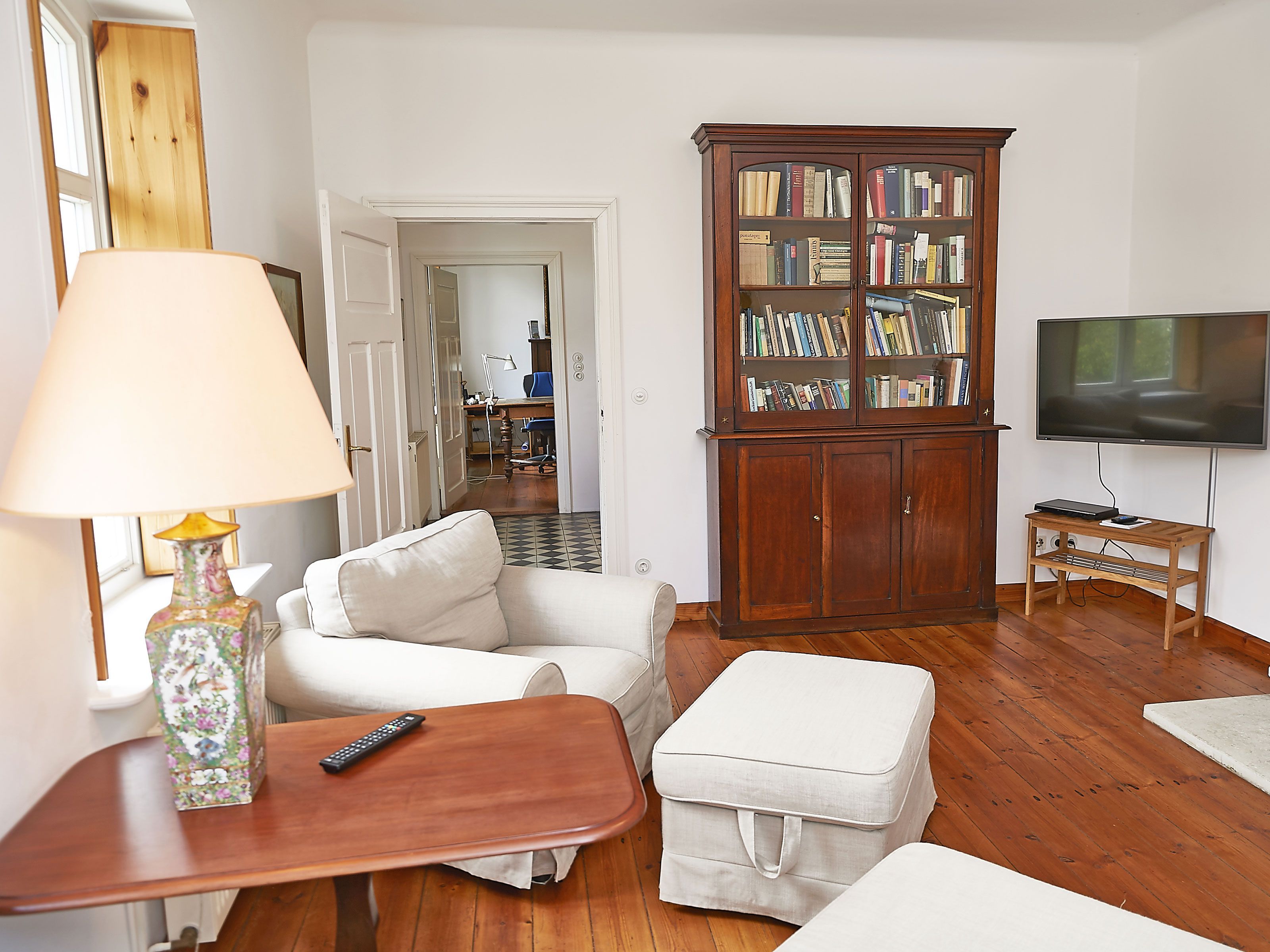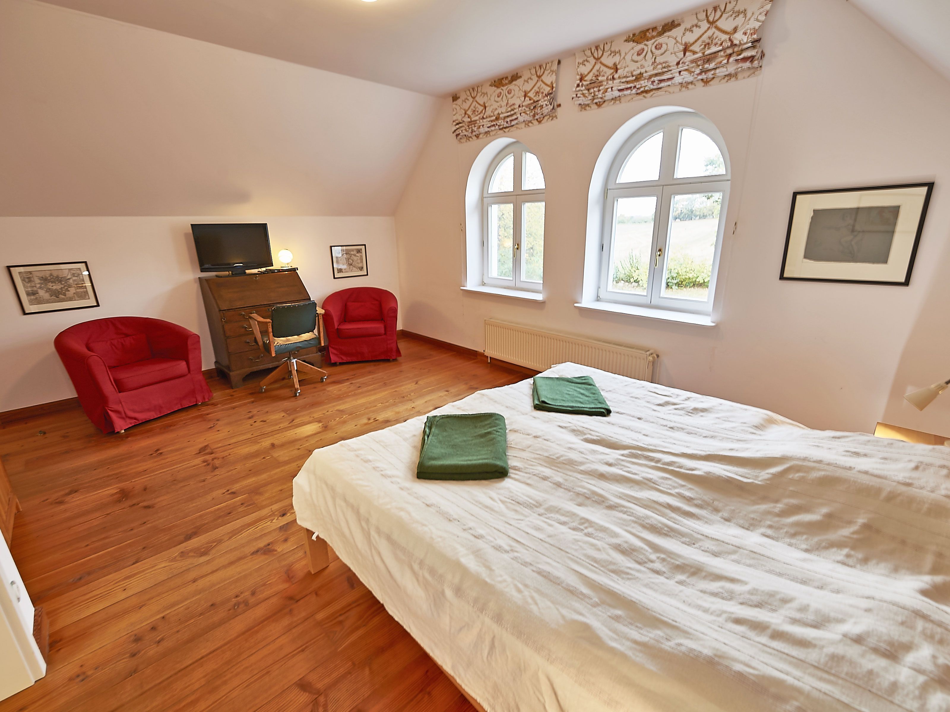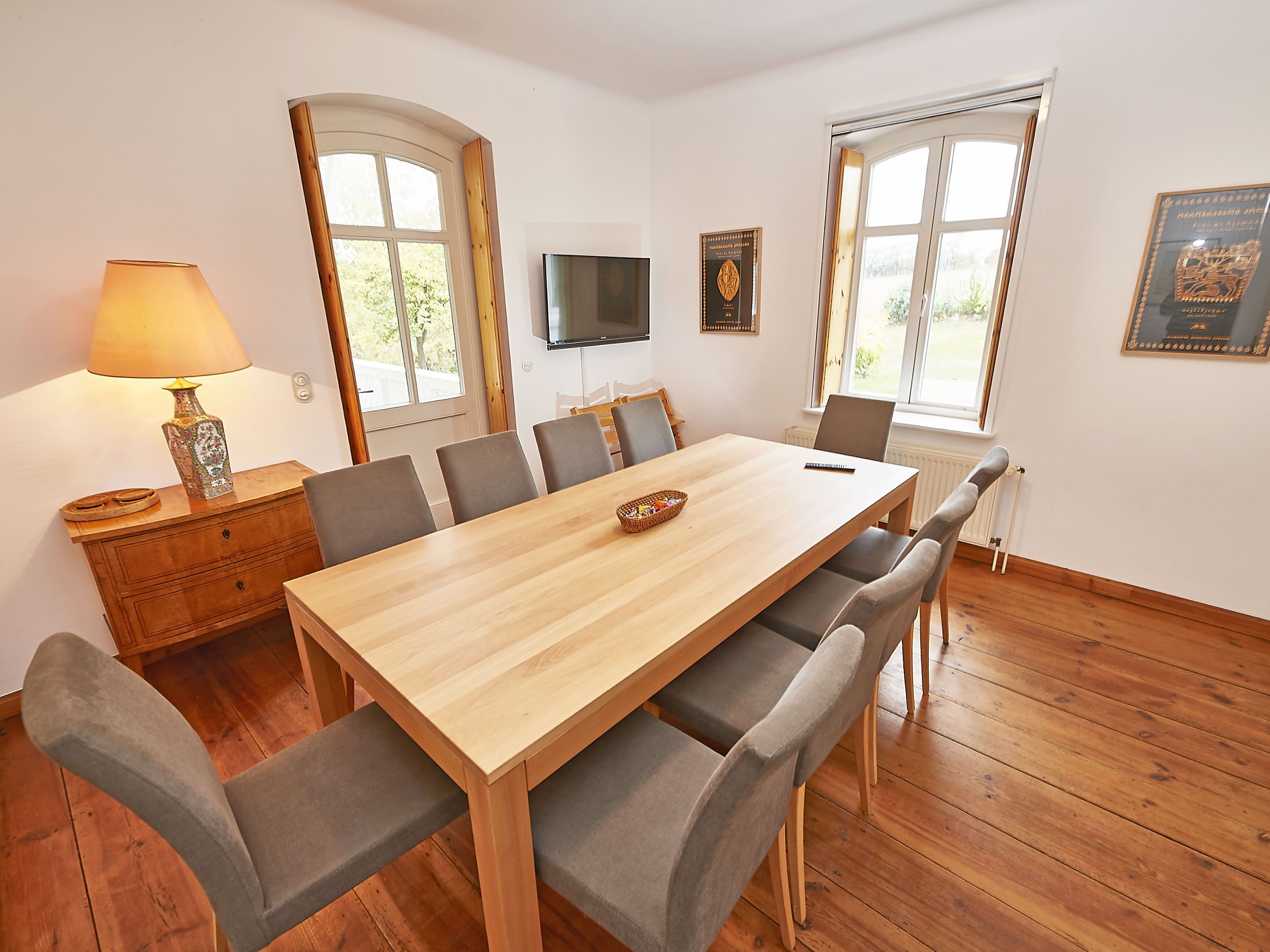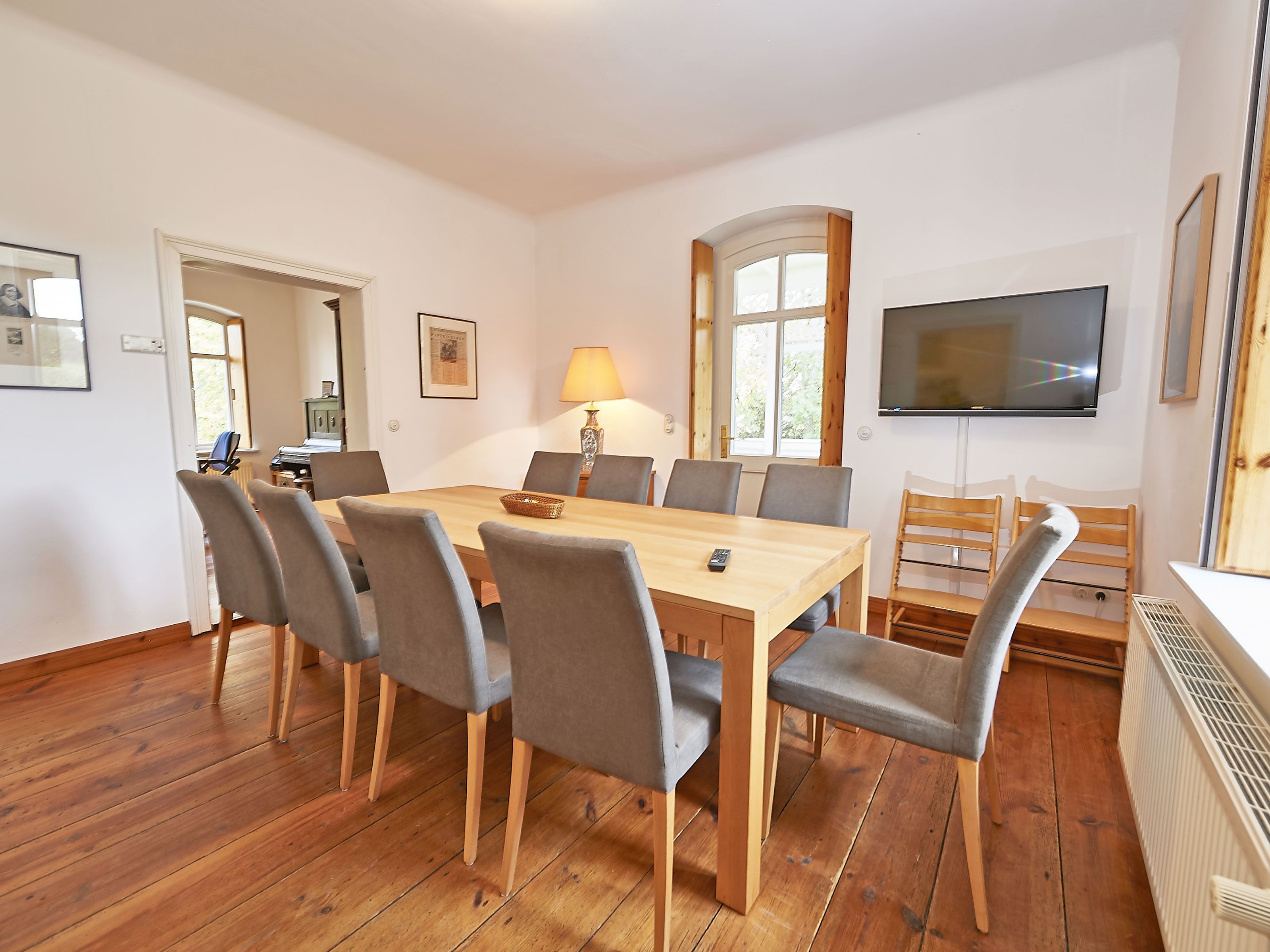 Das Gutshaus verfügt über ca. 220 m² Wohnfläche auf zwei Ebenen. Im Erdgeschoss gibt es ein Wohnzimmer mit gemütlicher Sitzecke, einem Kamin und zwei gemütlichen Ohrensesseln. Ein Esszimmer mit einem großen Esstisch und dem Durchgang zur großzügigen Veranda, die Küche, das Arbeitszimmer mit einem Schreibtisch, einem historischer Kanonenofen und einem Klavier befinden sich ebenfalls im Erdgeschoss. Auch ein Schlafzimmer mit einem Doppelbett, ein Bad mit Badewannen-Duschkombination sowie ein separates WC und einen Hauswirtschaftsraum mit Bügelutensilien und dem Zugang zur möblierten Terrasse sind hier zu finden. Sämtliche Räume dieser Etage sind - wie früher üblich - Durchgangszimmer.