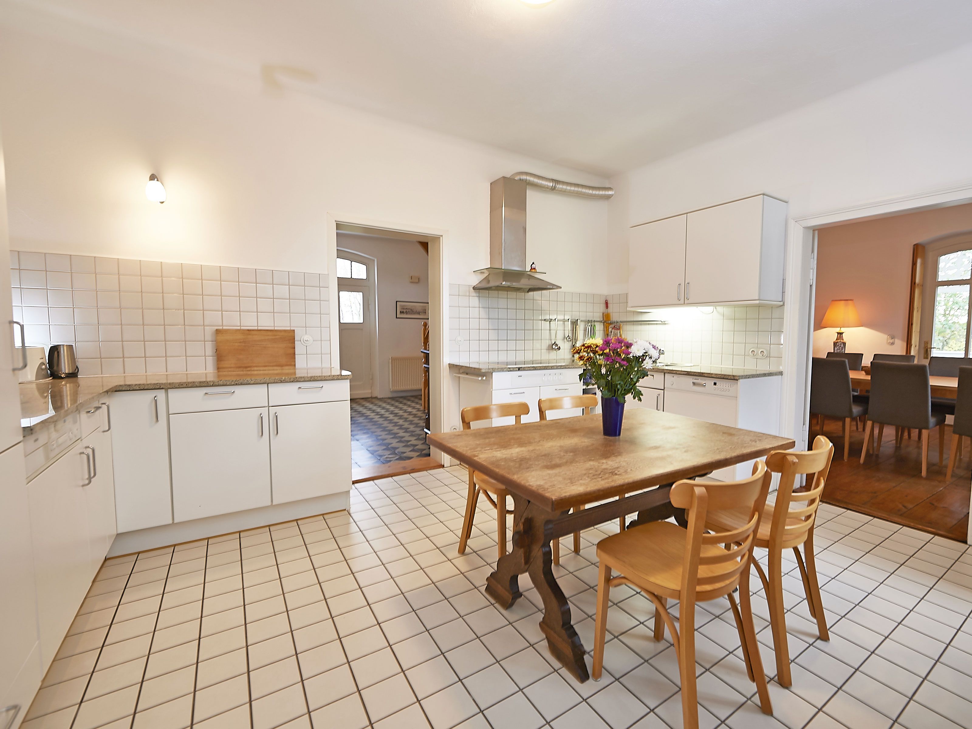 Die Küche ist komplett ausgestattet mit einem Herd mit Cerankochfeld, einer Tiefkühltruhe, Waschmaschine, Backofen, Kühlschrank, Spülmaschine, Mikrowelle, Kaffeemaschine, Toaster, Wasserkocher und diversem Kleininventar, das die Ausstattung komplettiert.
