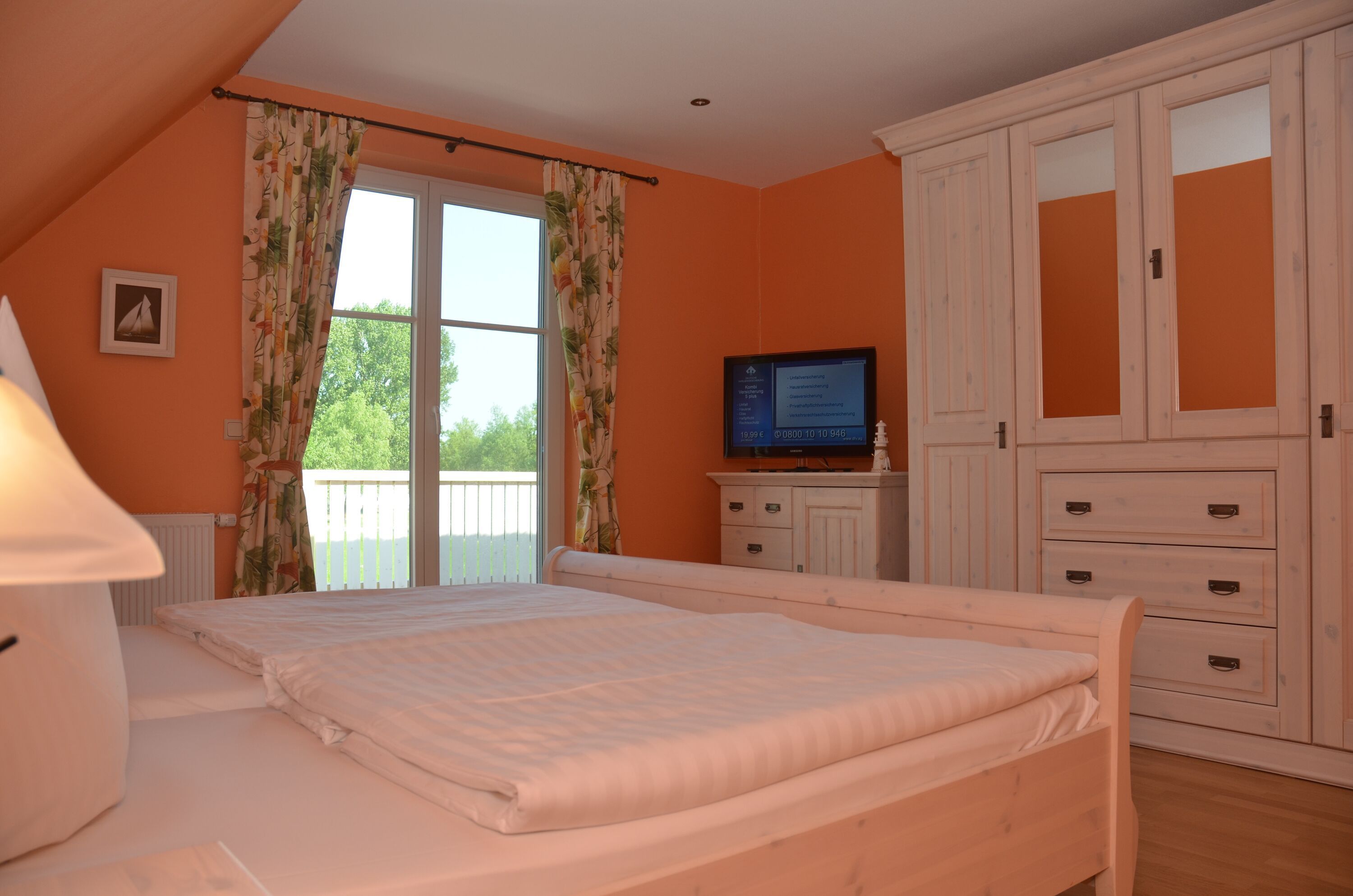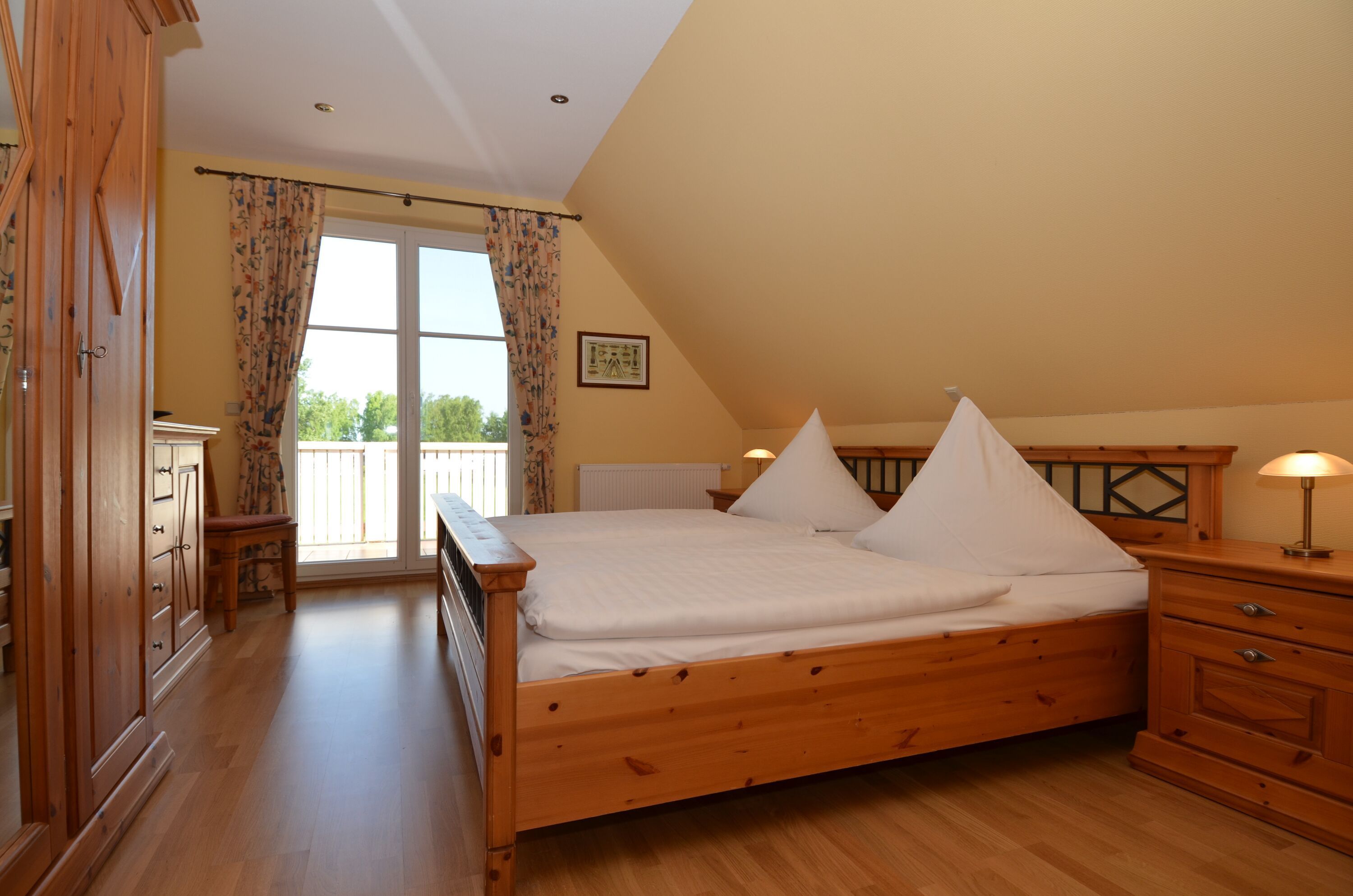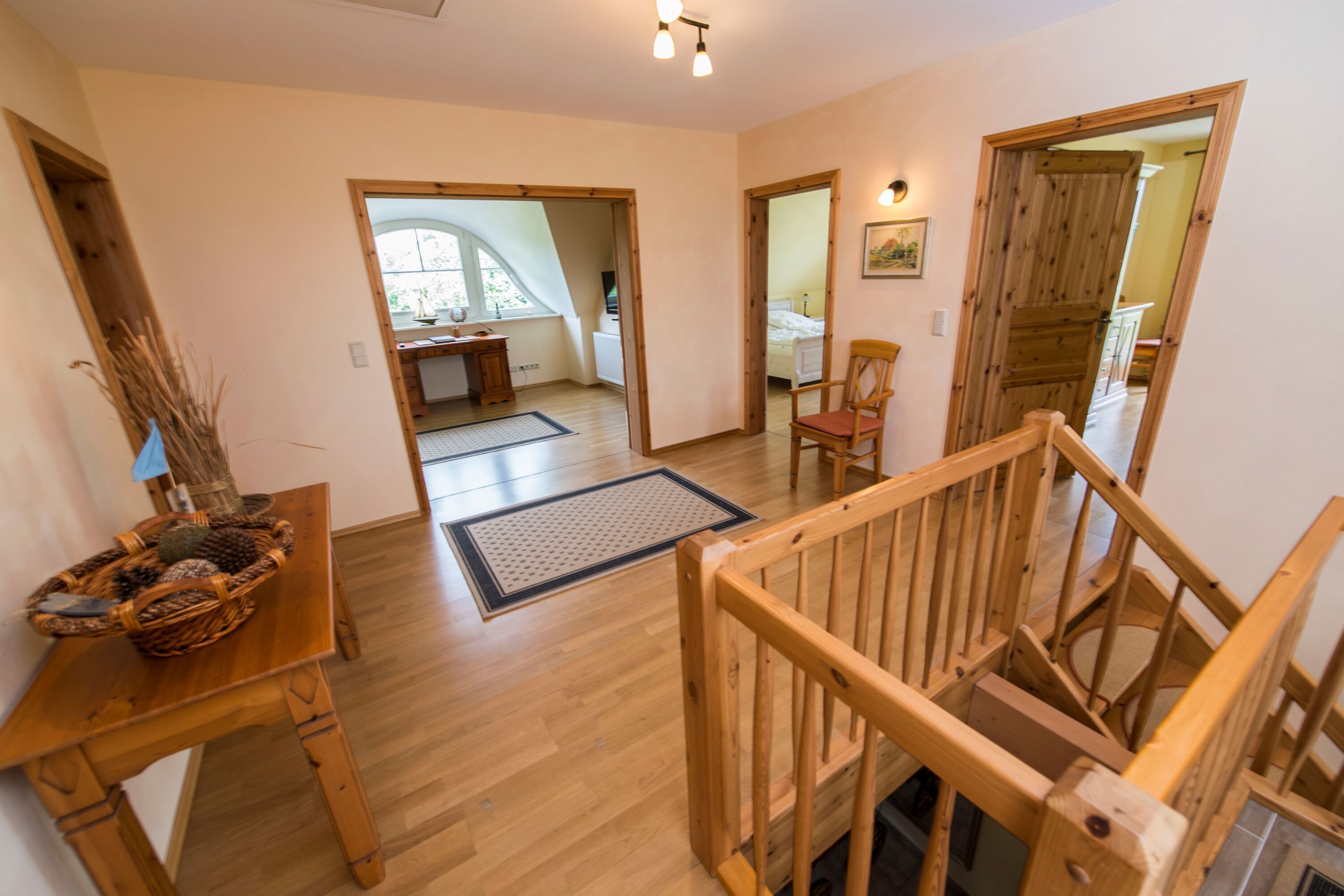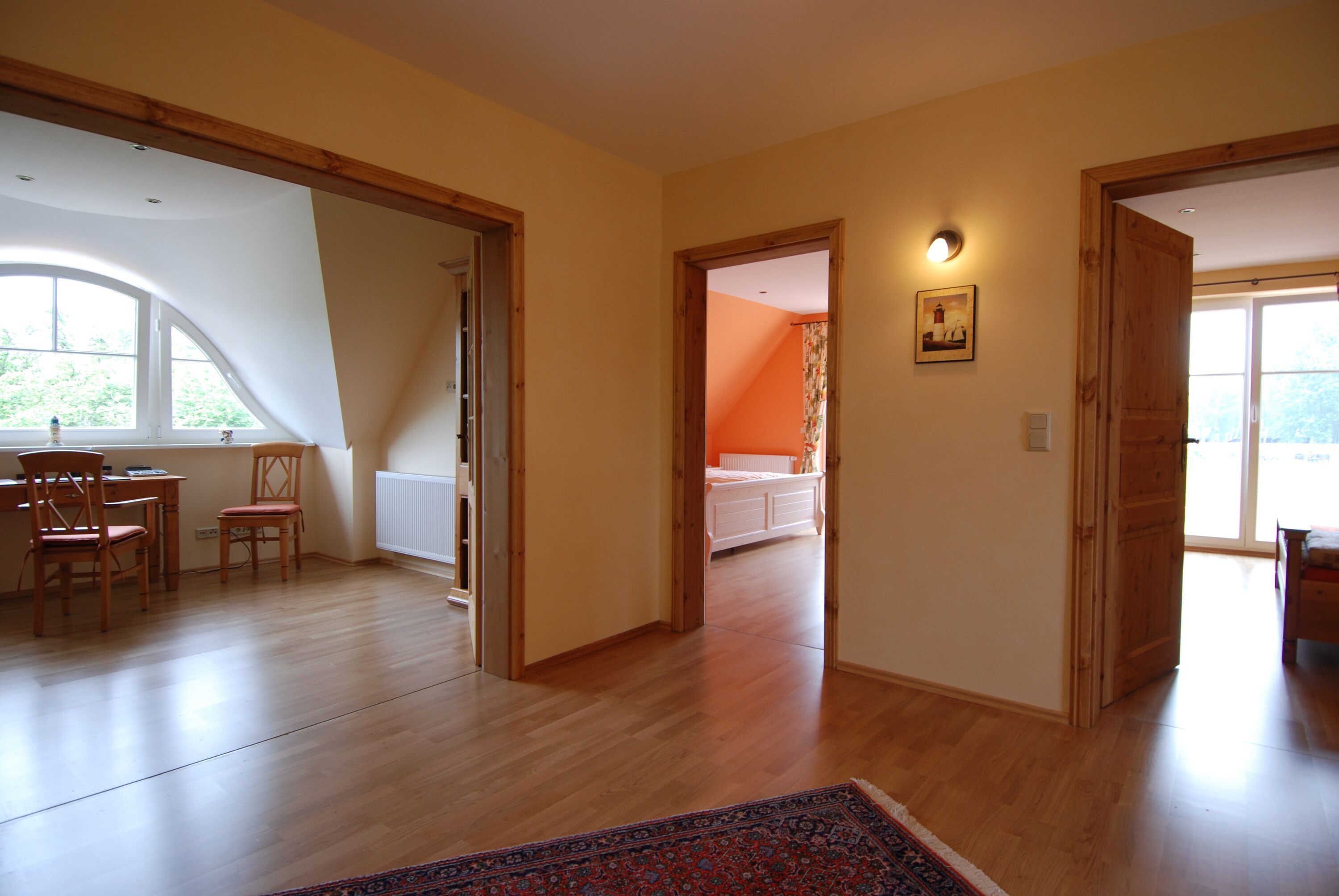 In dem mit Parkett versehenen Obergeschoss finden Sie drei Schlafzimmer mit je einem Doppelbett (mit jeweils einer Matratze im Härtegrad 2 und 3) und je einen Fernseher. Zwei der Schlafzimmer haben einen Zugang zum Balkon mit wunderschönem Boddenblick. Ein helles Büro mit Schreibtisch, einer kleinen Bibliothek und einer Couch für gemütliche Stunden vor einem weiteren TV steht im OG ebenfalls zur Verfügung. Es gibt desweiteren einen W-LAN-Internetanschluss und ein Telefon (nur Gespräche ins dt. Festnetz) zur kostenfreien Nutzung.