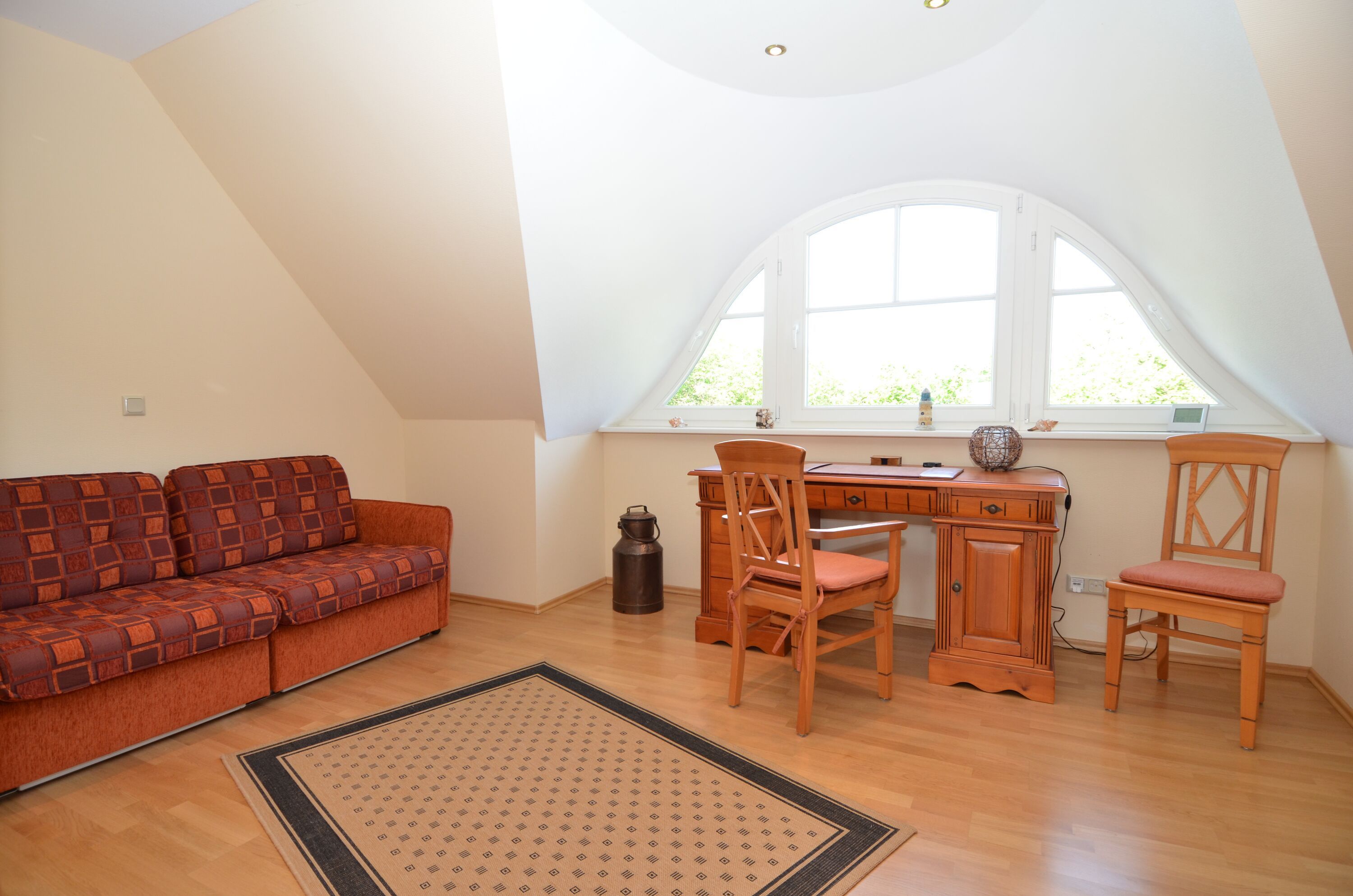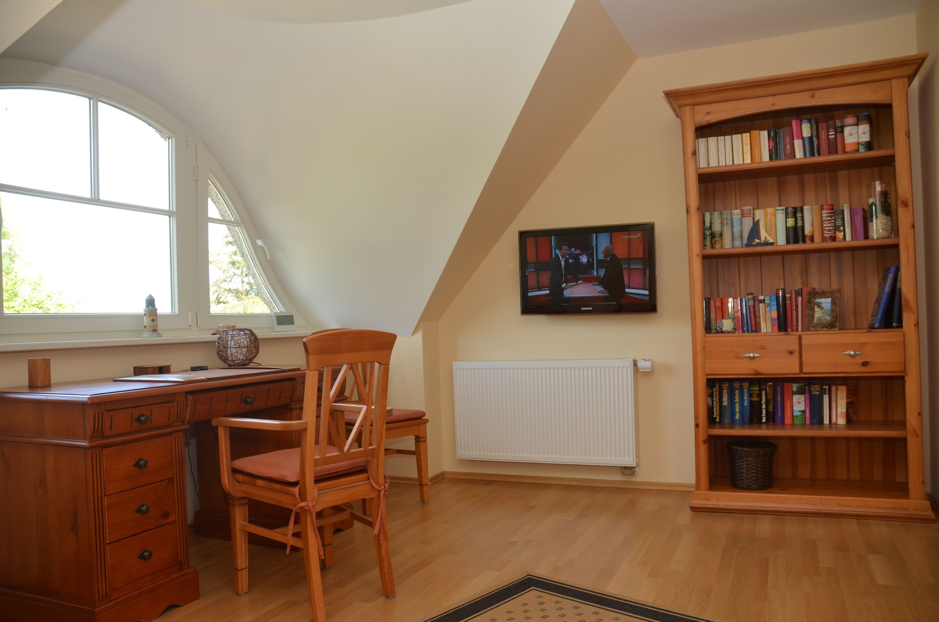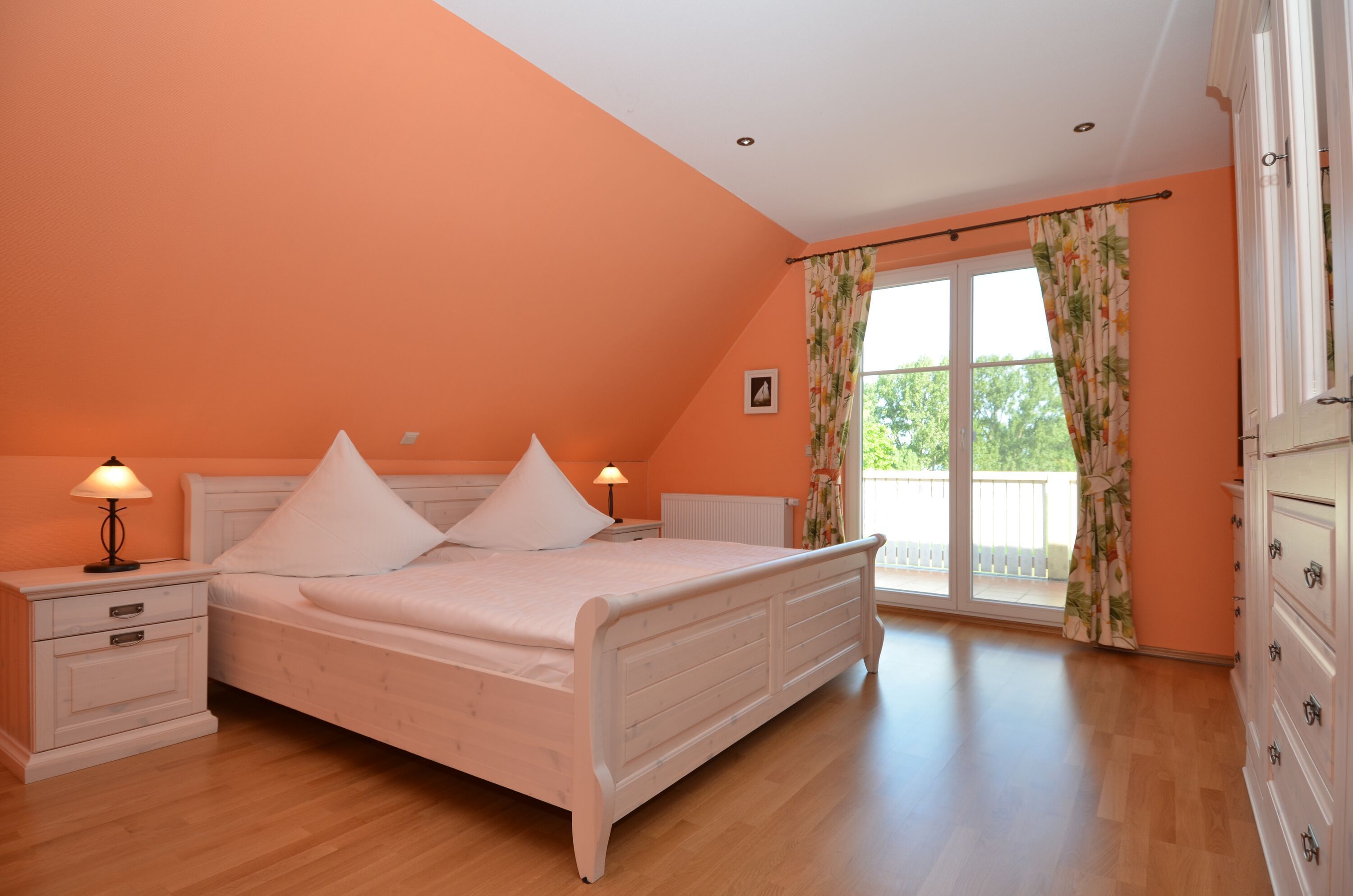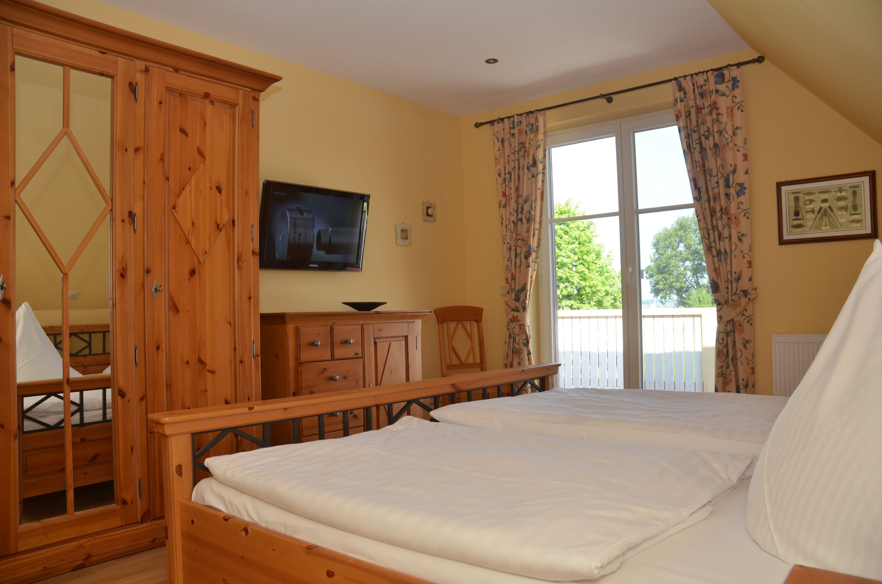 In dem mit Parkett versehenen Obergeschoss finden Sie drei Schlafzimmer mit je einem Doppelbett (mit jeweils einer Matratze im Härtegrad 2 und 3) und je einen Fernseher. Zwei der Schlafzimmer haben einen Zugang zum Balkon mit wunderschönem Boddenblick. Ein helles Büro mit Schreibtisch, einer kleinen Bibliothek und einer Couch für gemütliche Stunden vor einem weiteren TV steht im OG ebenfalls zur Verfügung. Es gibt desweiteren einen W-LAN-Internetanschluss und ein Telefon (nur Gespräche ins dt. Festnetz) zur kostenfreien Nutzung.