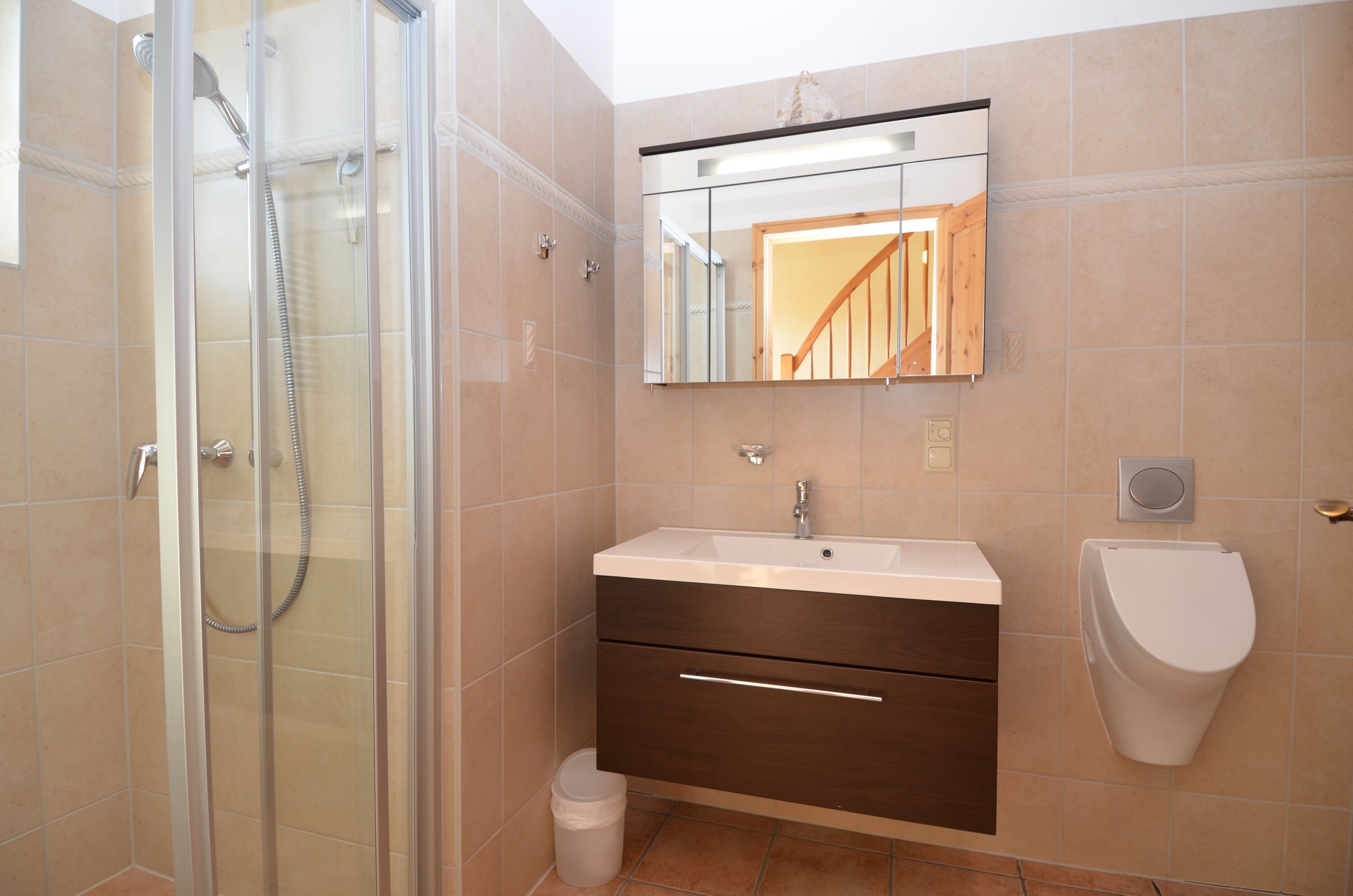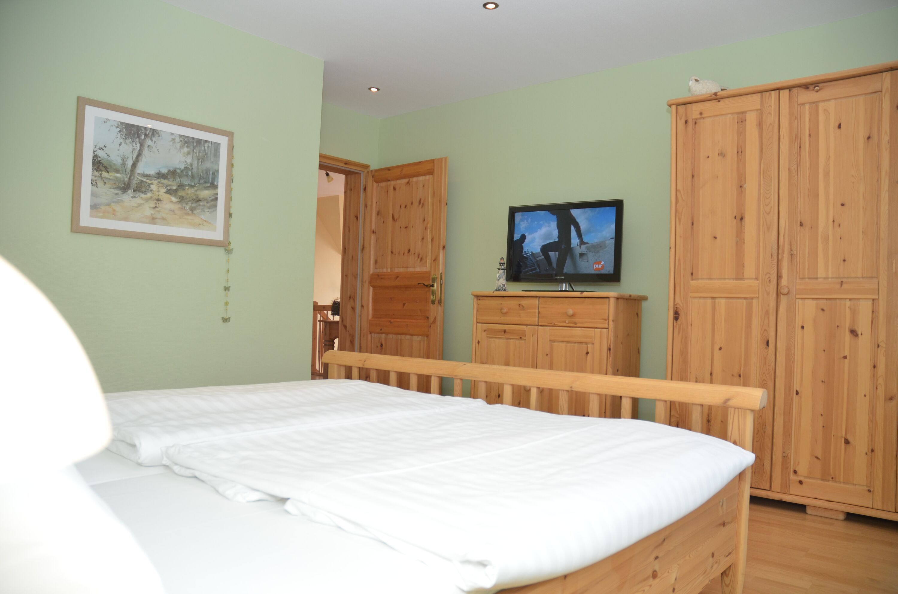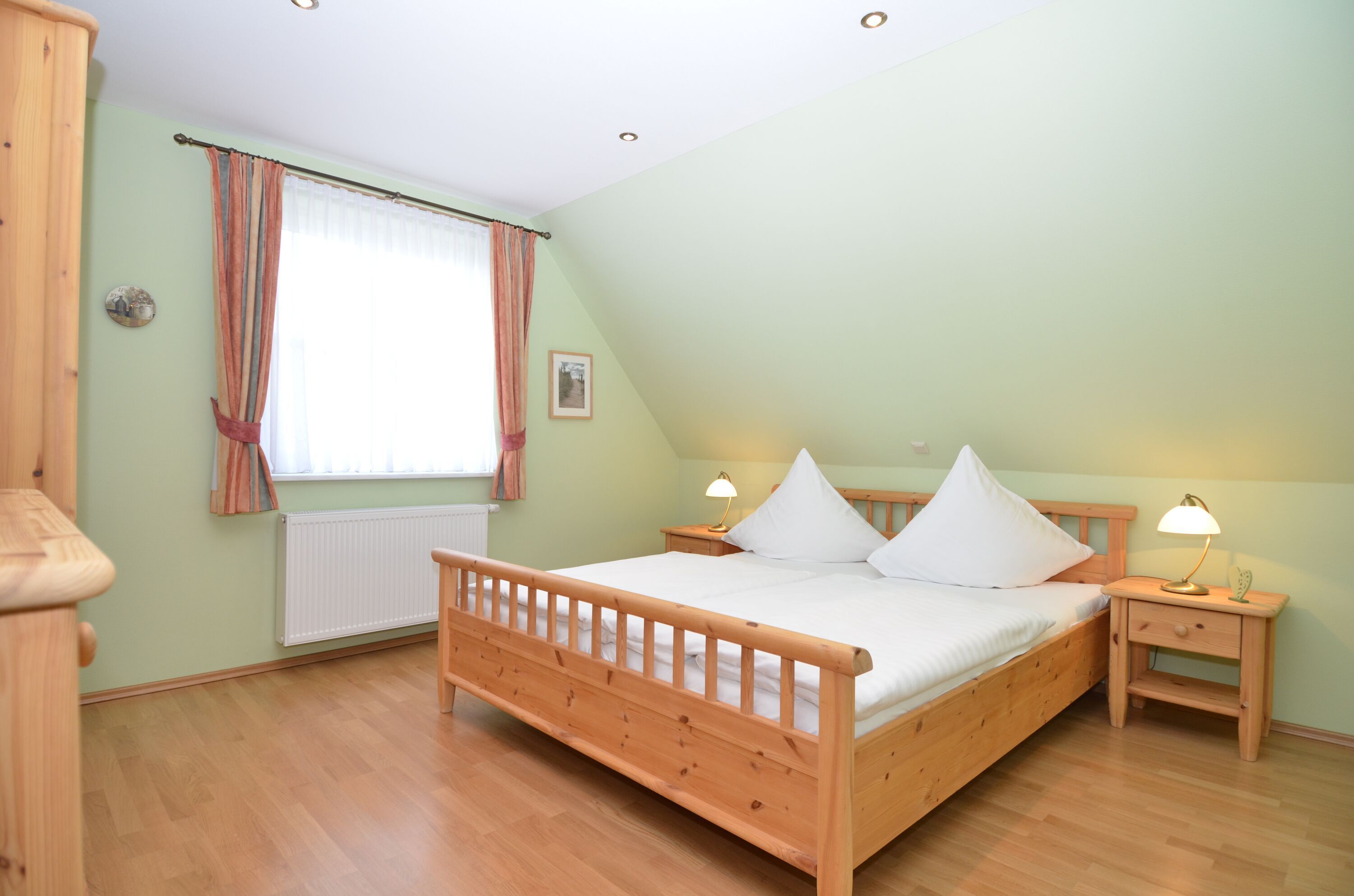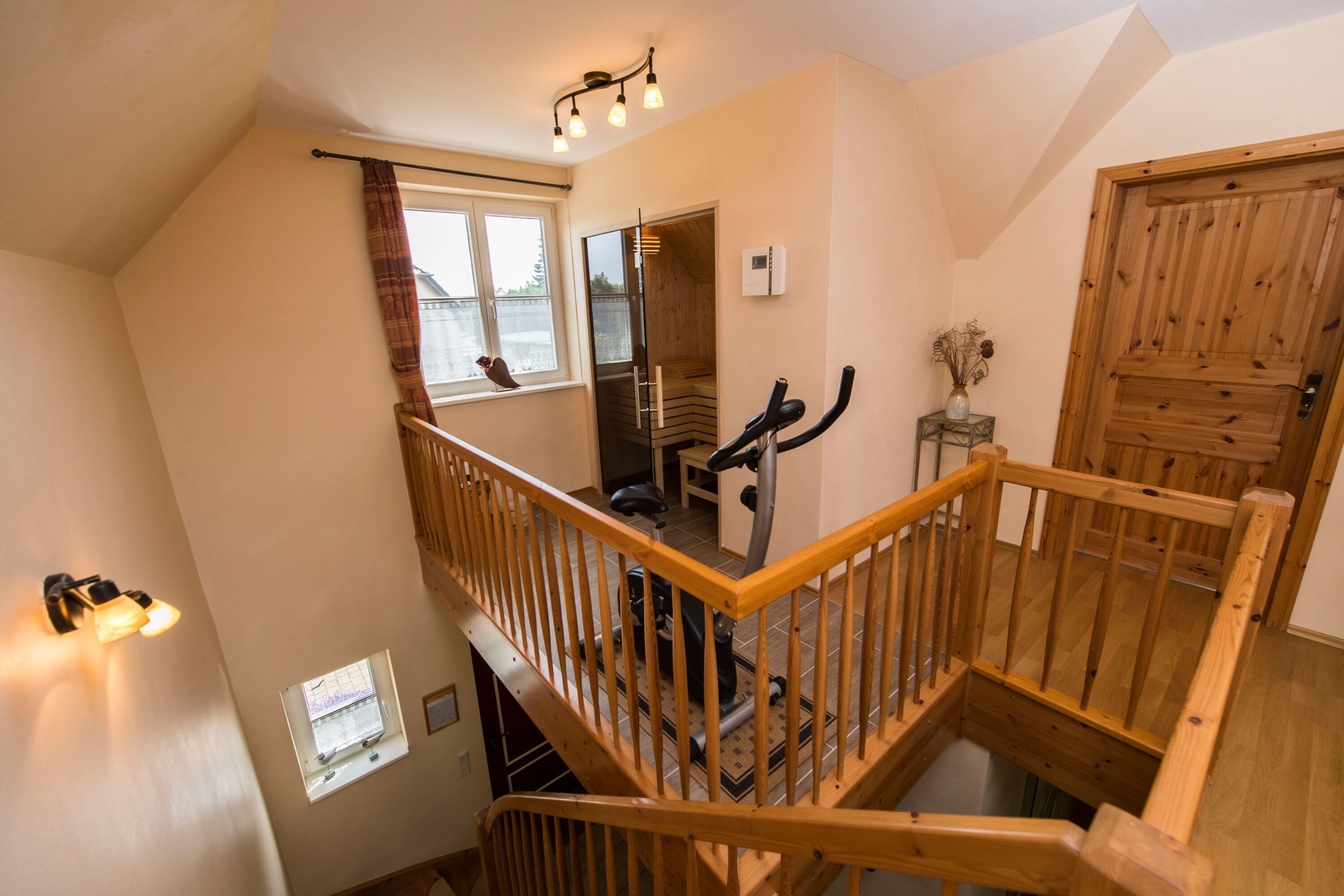 In dem mit Parkett versehenen Obergeschoss finden Sie drei Schlafzimmer mit je einem Doppelbett (mit jeweils einer Matratze im Härtegrad 2 und 3) und je einen Fernseher. Zwei der Schlafzimmer haben einen Zugang zum Balkon mit wunderschönem Boddenblick. Ein helles Büro mit Schreibtisch, einer kleinen Bibliothek und einer Couch für gemütliche Stunden vor einem weiteren TV steht im OG ebenfalls zur Verfügung. Es gibt desweiteren einen W-LAN-Internetanschluss und ein Telefon (nur Gespräche ins dt. Festnetz) zur kostenfreien Nutzung.