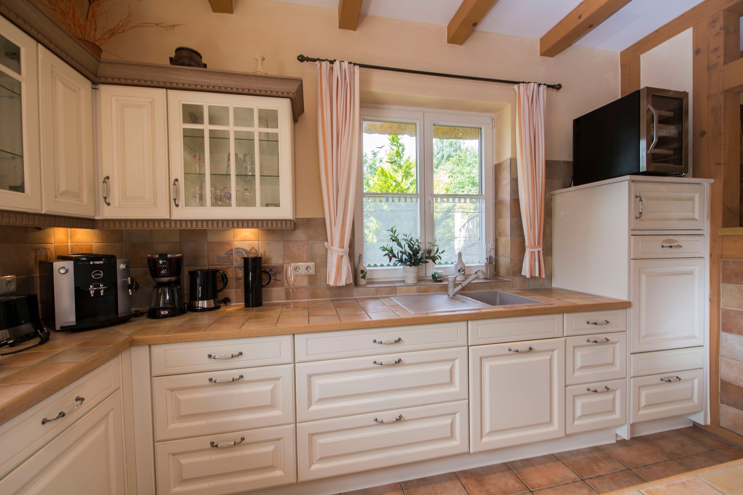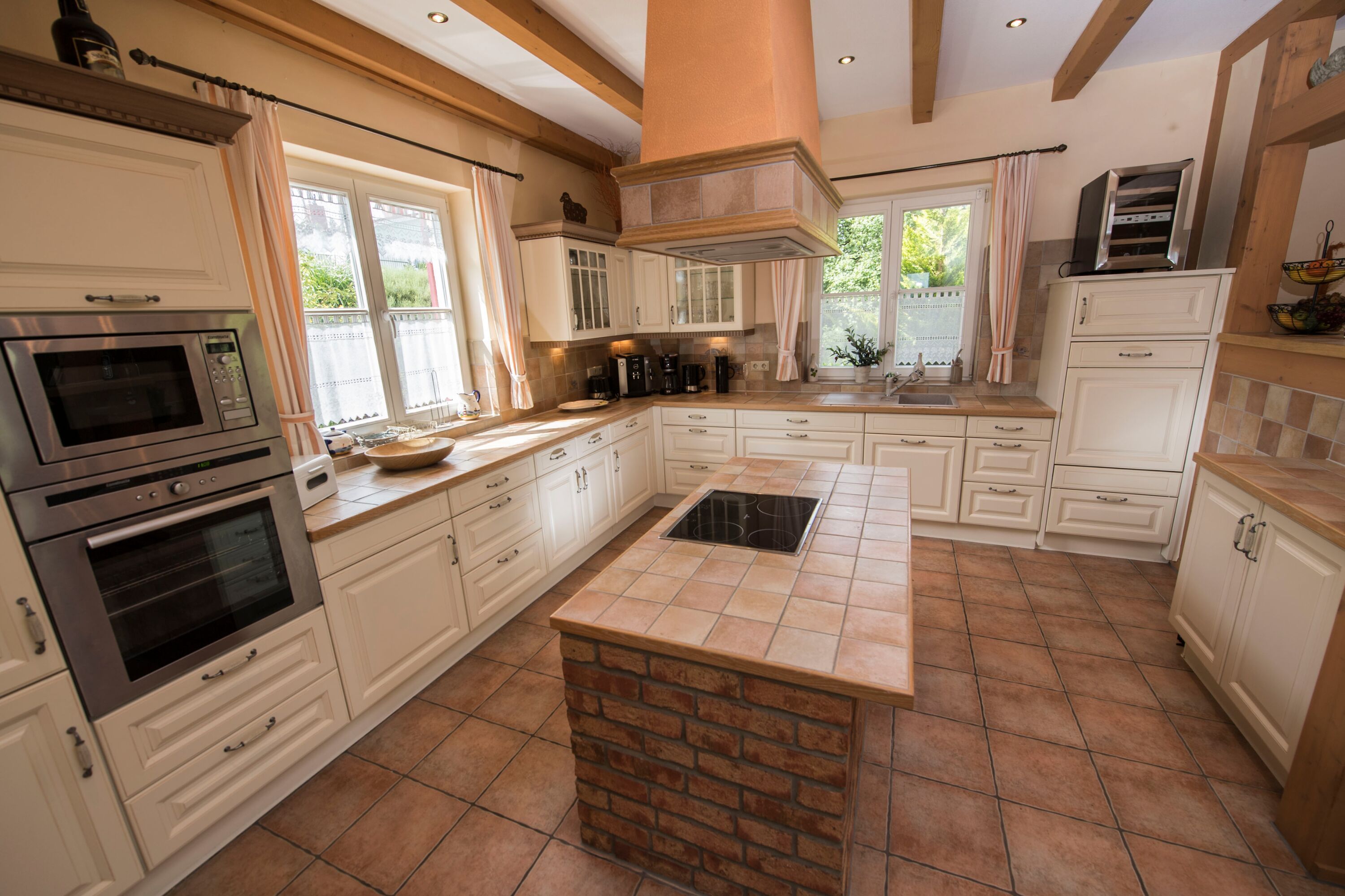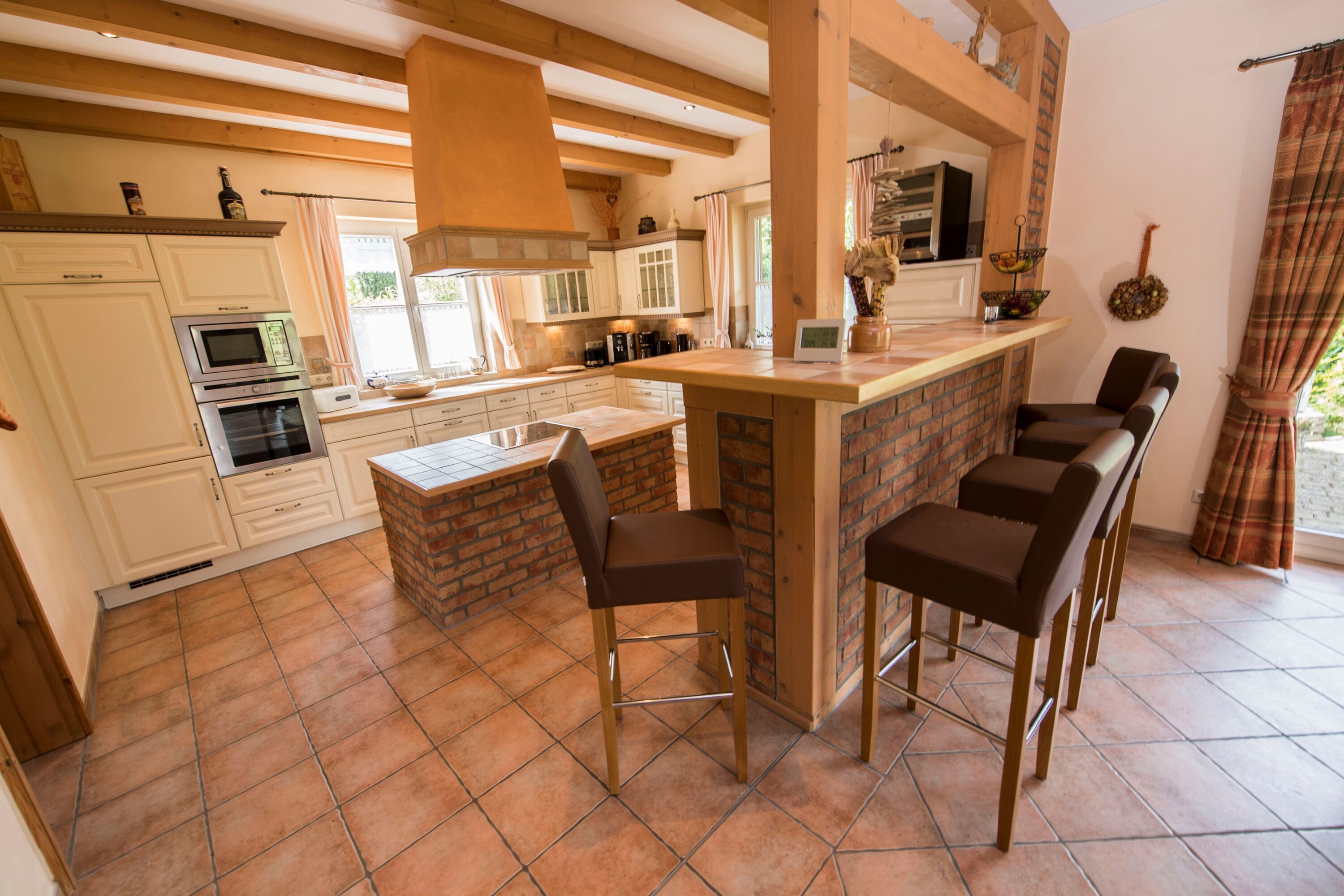 Die Einrichtung im Landhausstil wird auch in der offenen Küche weitergeführt. Diese ist durch eine halbhohe Fachwerkbalkenwand dezent vom Essbereich getrennt. In der erstklassig ausgestatteten Küche mit einer Kochinsel mit 4-Platten-Cerankochfeld und viel Arbeitsfläche finden Sie auch einen Jura-Kaffeeautomaten mit Kaffeebohnen für den 1. Urlaubsmorgen, einen Backofen, eine Geschirrspülmaschine, eine Mikrowelle, Barhocker, einen Weinkühlschrank sowie diverses Kleininventar, das die Küchenausstattung komplettiert. Direkt an die Küche angeschlossen befindet sich der Hauswirtschaftsraum mit Waschmaschine, Trockner, Bügelbrett und Bügeleisen.
