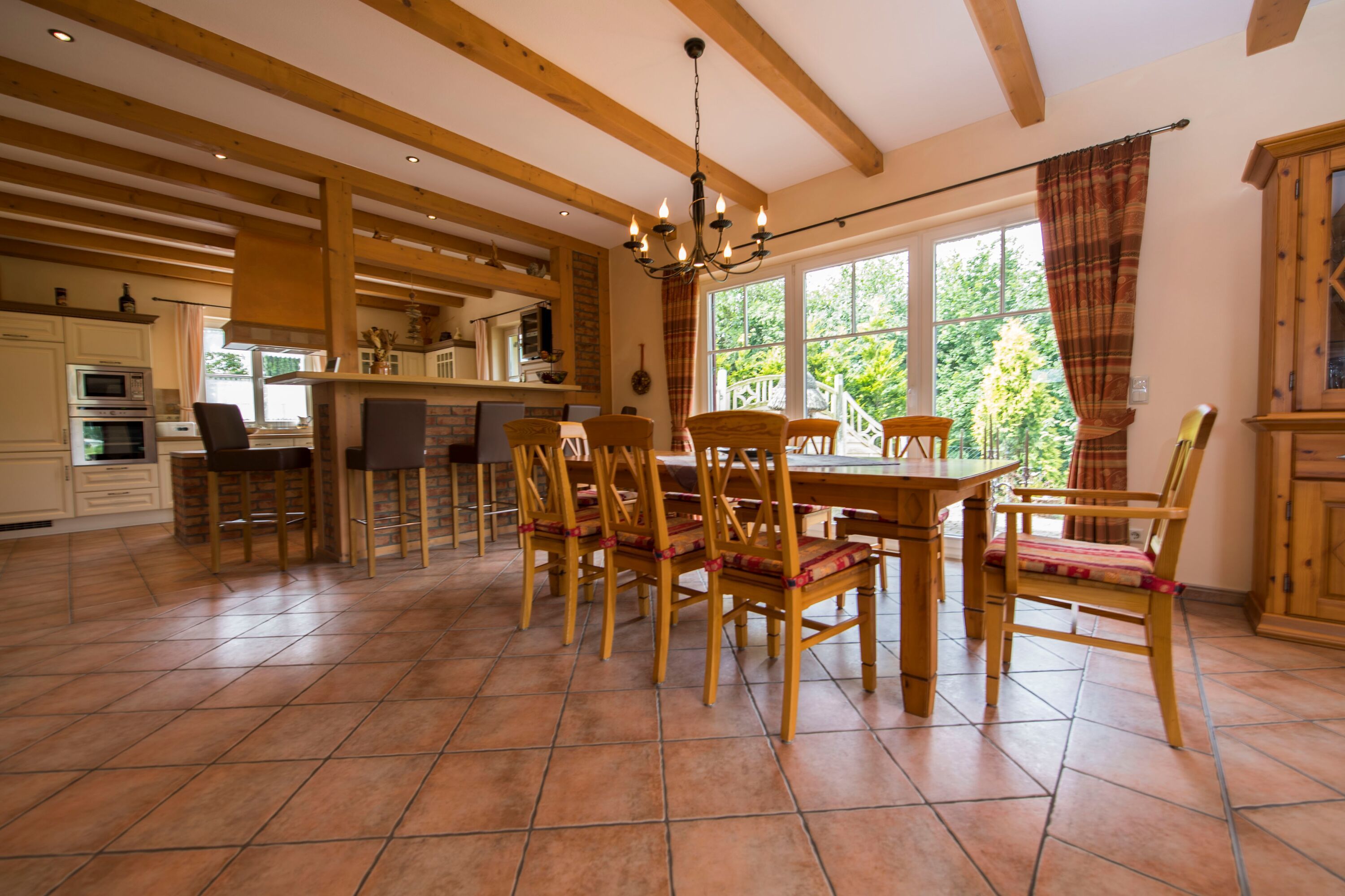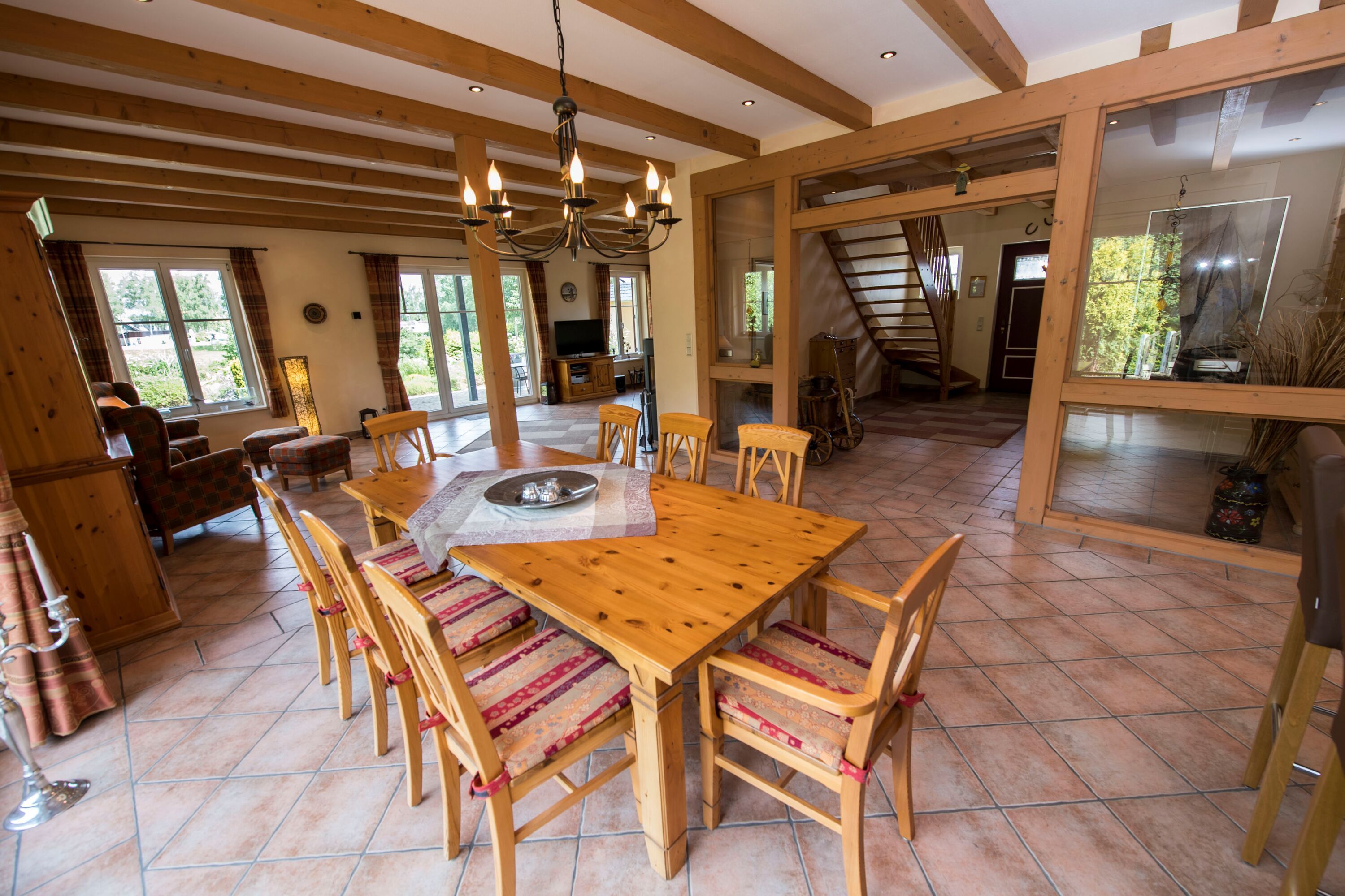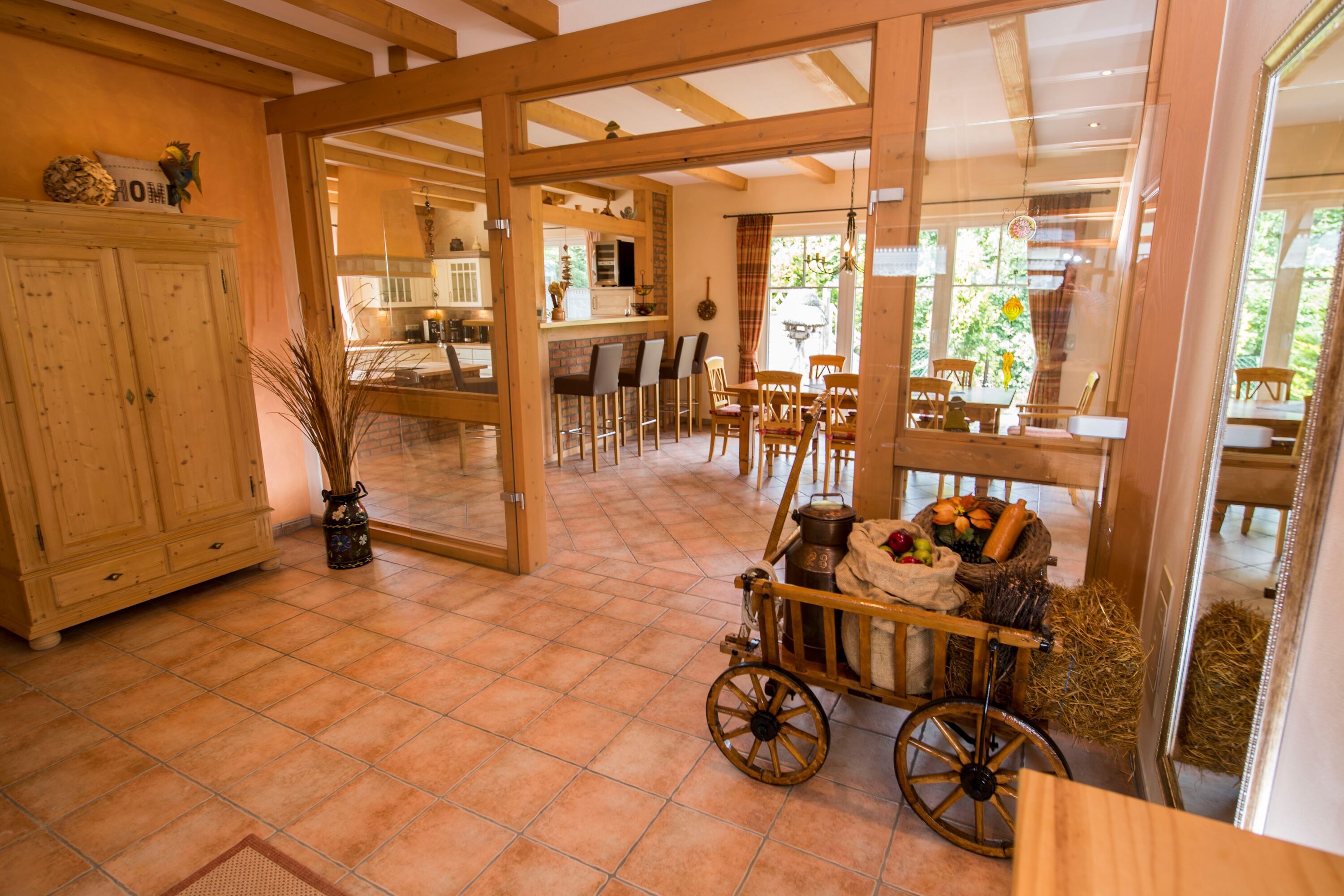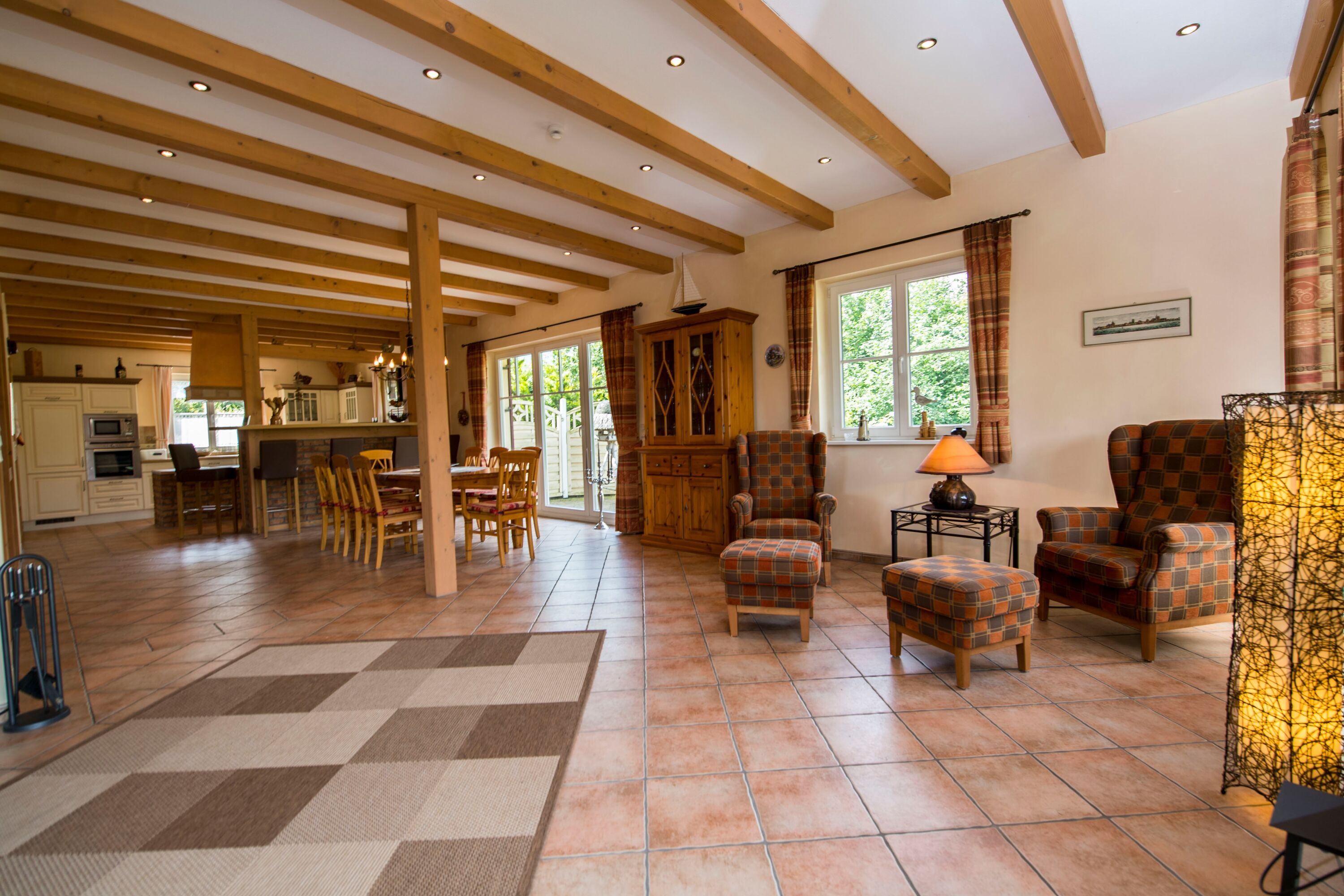 Die Einrichtung im Landhausstil wird auch in der offenen Küche weitergeführt. Diese ist durch eine halbhohe Fachwerkbalkenwand dezent vom Essbereich getrennt. In der erstklassig ausgestatteten Küche mit einer Kochinsel mit 4-Platten-Cerankochfeld und viel Arbeitsfläche finden Sie auch einen Jura-Kaffeeautomaten mit Kaffeebohnen für den 1. Urlaubsmorgen, einen Backofen, eine Geschirrspülmaschine, eine Mikrowelle, Barhocker, einen Weinkühlschrank sowie diverses Kleininventar, das die Küchenausstattung komplettiert. Direkt an die Küche angeschlossen befindet sich der Hauswirtschaftsraum mit Waschmaschine, Trockner, Bügelbrett und Bügeleisen.