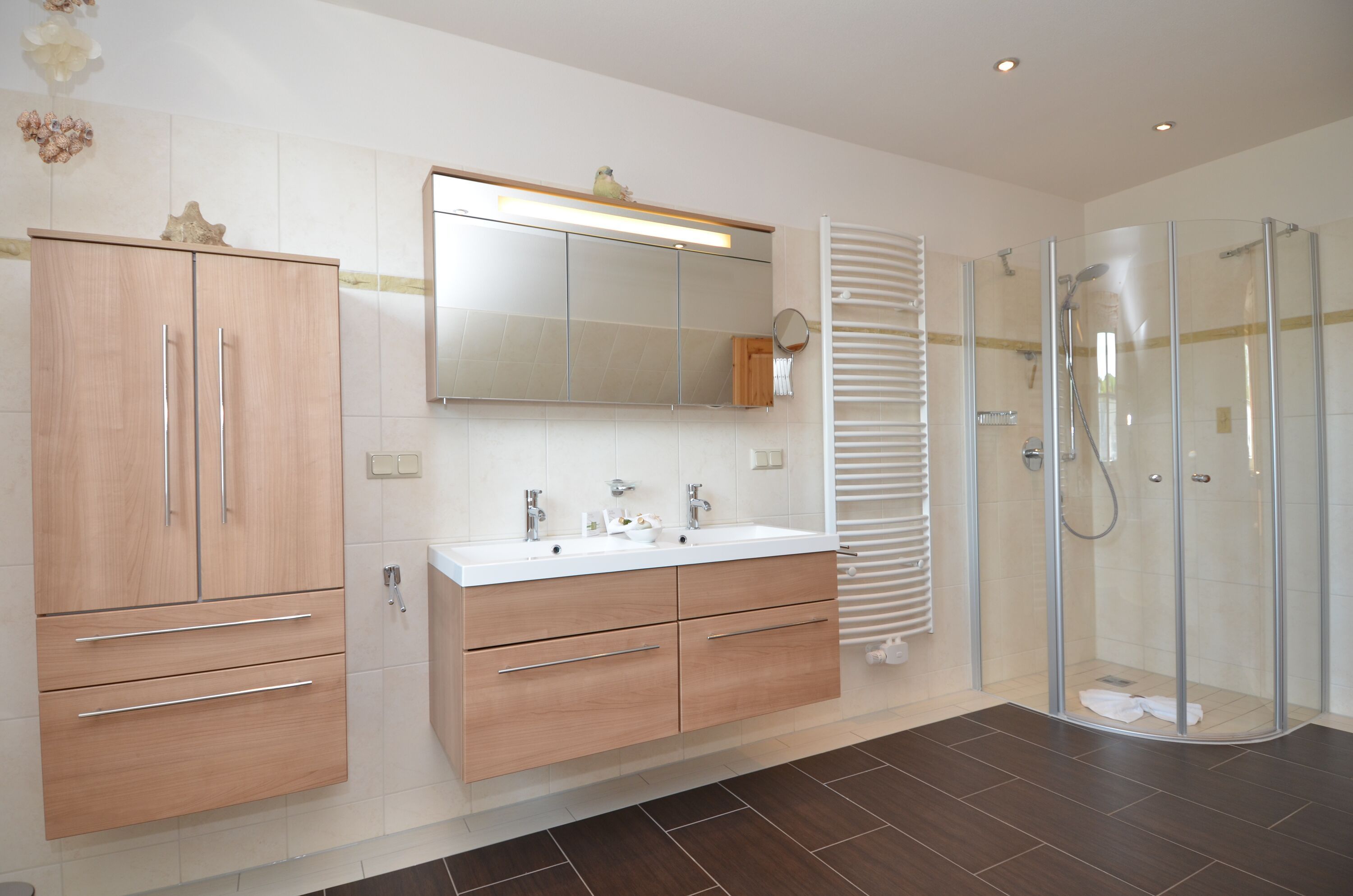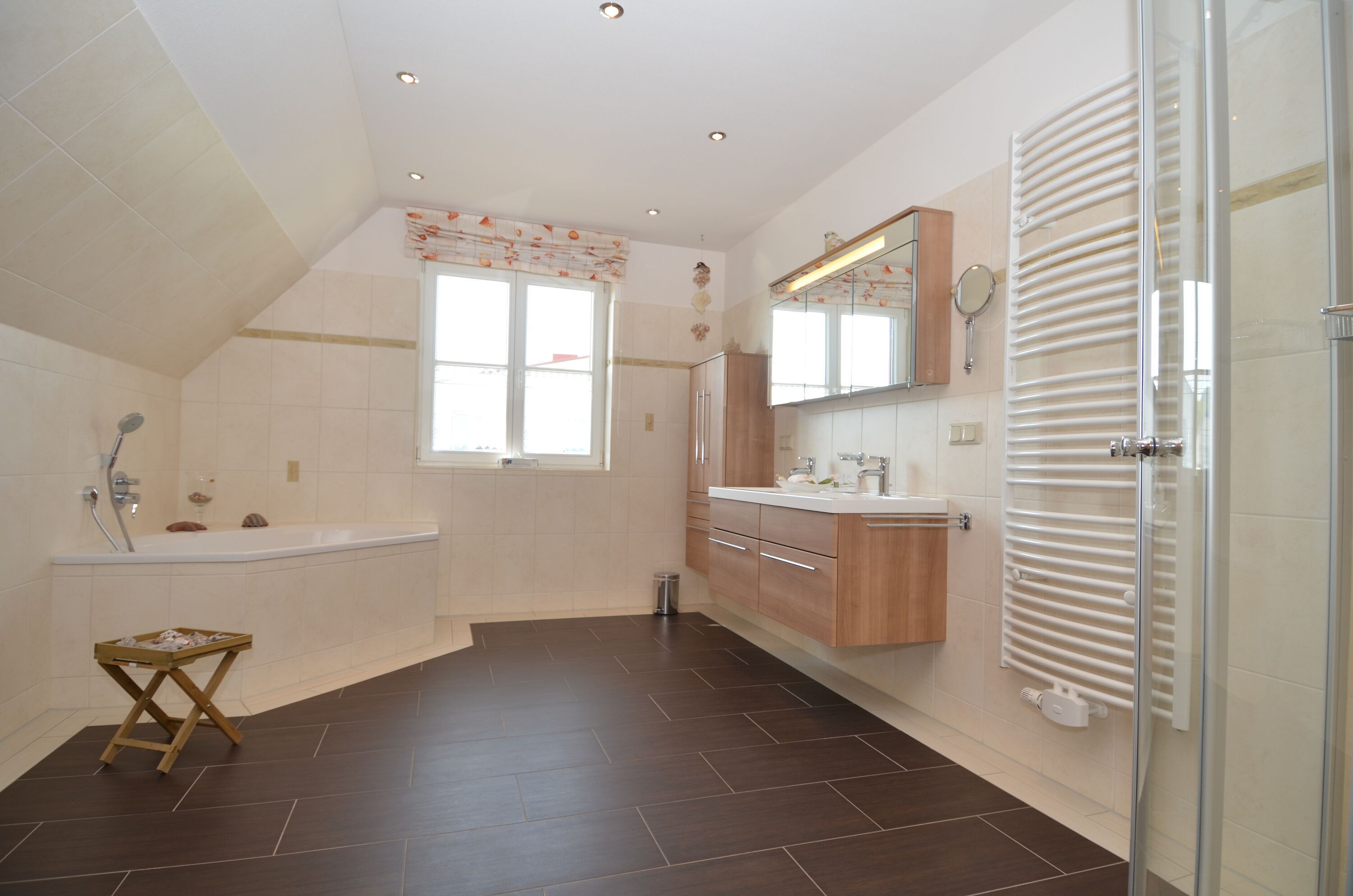 Das geräumige Bad auf dieser Etage besticht durch eine ebenerdige Dusche, eine schöne Badewanne, zwei Waschbecken, Fußbodenheizung und viel Ablagefläche. Eine hauseigene Sauna komplettiert die hochwertige Ausstattung.