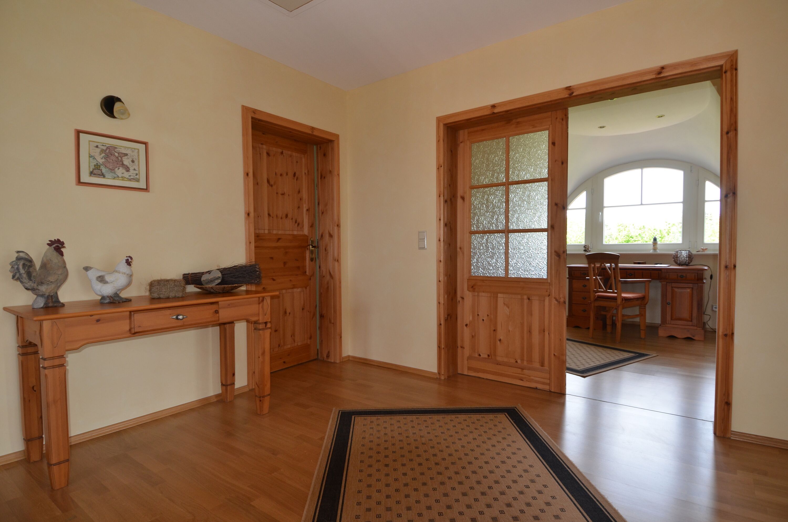 Im kompletten Erdgeschoss gibt es eine offenliegende Balkendecke und einen beheizten Terracottafußboden. Über den großzügigen Flur mit Garderobe gelangen Sie in das geräumige Wohn-und Esszimmer mit der offenen Küche. Im Erdgeschoss befindet sich ebenfalls ein elegantes Duschbad mit WC.