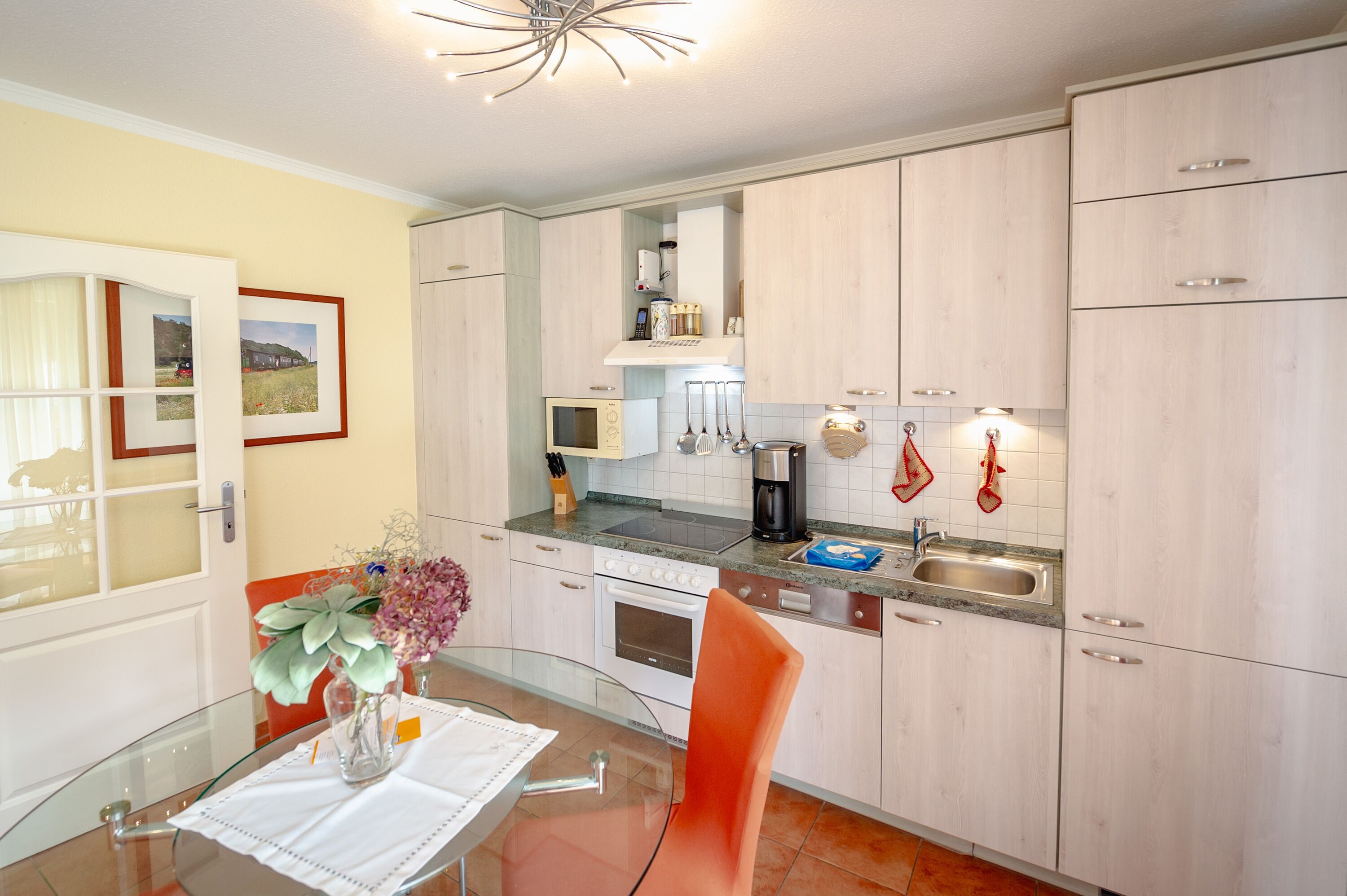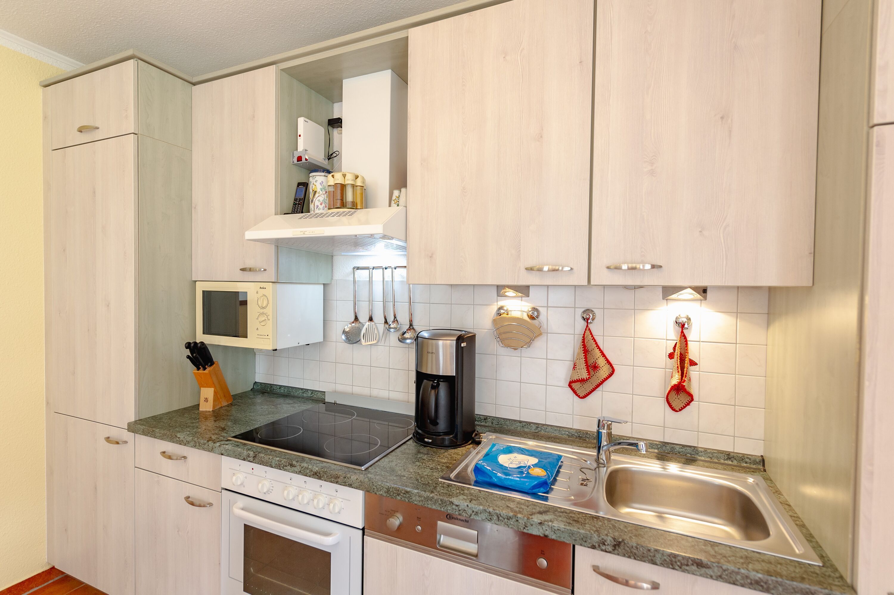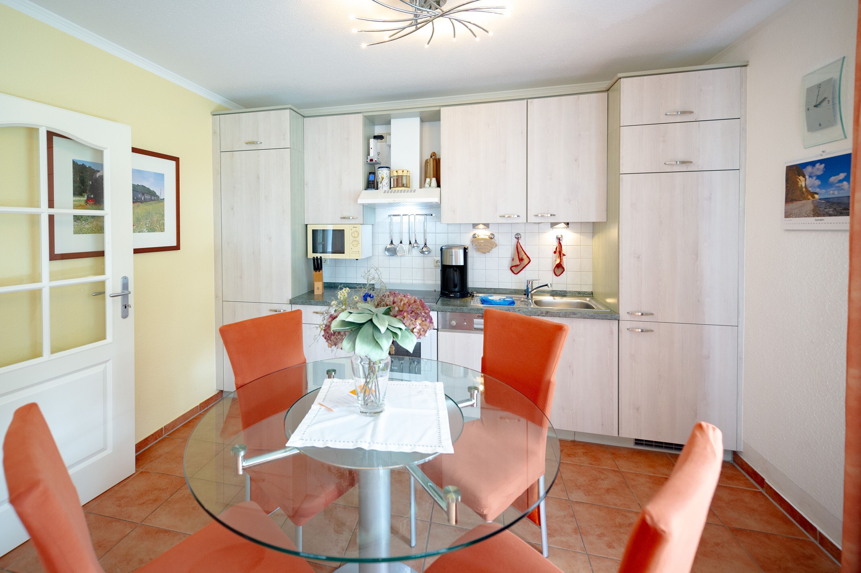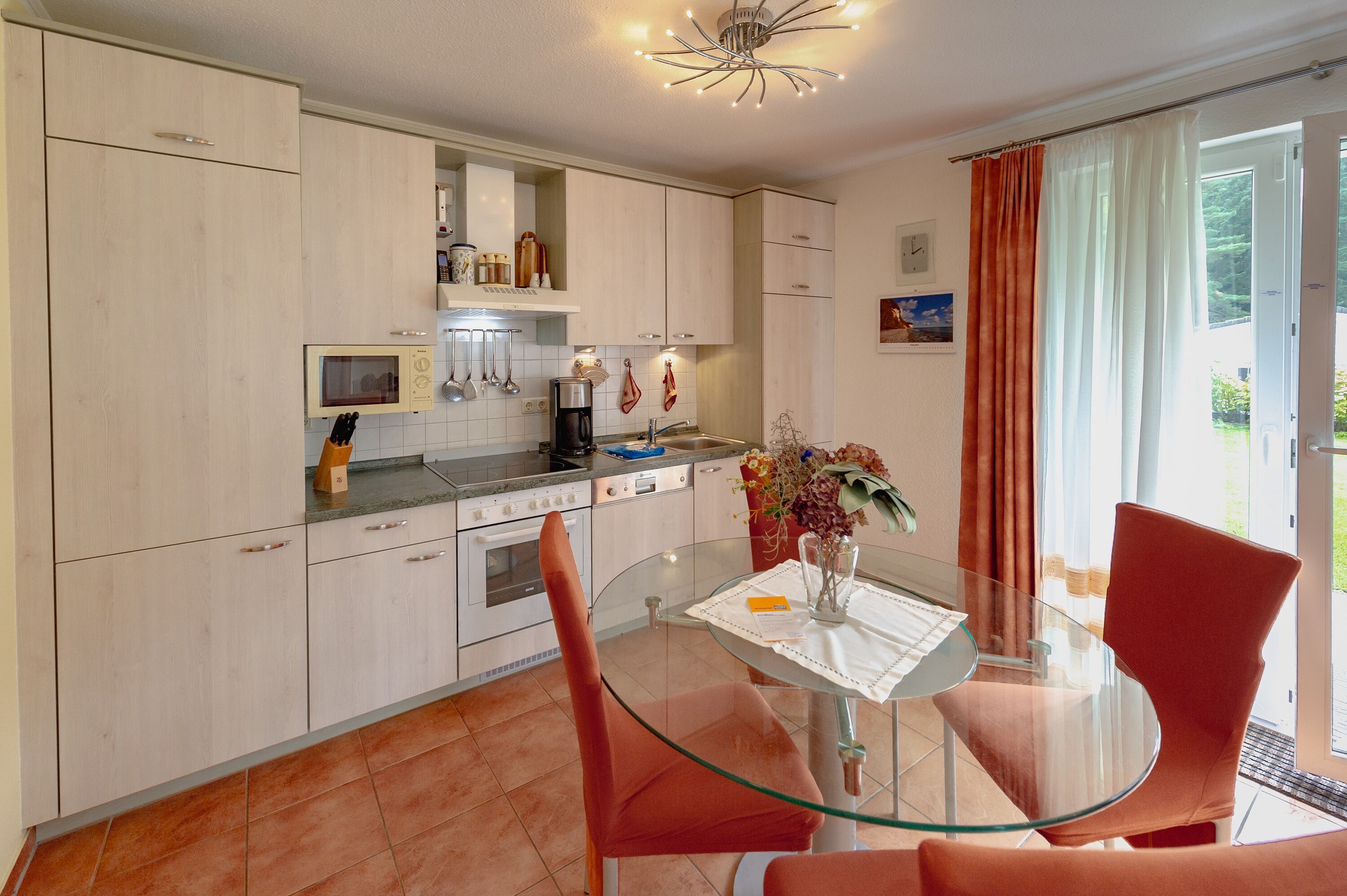 Das 2-Raum-Appartement besteht aus einem Wohnzimmer mit einer gemütlichen Couch, einem Esstisch und einer Küchenzeile. In dieser befinden sich eine Spülmaschine, Kühlschrank mit Gefrierfach, 4-Platten-Cerankochfeld, Backofen und diverse Kleingeräte, die die Ausstattung komplettieren.