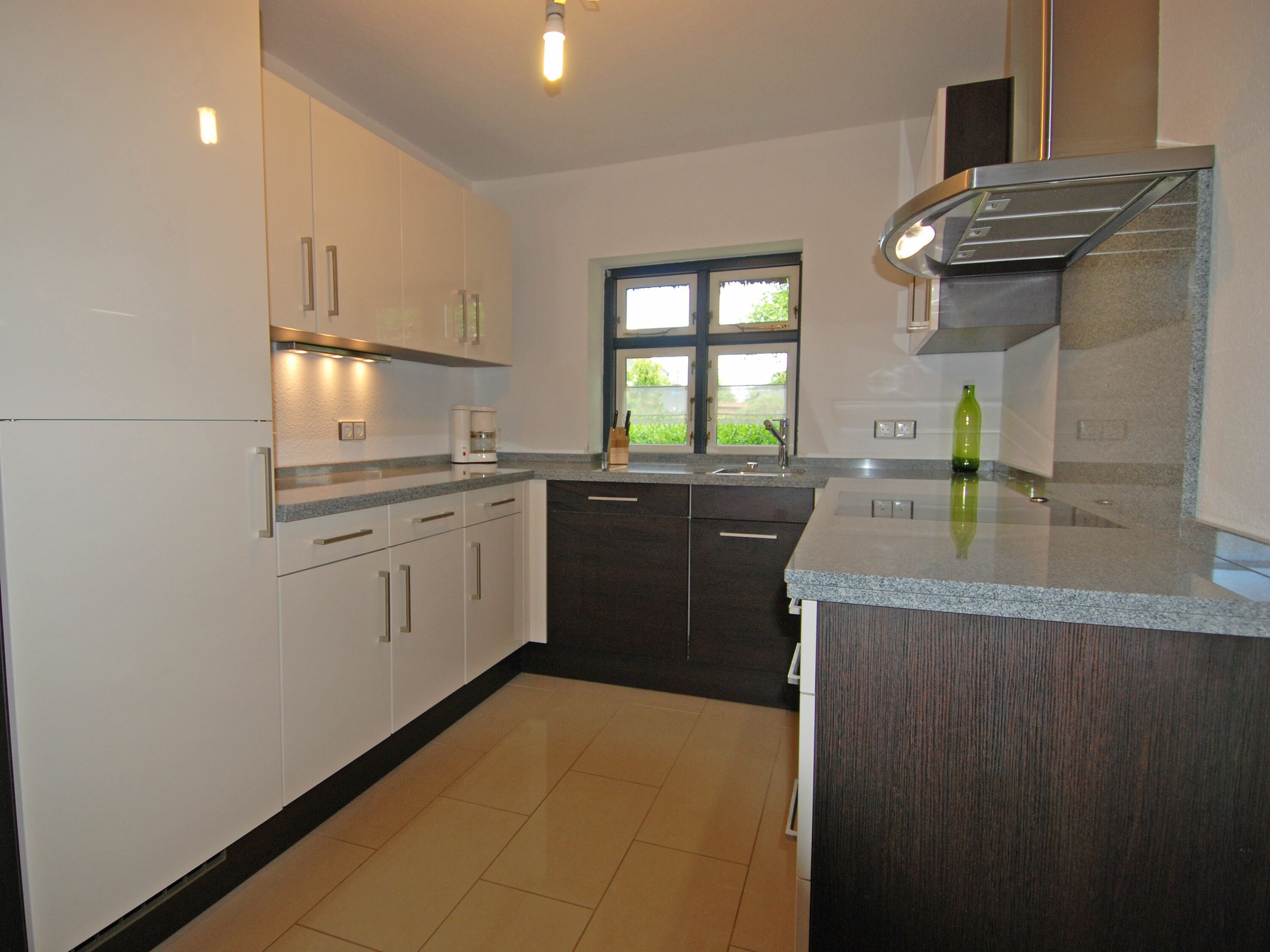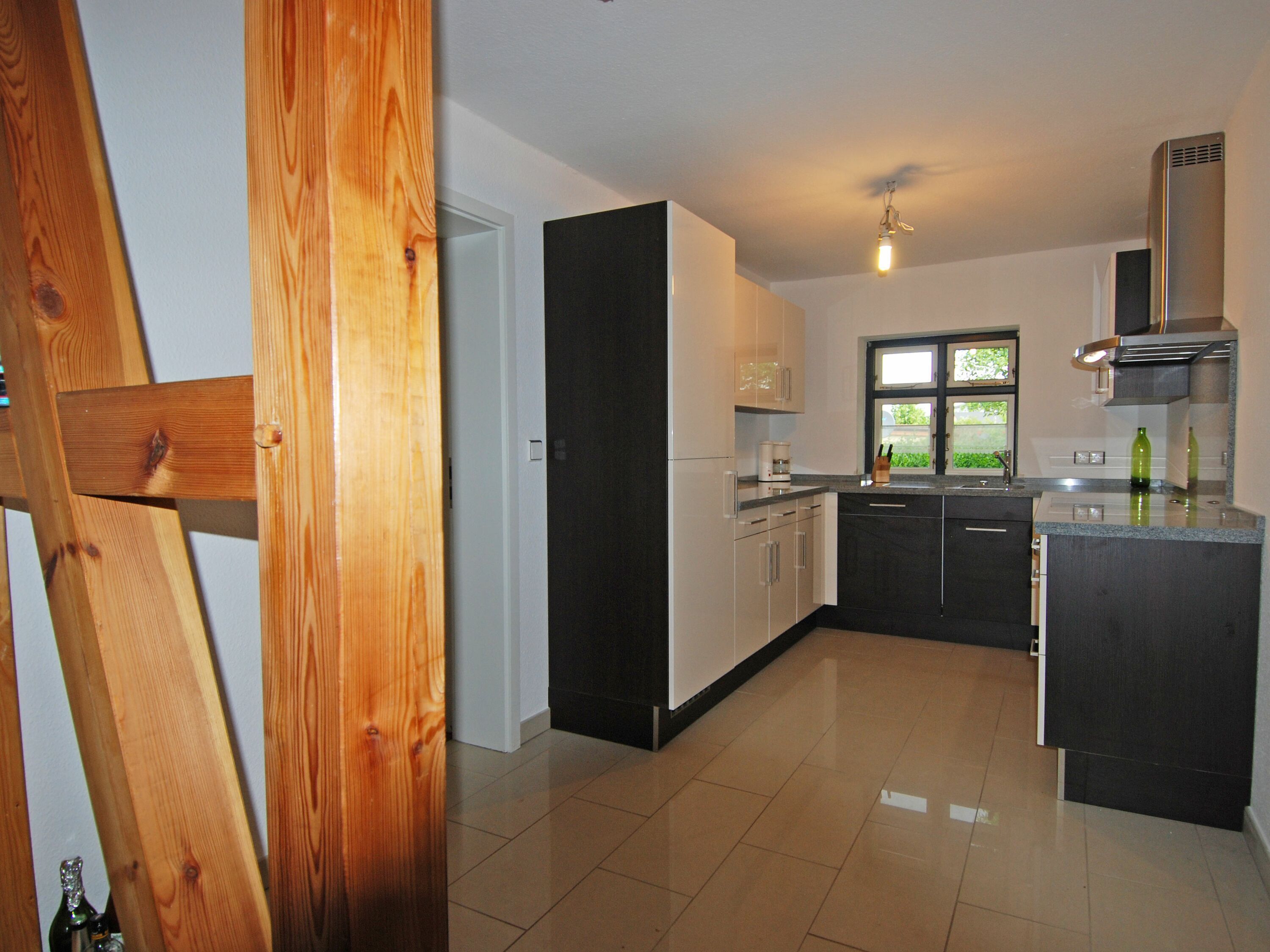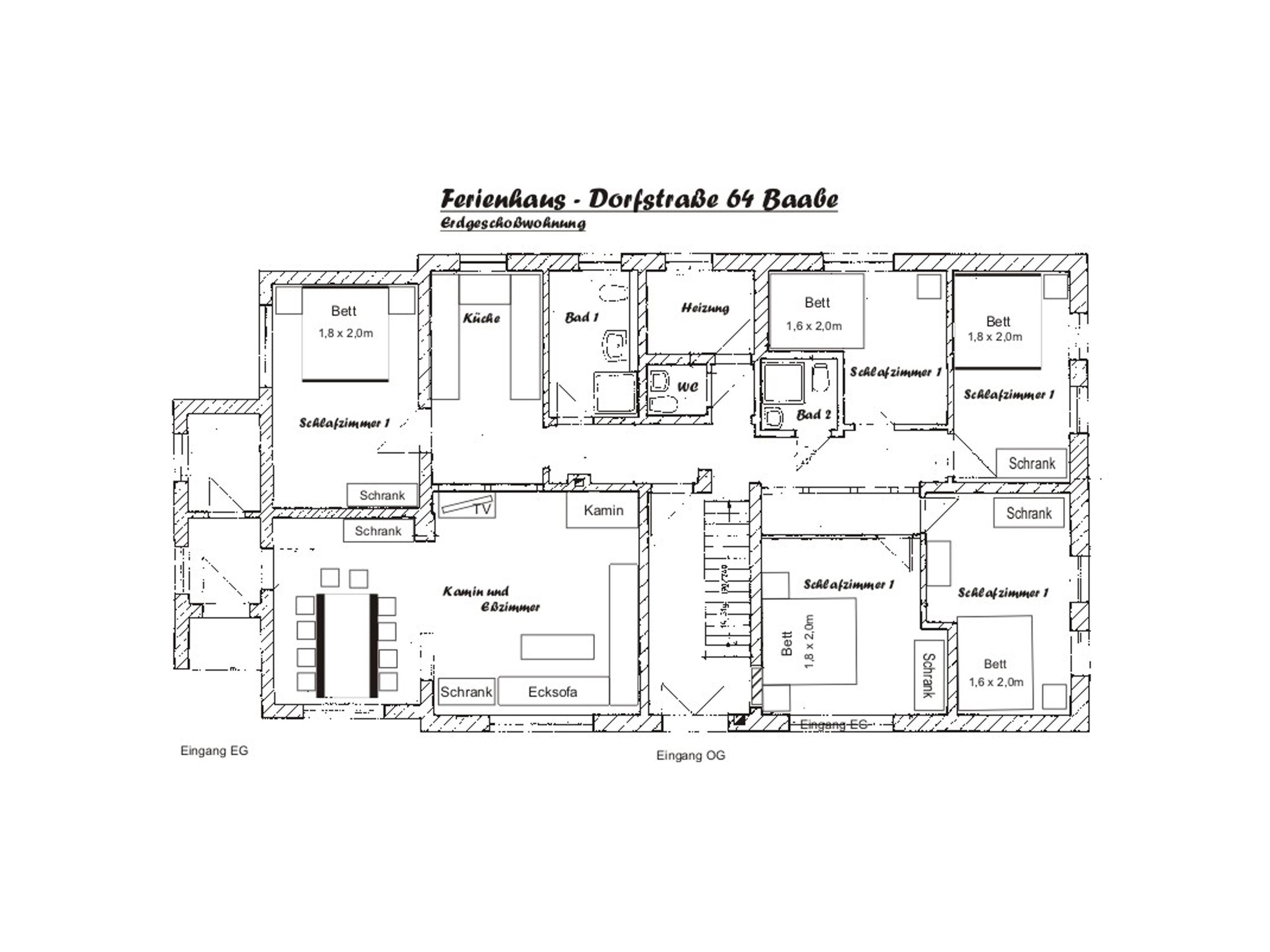 Die Fewo 1 im Erdgeschoss misst stolze 120 m² Wohnfläche und ist für bis zu 10 Personen ausgelegt. Über den Eingangsbereich mit Garderobe gelangen Sie in das geräumige Wohn- und Esszimmer. Dieses verfügt über eine Couchgarnitur, einen großen Kachelofen (ohne Funktion), ein Radio mit CD-Player, einen Fernseher mit DVD-Player sowie einen Esstisch für die ganze Familie. Die hochwertig ausgestattete Küche umfasst u.a. einen Ceranherd, einen Backofen, einen XXL-Kühlschrank, eine Spülmaschine, eine Mikrowelle und natürlich alles notwendige Kleininventar, damit Sie sich selbst bekochen können.