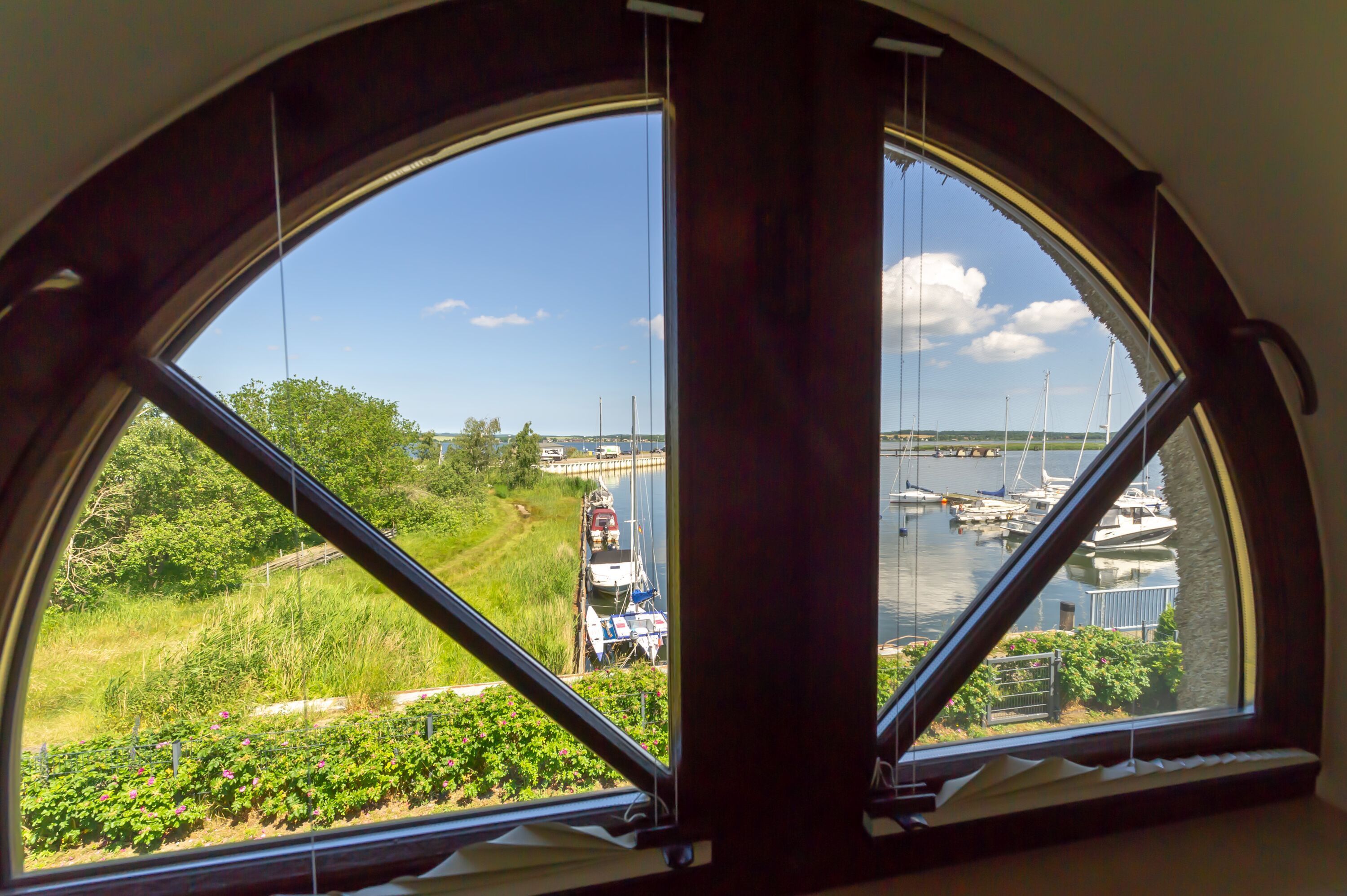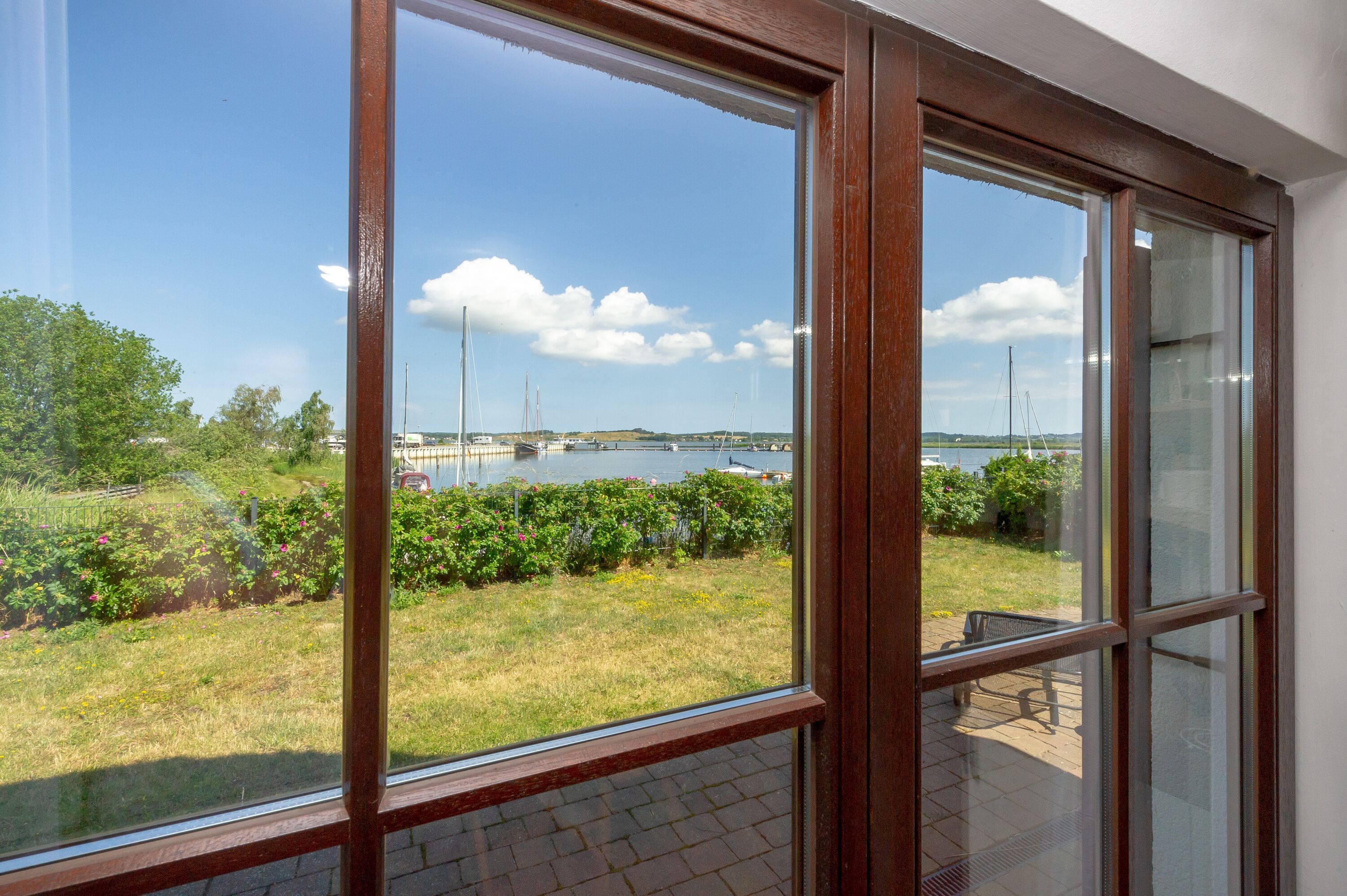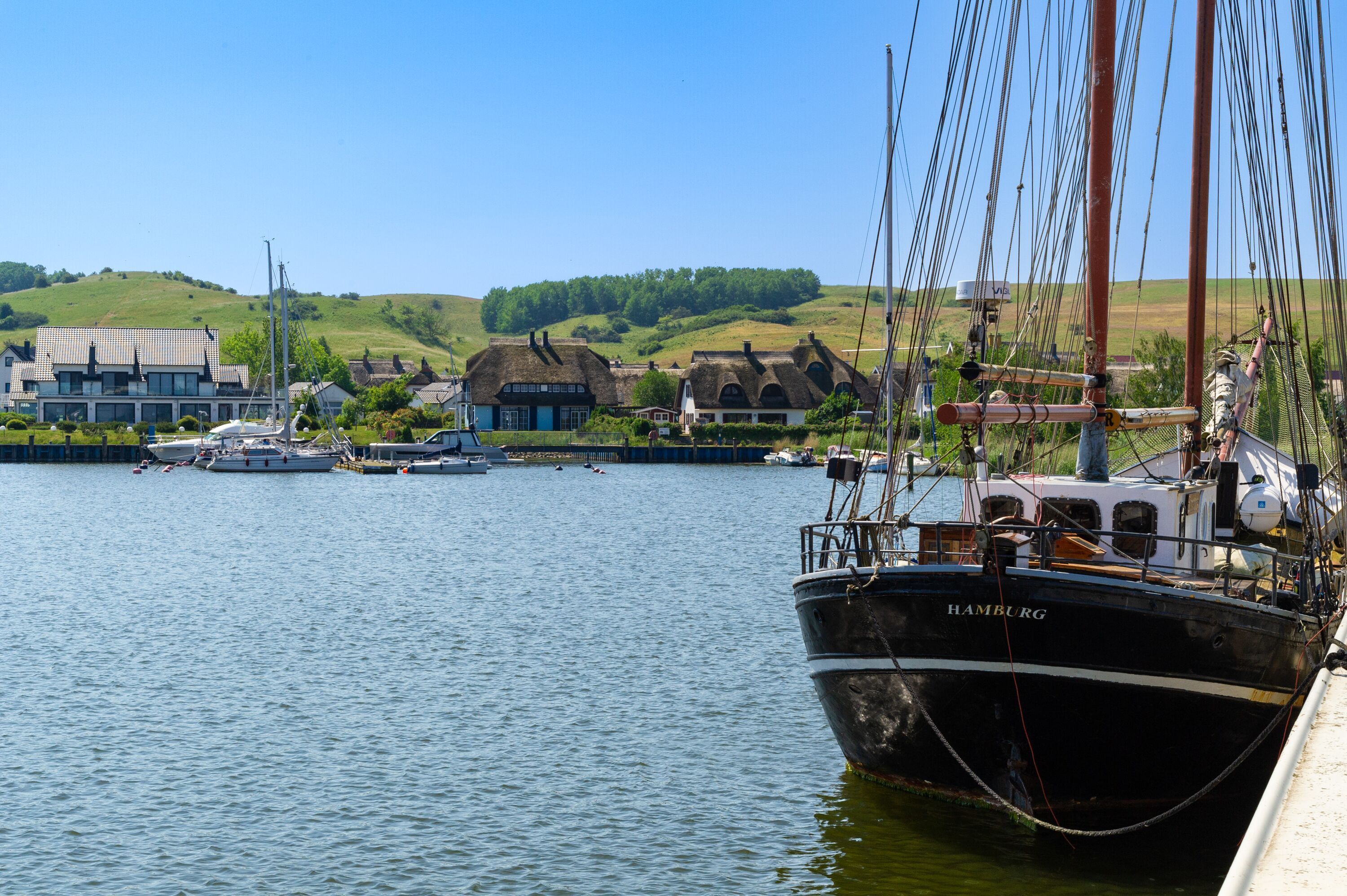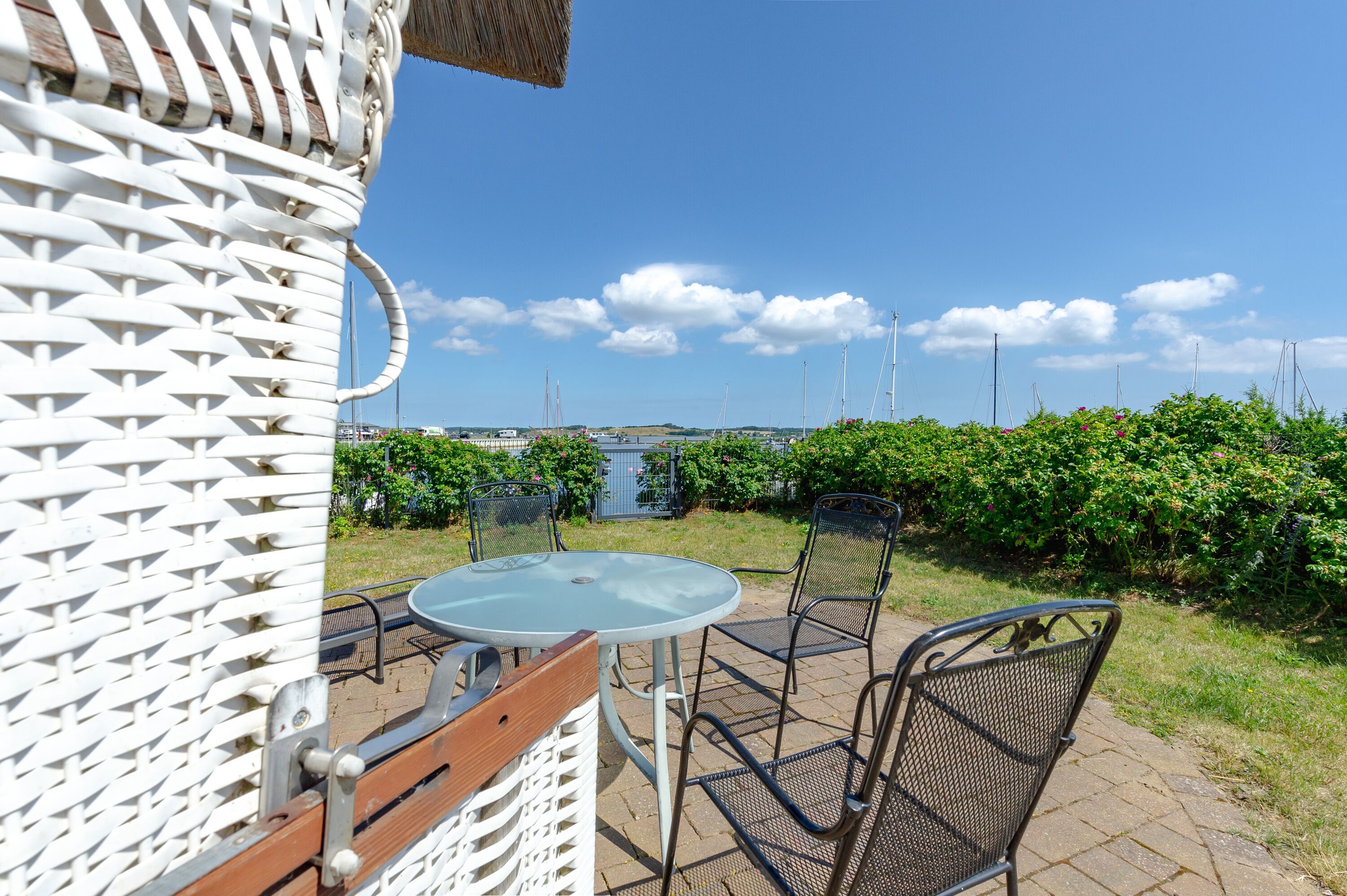 Die großzügige umlaufende Terrasse mit Morgen- und Abendsonne bietet eine traumhafte Aussicht auf den Hafen von Gager und die Hagensche Wiek. Aus dem Strandkorb, sowie der Sitzgruppe oder von den Liegen auf der Terrasse kann der Blick in die Ferne schweifen.