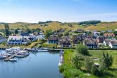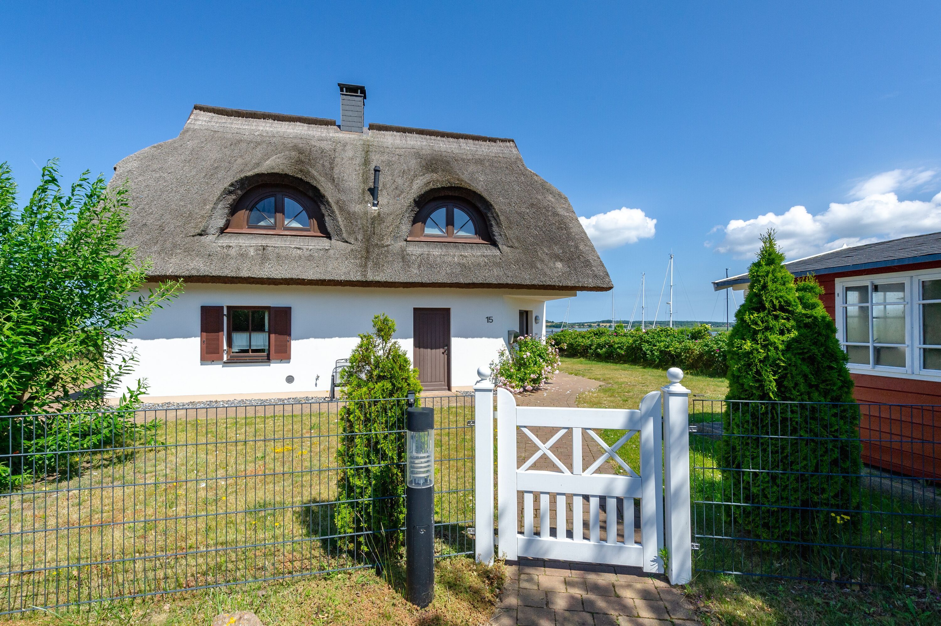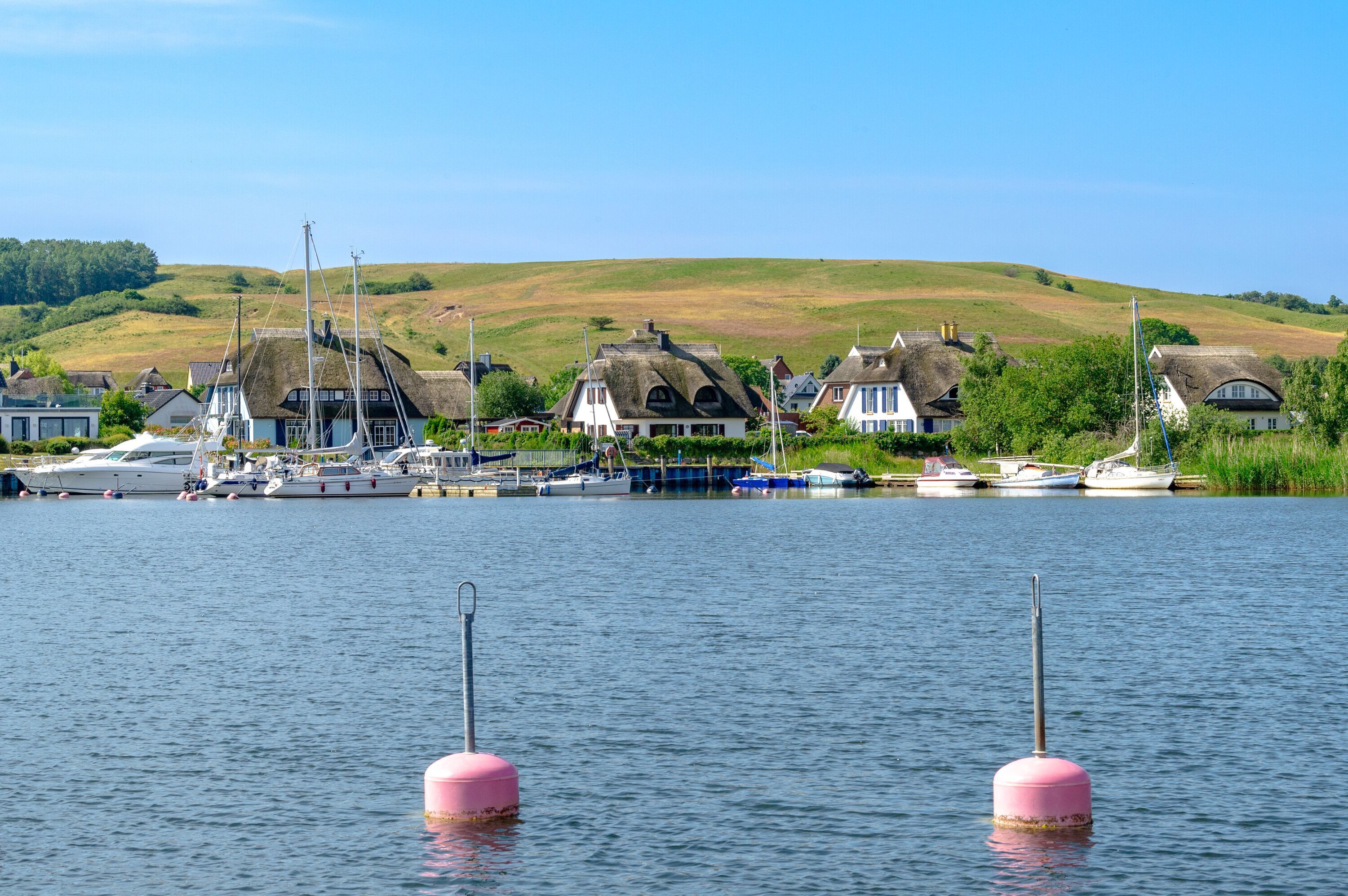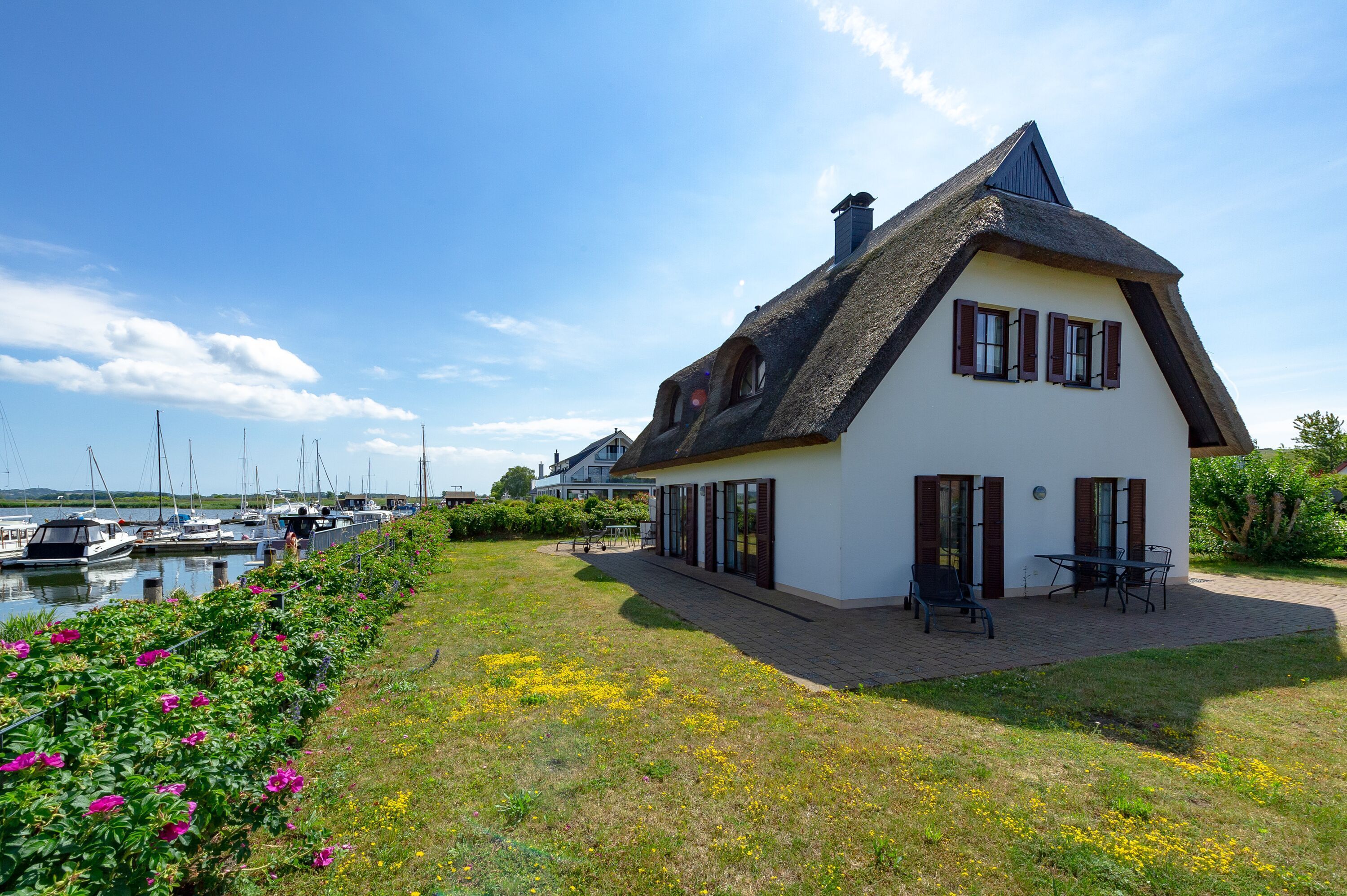 Die großzügige umlaufende Terrasse mit Morgen- und Abendsonne bietet eine traumhafte Aussicht auf den Hafen von Gager und die Hagensche Wiek. Aus dem Strandkorb, sowie der Sitzgruppe oder von den Liegen auf der Terrasse kann der Blick in die Ferne schweifen.
