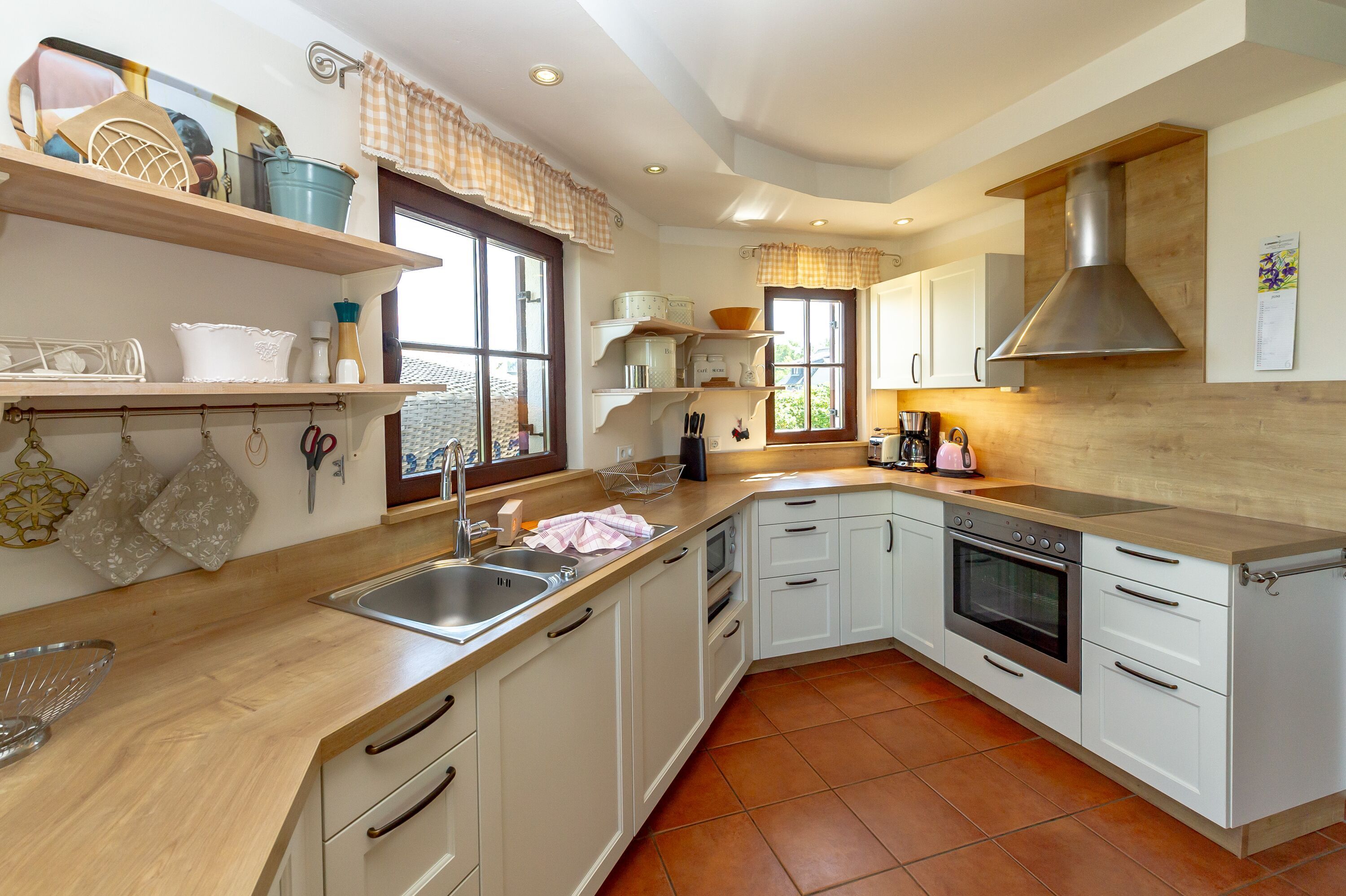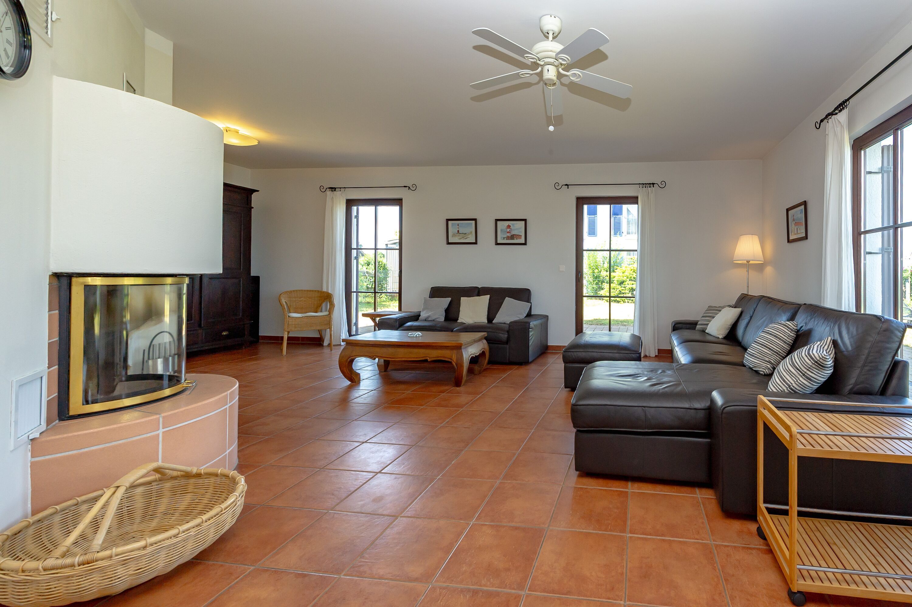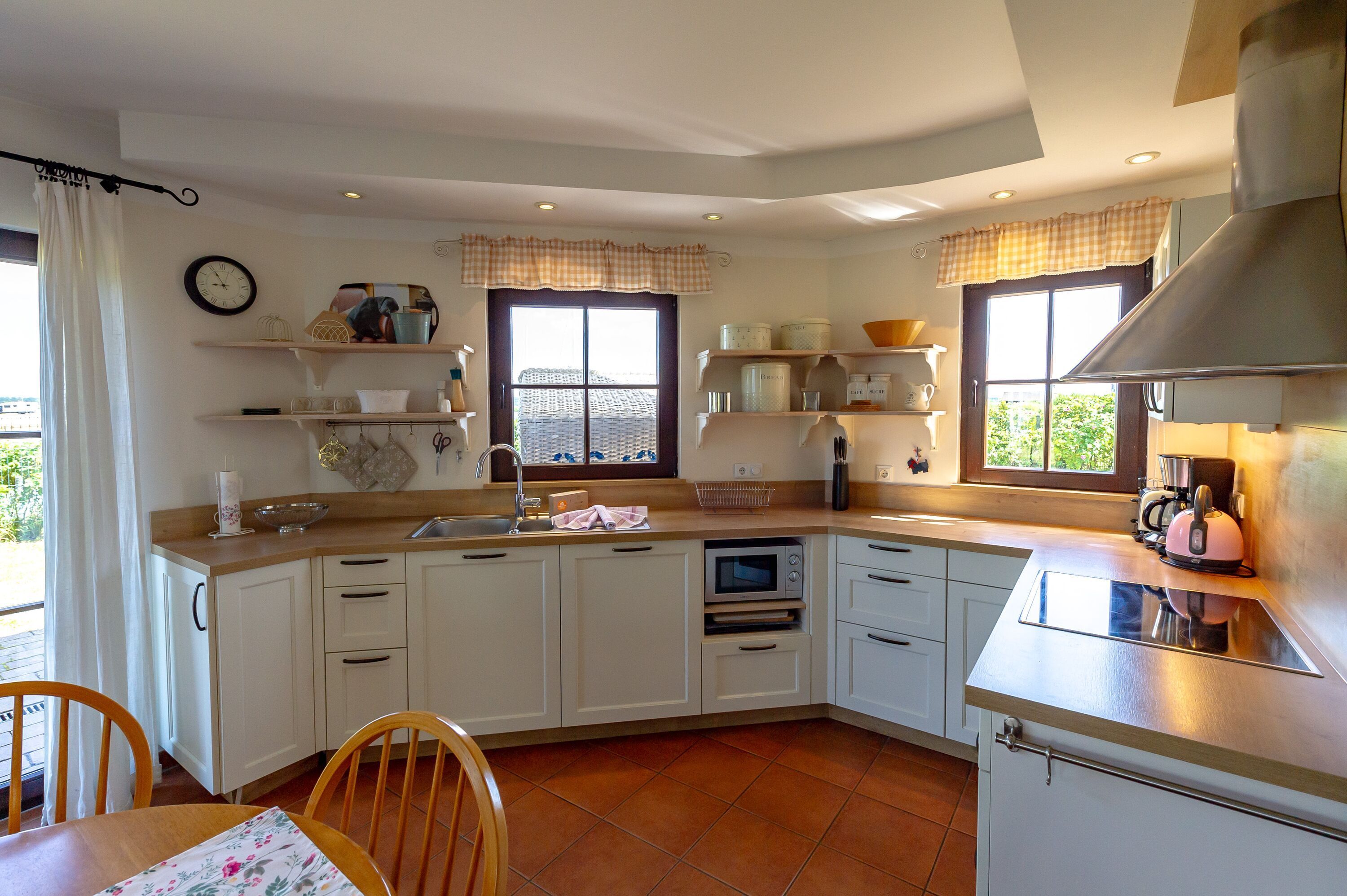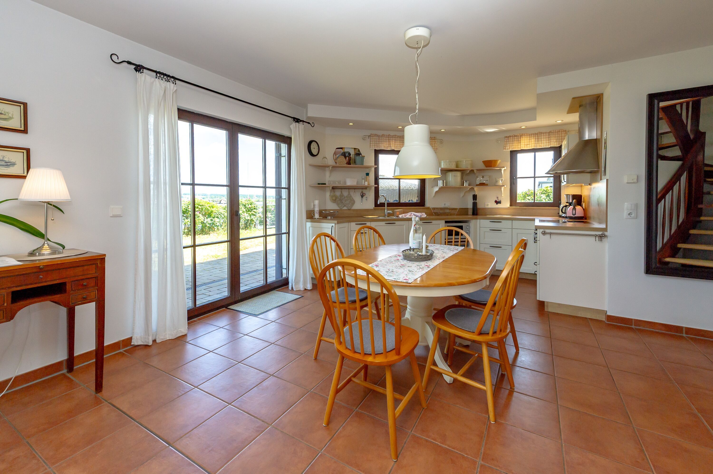 Im Erdgeschoss befindet sich das geräumige Wohn- und Esszimmer welches mit einem Kamin, einer bequemen Sitzgruppe sowie einem großen Esstisch für bis zu 6 Personen komfortabel eingerichtet ist. Smart-TV, Stereoanlage mit CD-Player, Bücher und Spiele runden die exklusive Ausstattung ab. Die ebenfalls sehr gut ausgestattete Küche mit Spülmaschine, Backofen, Ceran-Kochfeld mit vier Kochstellen, Mikrowelle, amerikanischem Kühlschrank mit ***Gefrierfach, Toaster, Kaffeemaschine, Wasserkocher, Mixer, Backformen und weiteren Utensilien, lässt keine Wünsche offen. Weiterhin befinden sich ein Duschbad mit einer Showerpipe-Dusche sowie ein Abstellraum im Erdgeschoss des Hauses.