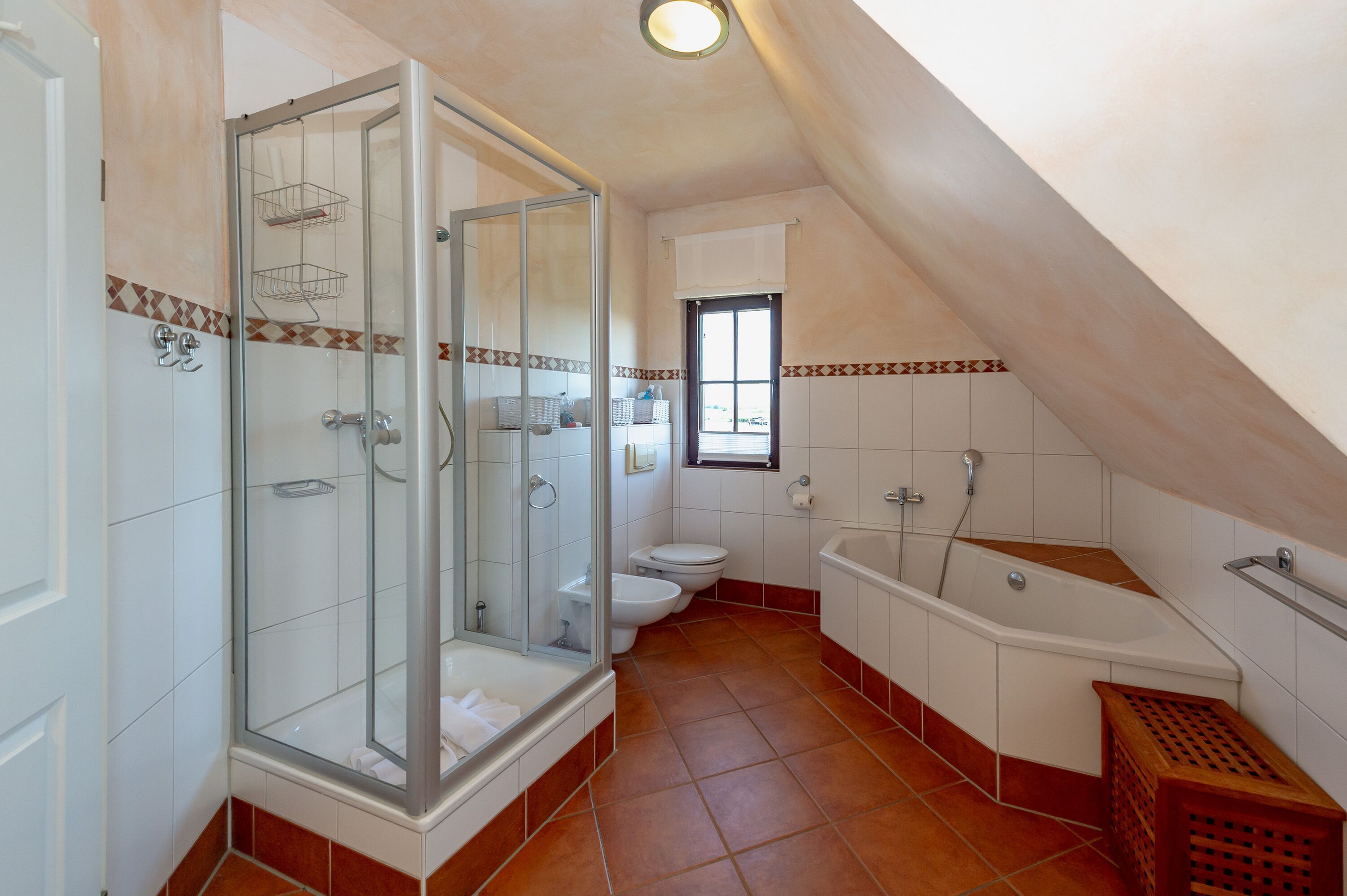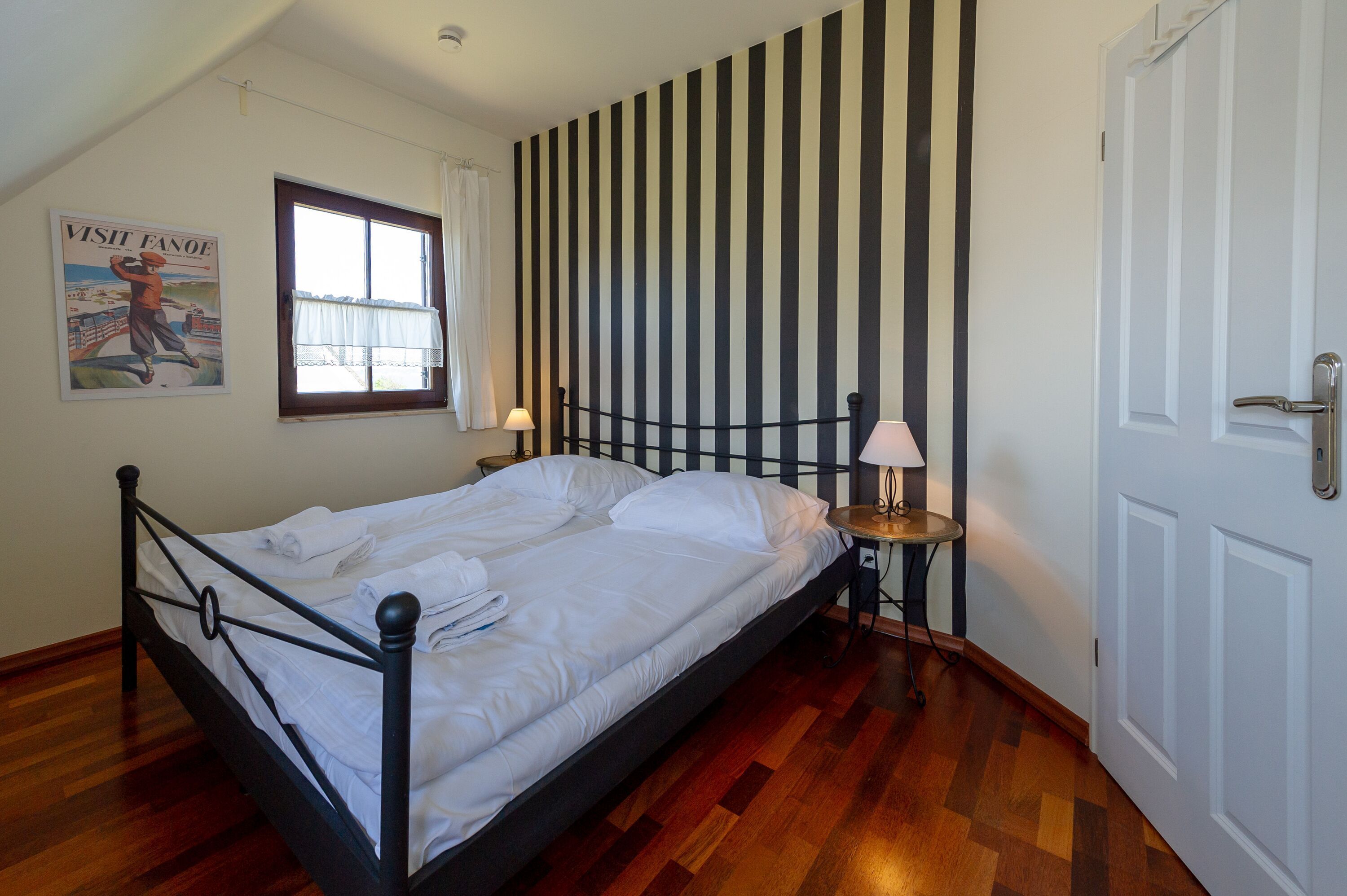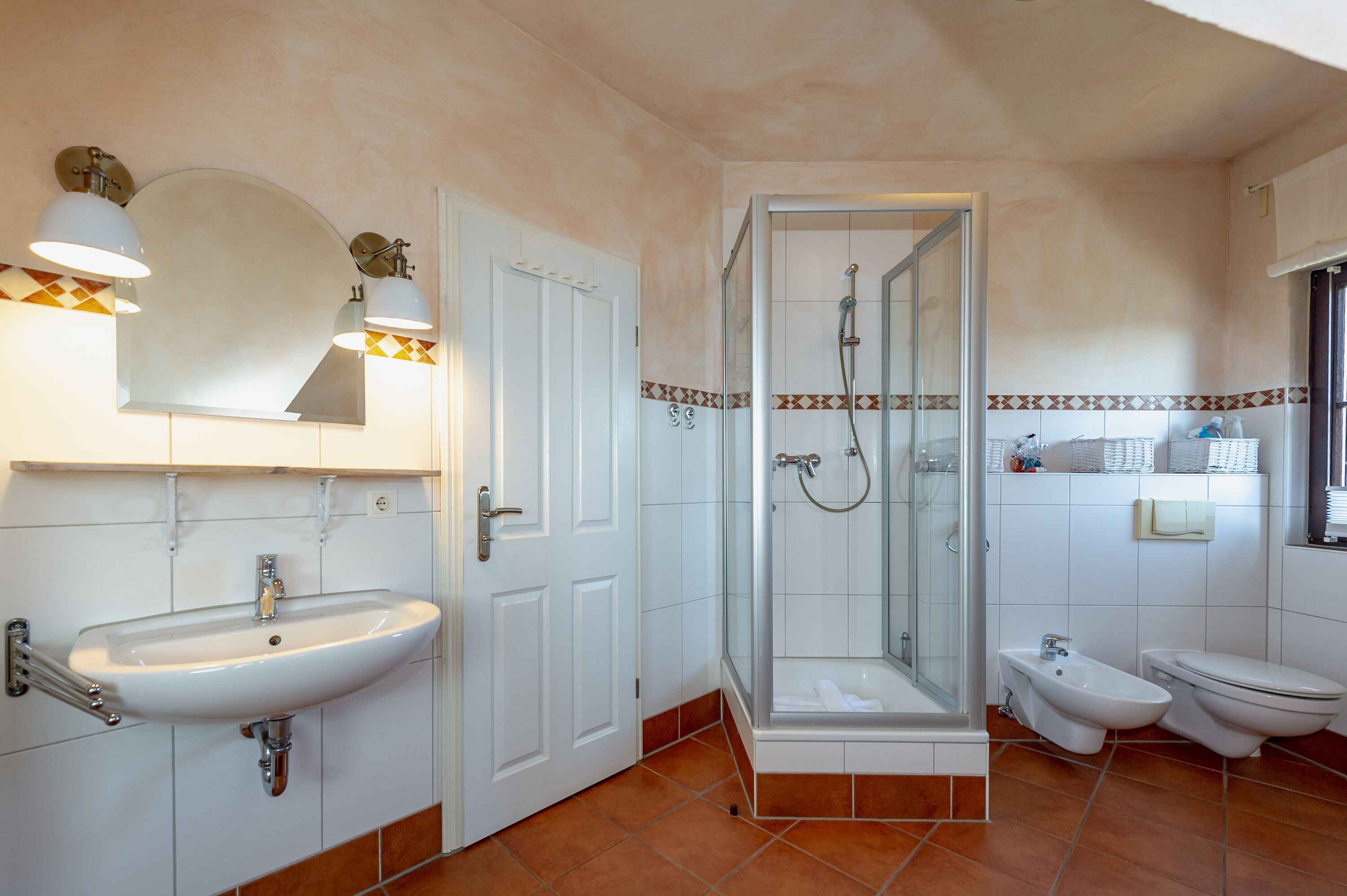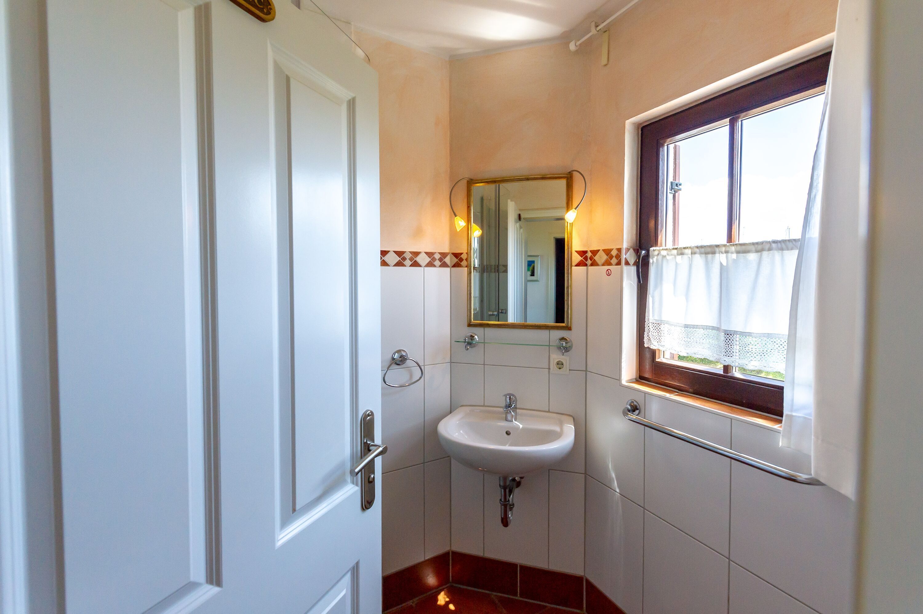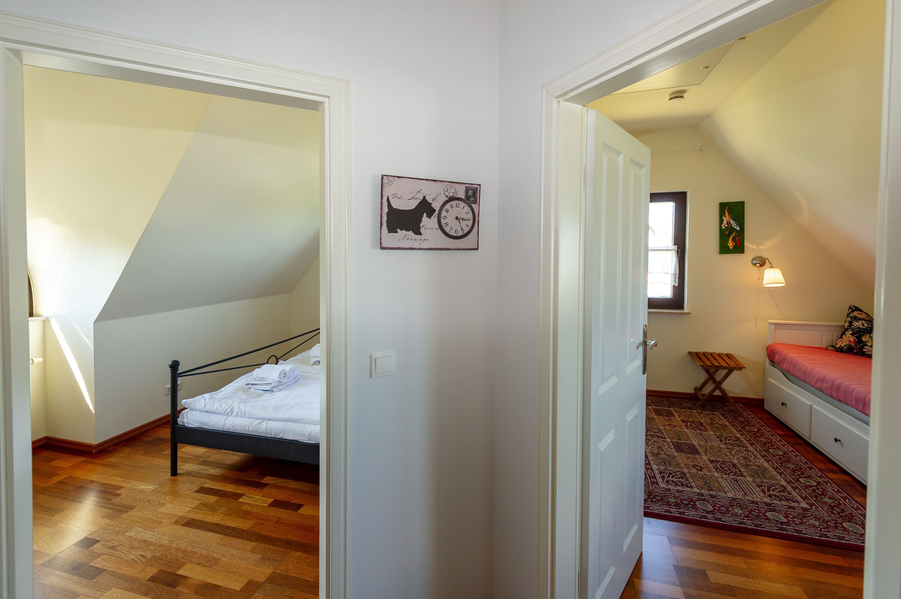 Über eine Treppe gelangen Sie in das Obergeschoss. Dort finden Sie drei Schlafzimmer, zwei mit einem Doppelbett und das andere mit einem Einzelbett, welches man zu einem Doppelbett umbauen kann und einem Schreibtisch, sowie einen weiteren Fernseher (nur öffentlich rechtliche Programme). Ein weiteres Duschbad mit Badewanne und Bidet befindet sich ebenfalls im Obergeschoss.
