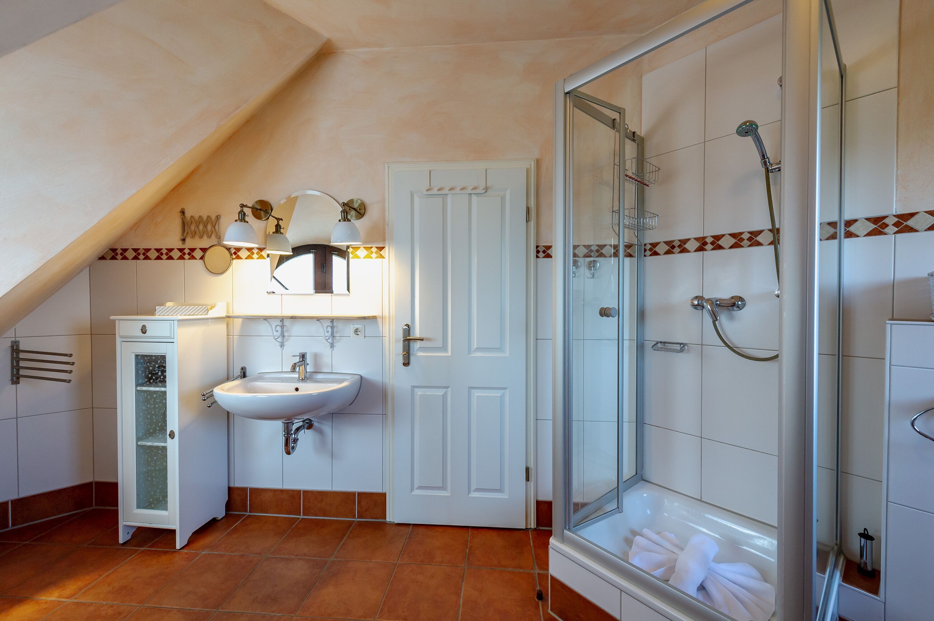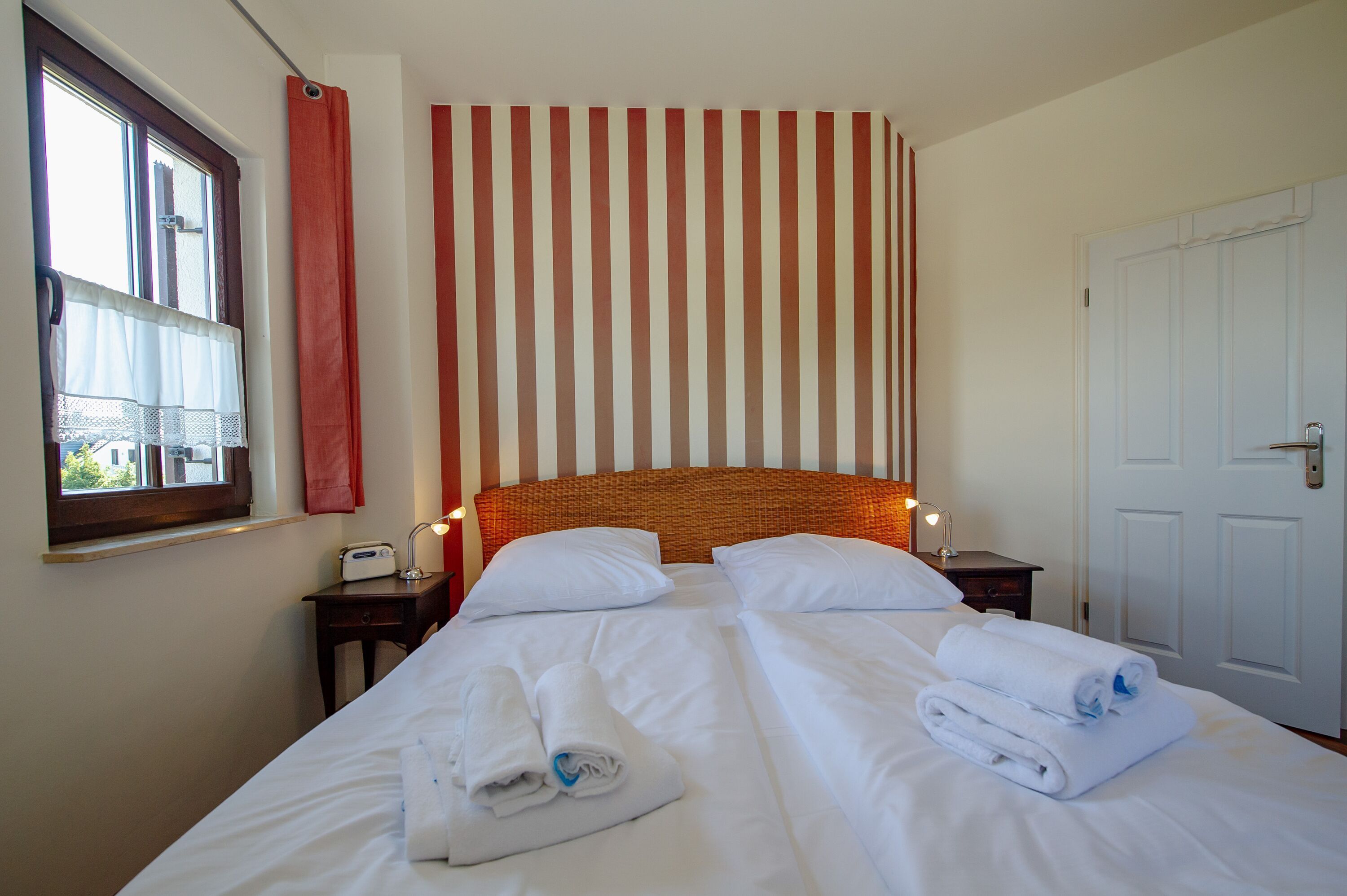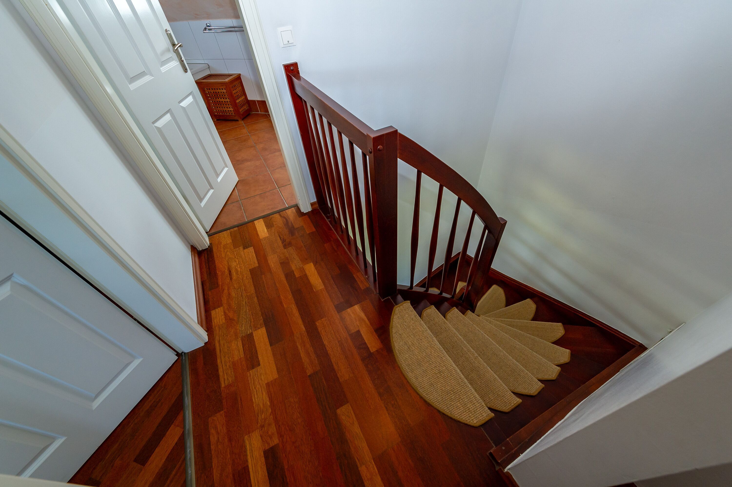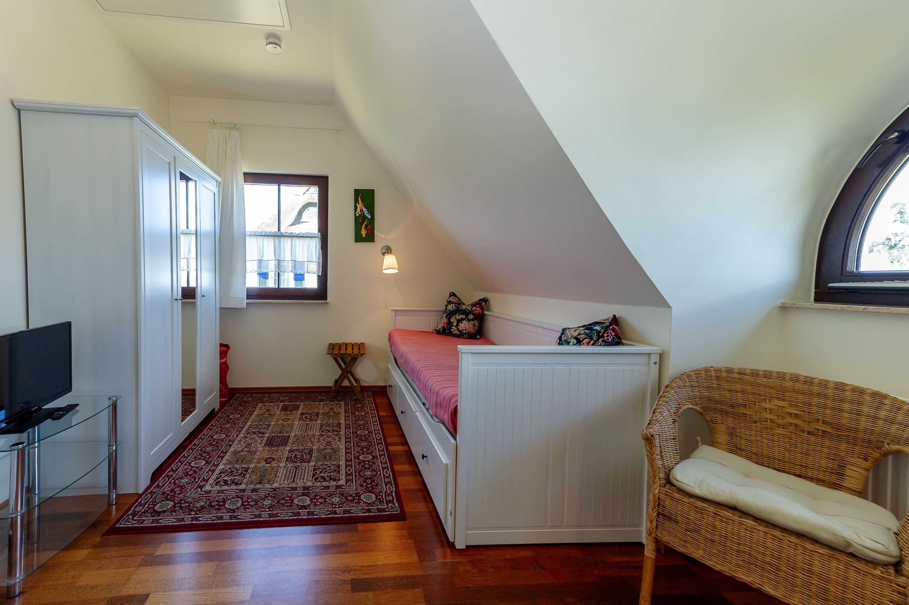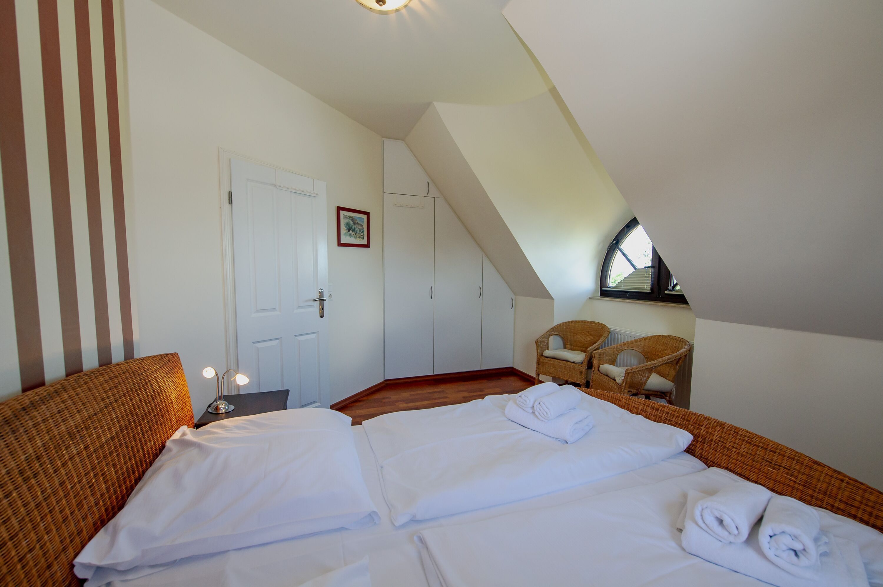 Über eine Treppe gelangen Sie in das Obergeschoss. Dort finden Sie drei Schlafzimmer, zwei mit einem Doppelbett und das andere mit einem Einzelbett, welches man zu einem Doppelbett umbauen kann und einem Schreibtisch, sowie einen weiteren Fernseher (nur öffentlich rechtliche Programme). Ein weiteres Duschbad mit Badewanne und Bidet befindet sich ebenfalls im Obergeschoss.