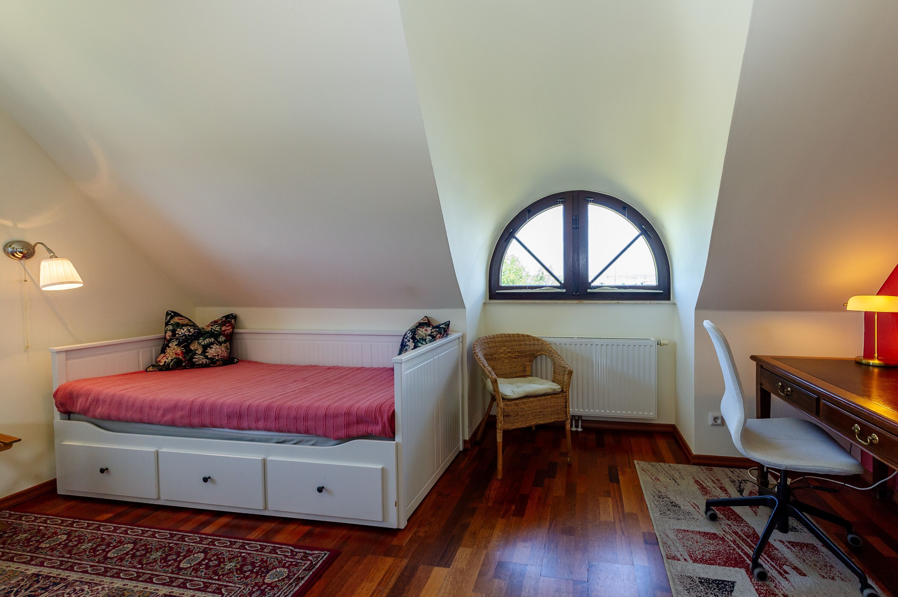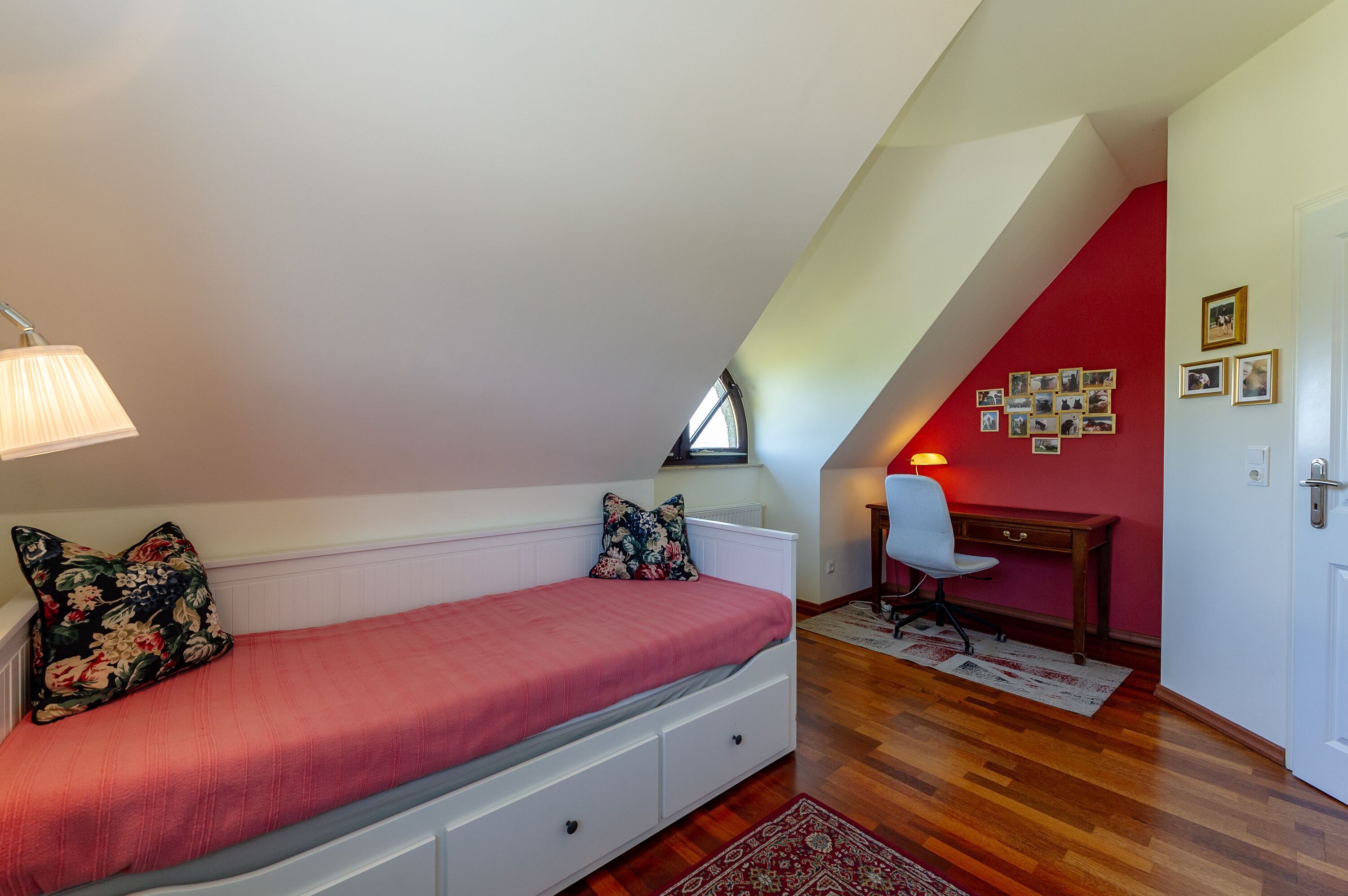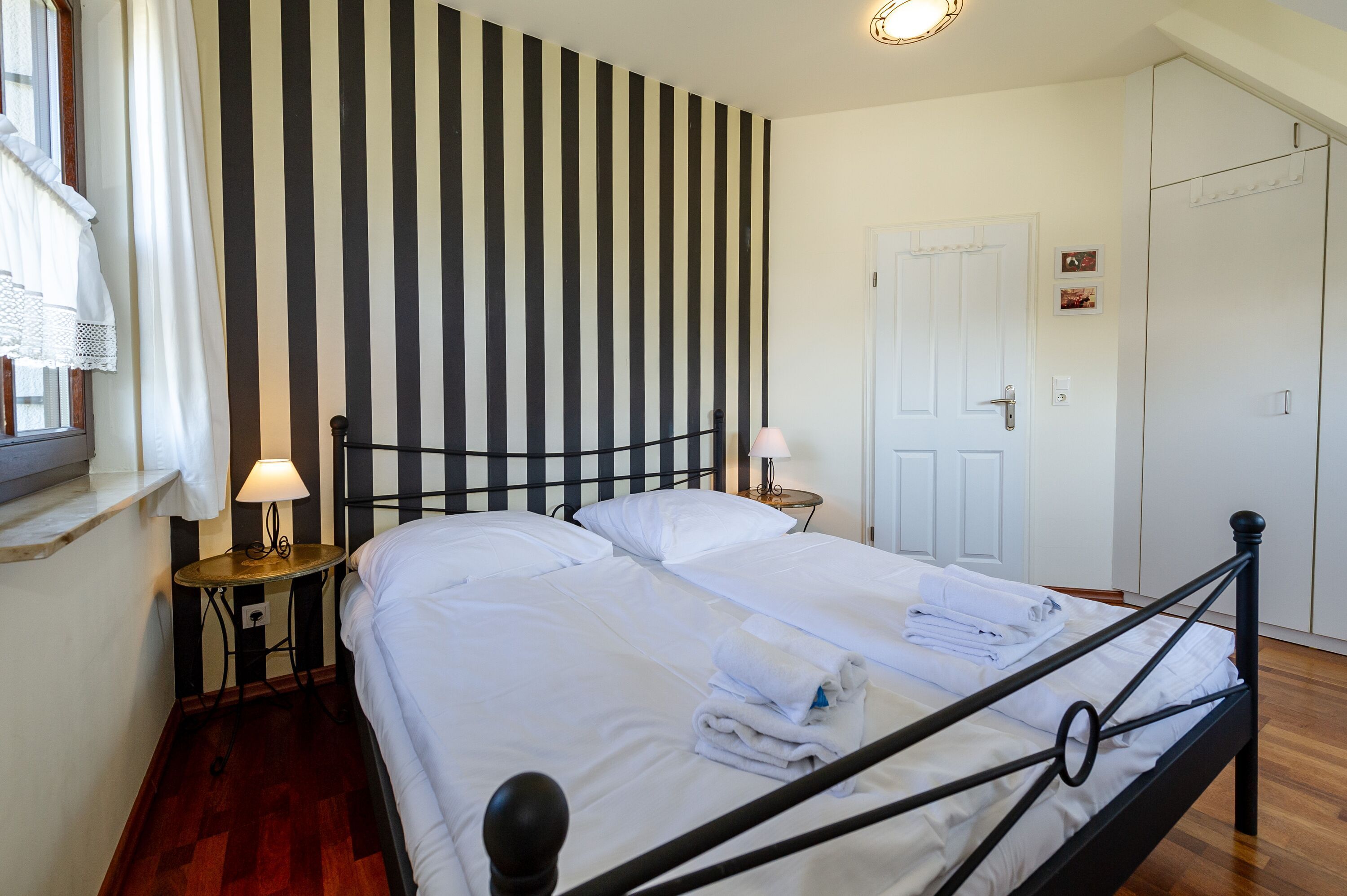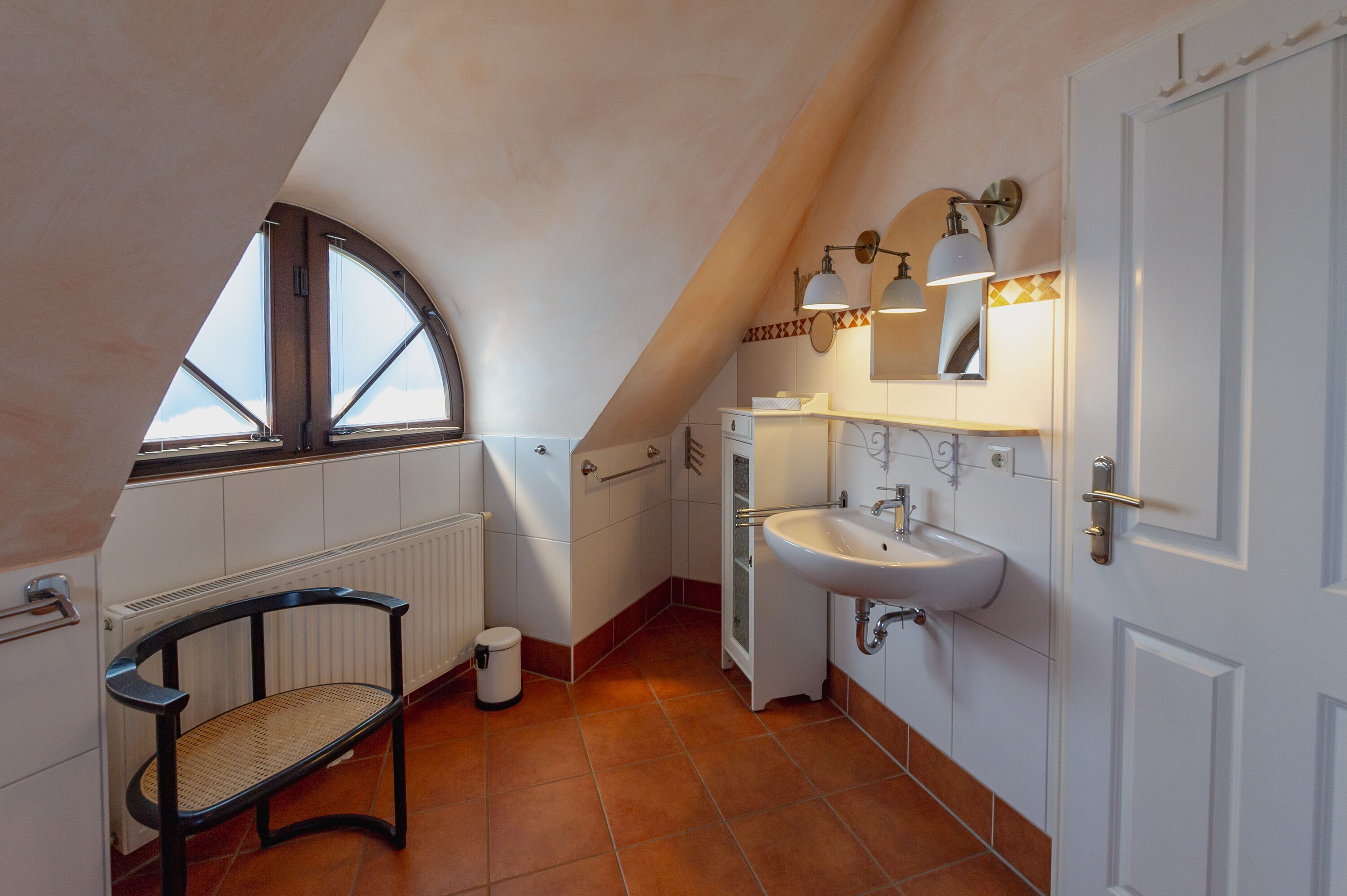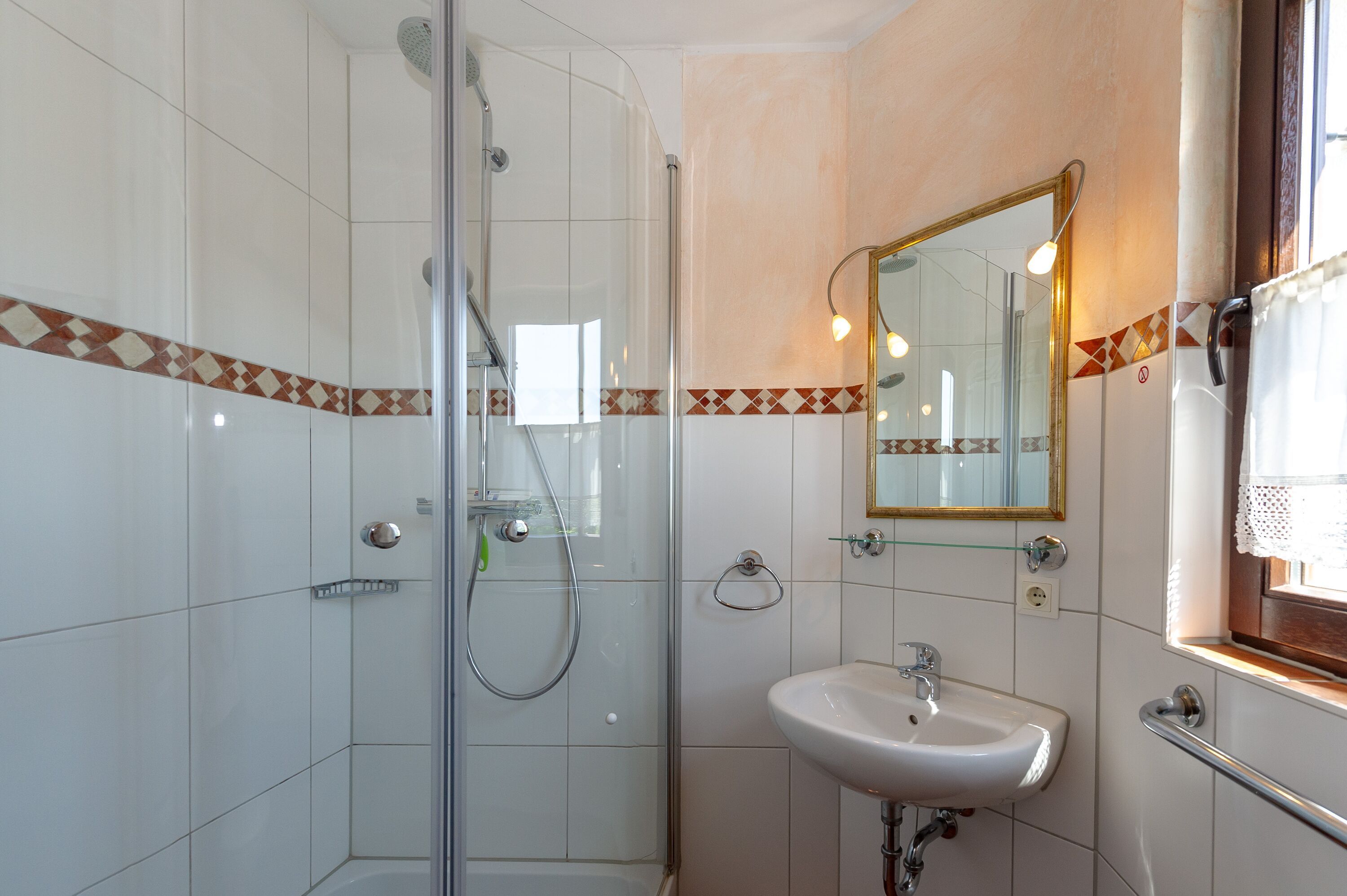 Über eine Treppe gelangen Sie in das Obergeschoss. Dort finden Sie drei Schlafzimmer, zwei mit einem Doppelbett und das andere mit einem Einzelbett, welches man zu einem Doppelbett umbauen kann und einem Schreibtisch, sowie einen weiteren Fernseher (nur öffentlich rechtliche Programme). Ein weiteres Duschbad mit Badewanne und Bidet befindet sich ebenfalls im Obergeschoss.