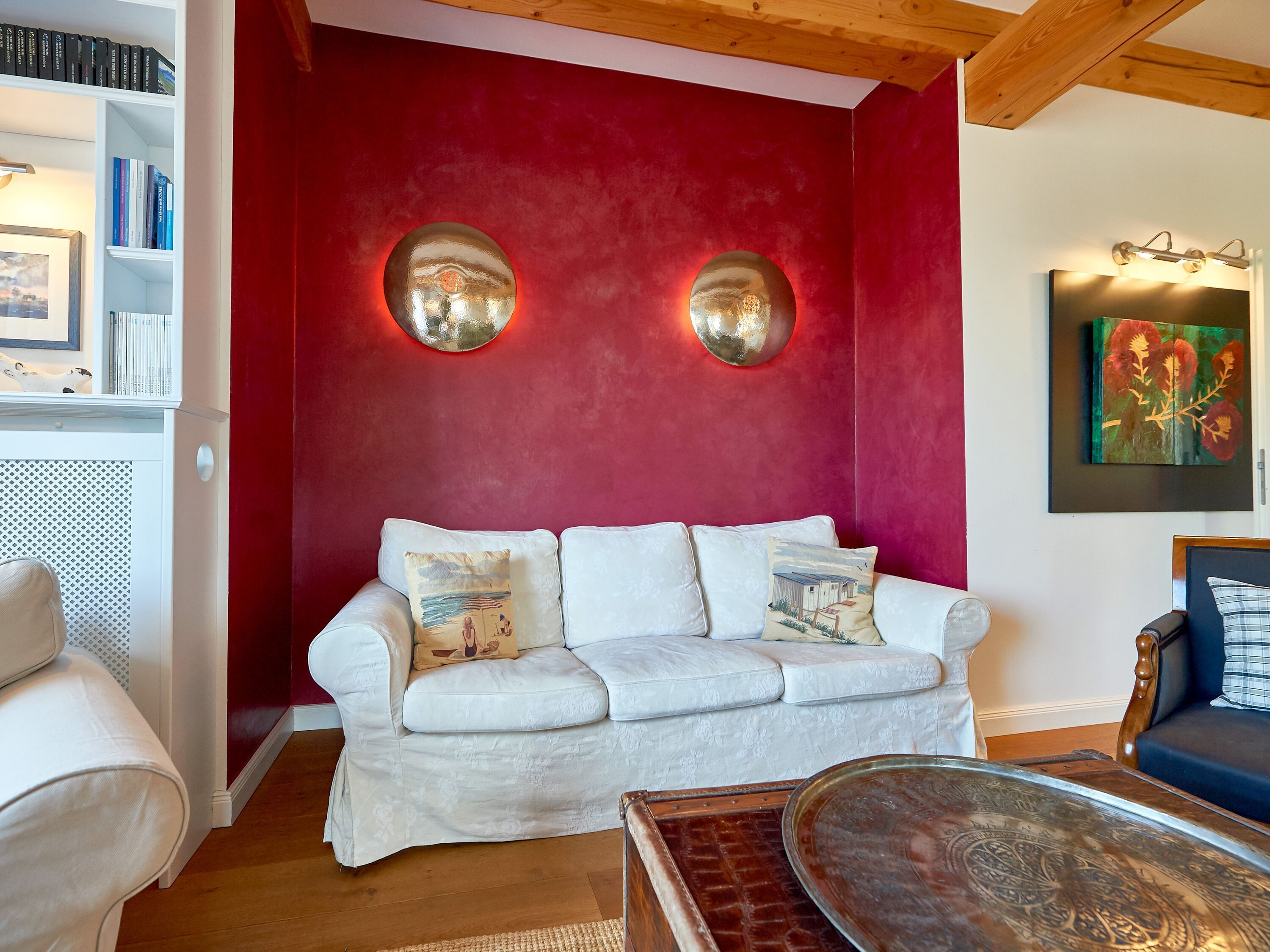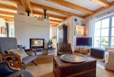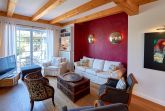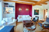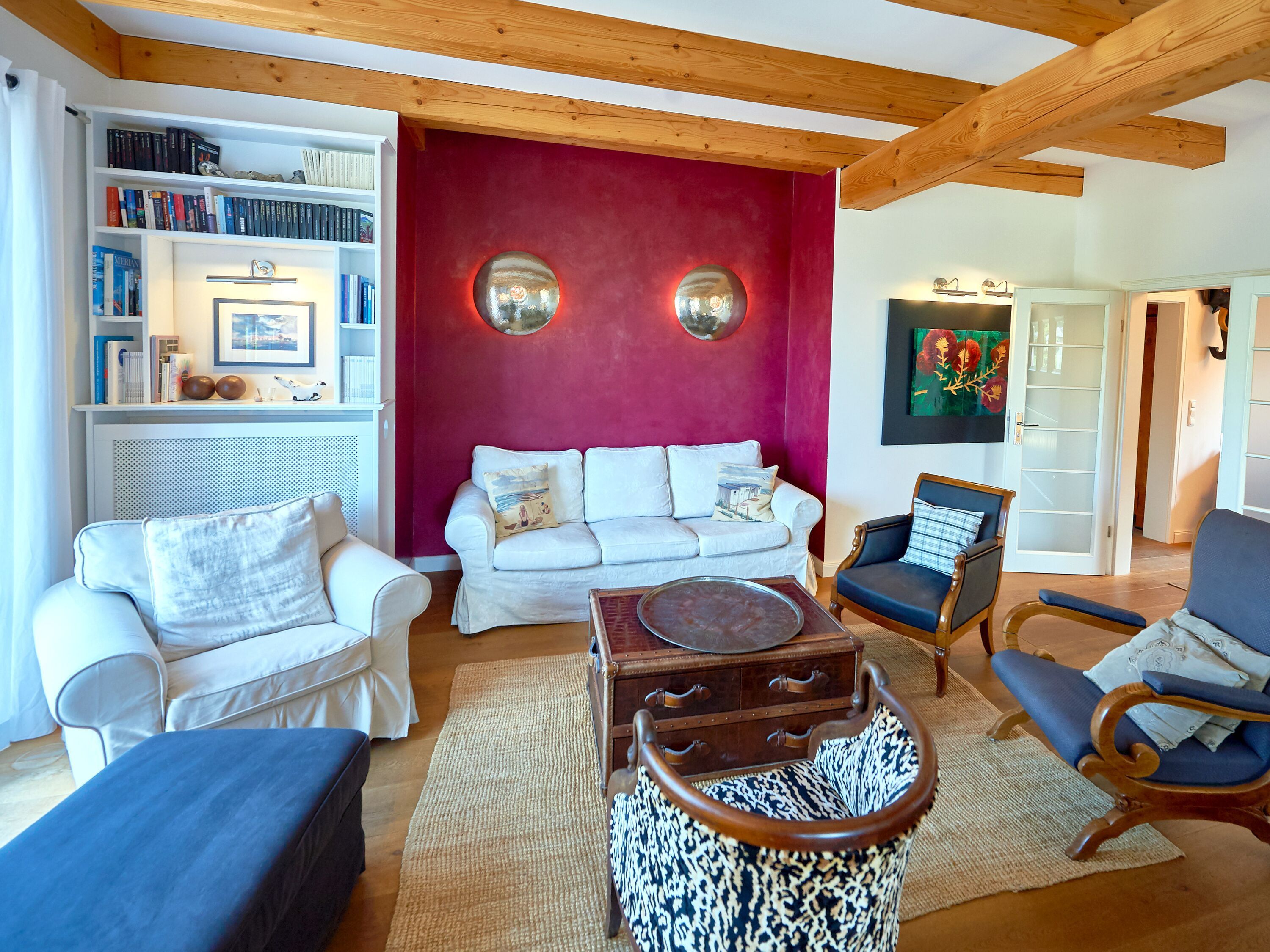 Das ca. 50 m² große Wohn-/Esszimmer mit der angrenzenden offenen Küche (auch mit einer stilvollen Schiebetür verschließbar) besticht durch die großzügigen Ausmaße unter gemütlichen Holzbalken und den Kamin. Der Wohnbereich mit der bequemen Couch und den vier Sesseln in verschiedenen Stilrichtungen wirkt durch eine wunderschön rot-gewachste Wand besonders edel und ist durch den zweiseitig verglasten Kamin als Raummittelpunkt optisch vom Esszimmerbereich getrennt. Kaminholz ist ebenso vorhanden wie eine Stereoanlage mit CD-Player. Ein in schwarzem Schellack ausgeführter Vitrinenschrank im Empirestil bildet den Übergang zum Essbereich.