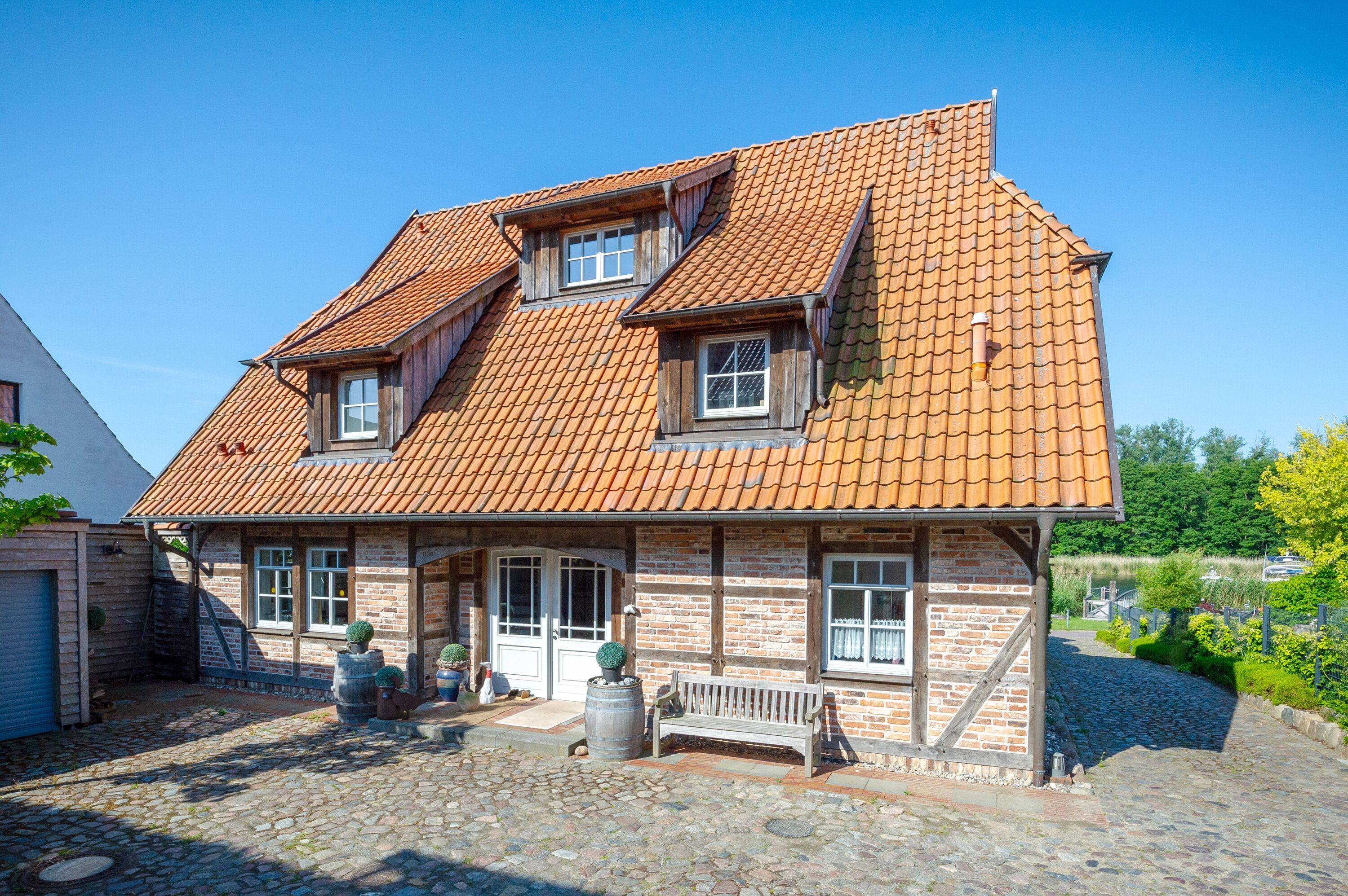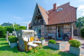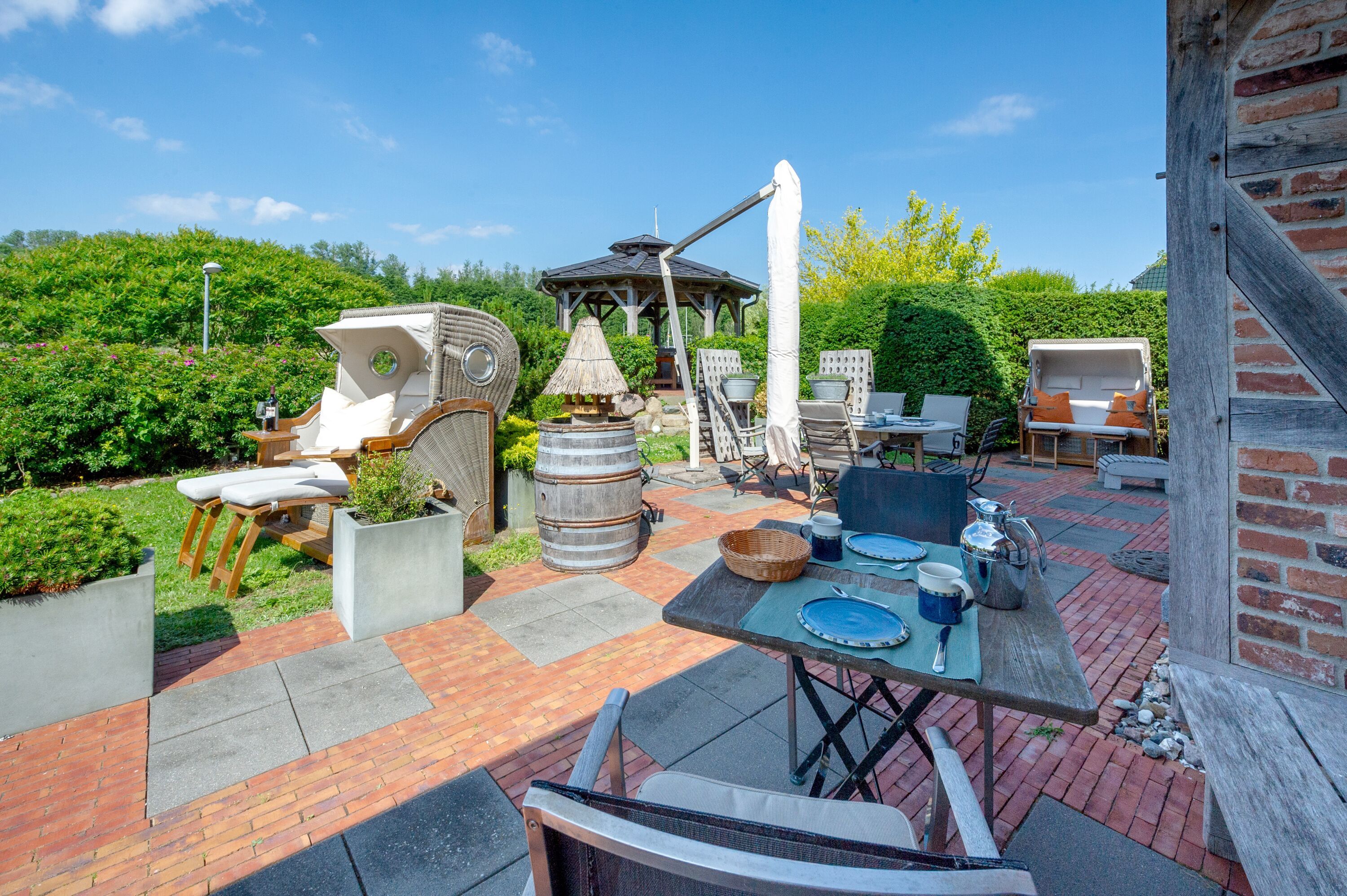 Sonnenliegen und eine Sitzgruppe auf der Terrasse nach Südwesten führen die sehr gute Ausstattung auch im Außenbereich fort und bieten die Möglichkeit, sich rundum wohl zu fühlen. Ein erhöhter Pavillon im Vorgarten mit einer Grillecke und einem herrlichen Ausblick über das verträumte Fischerdörfchen und auf die Having vervollkommnen dieses Arrangement.