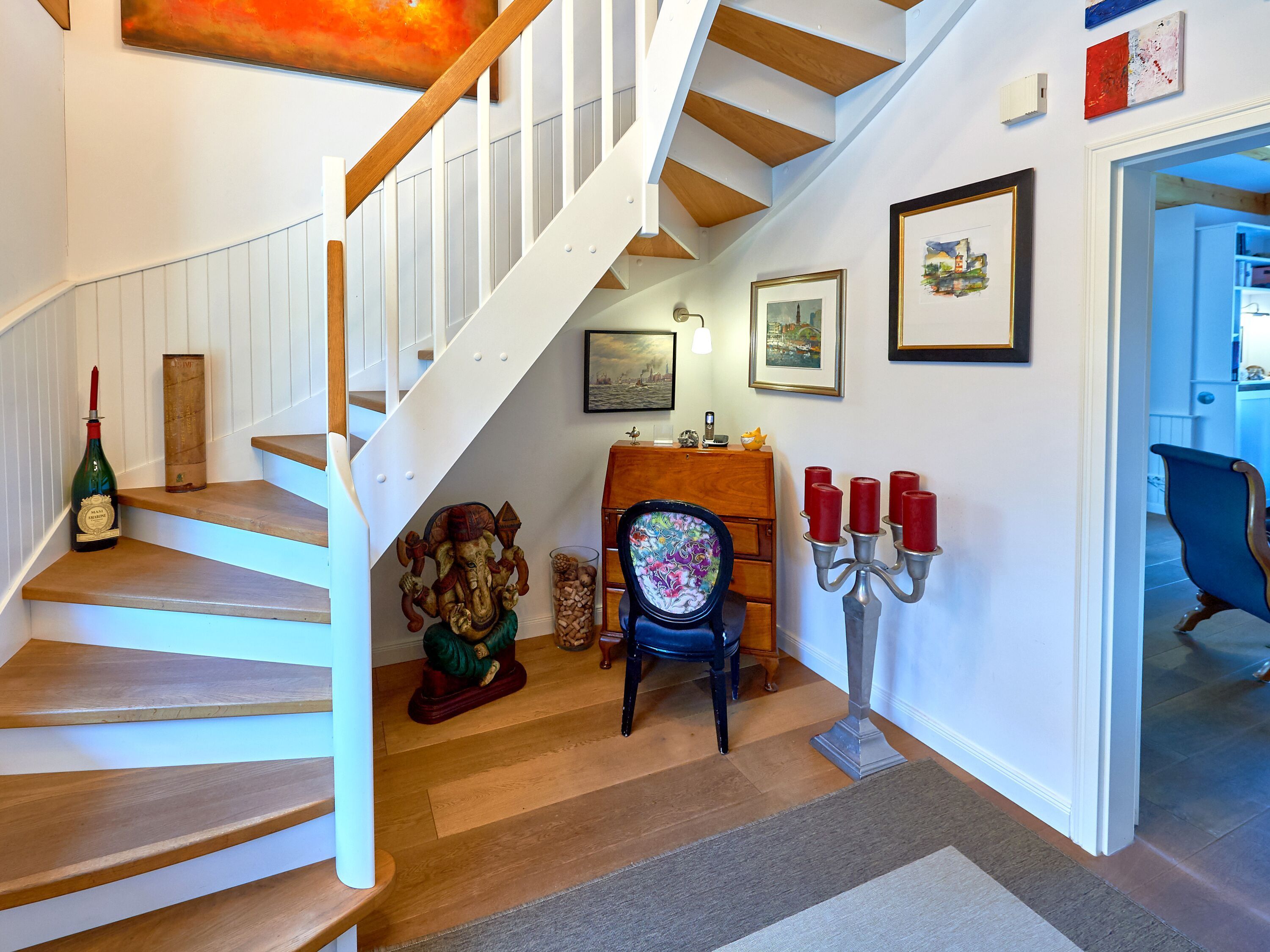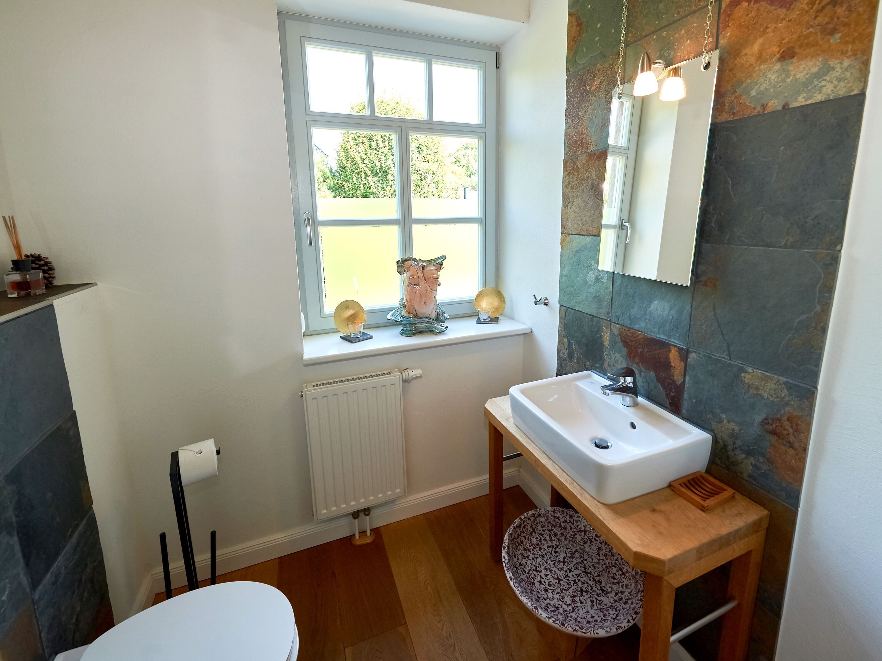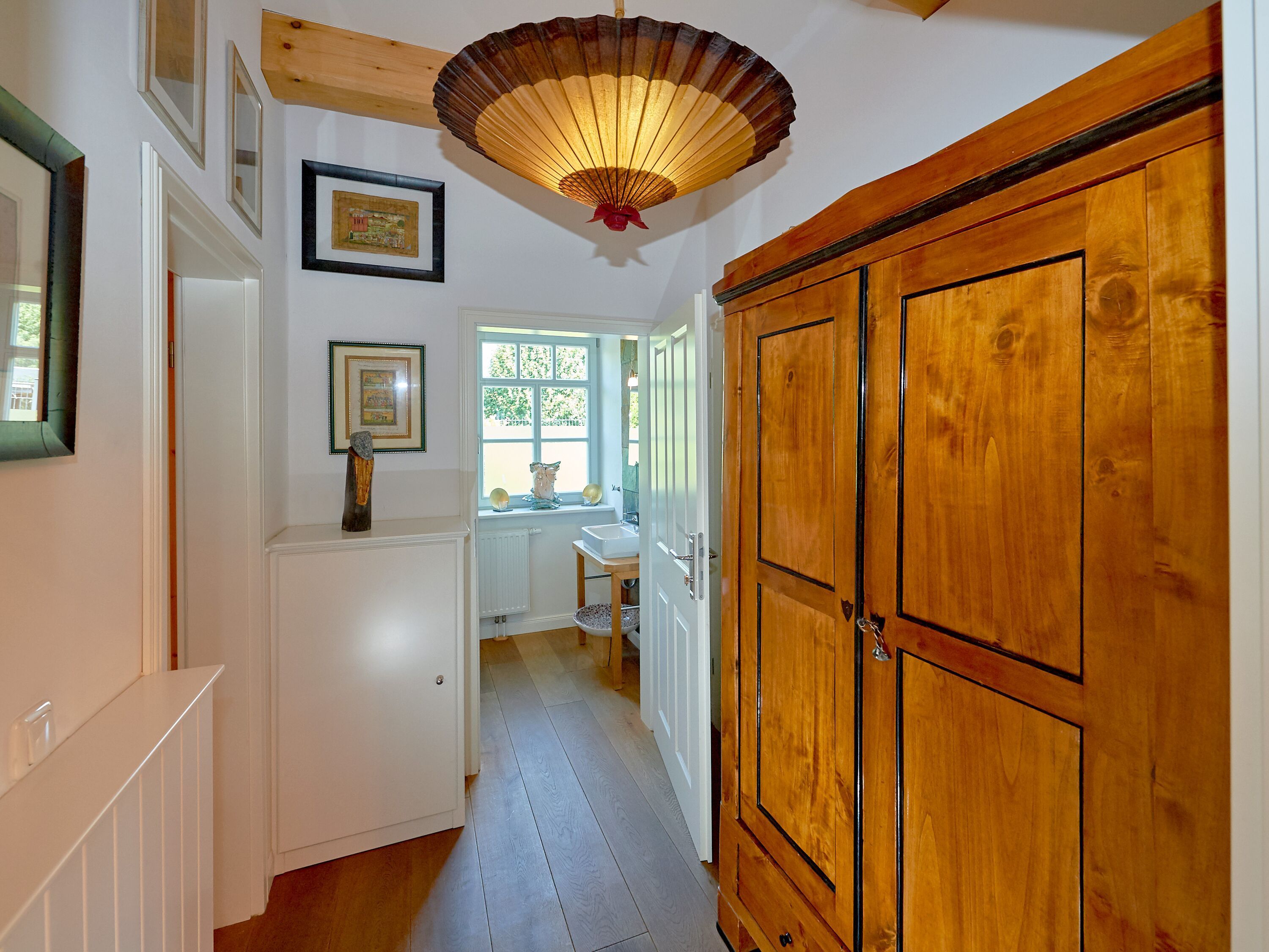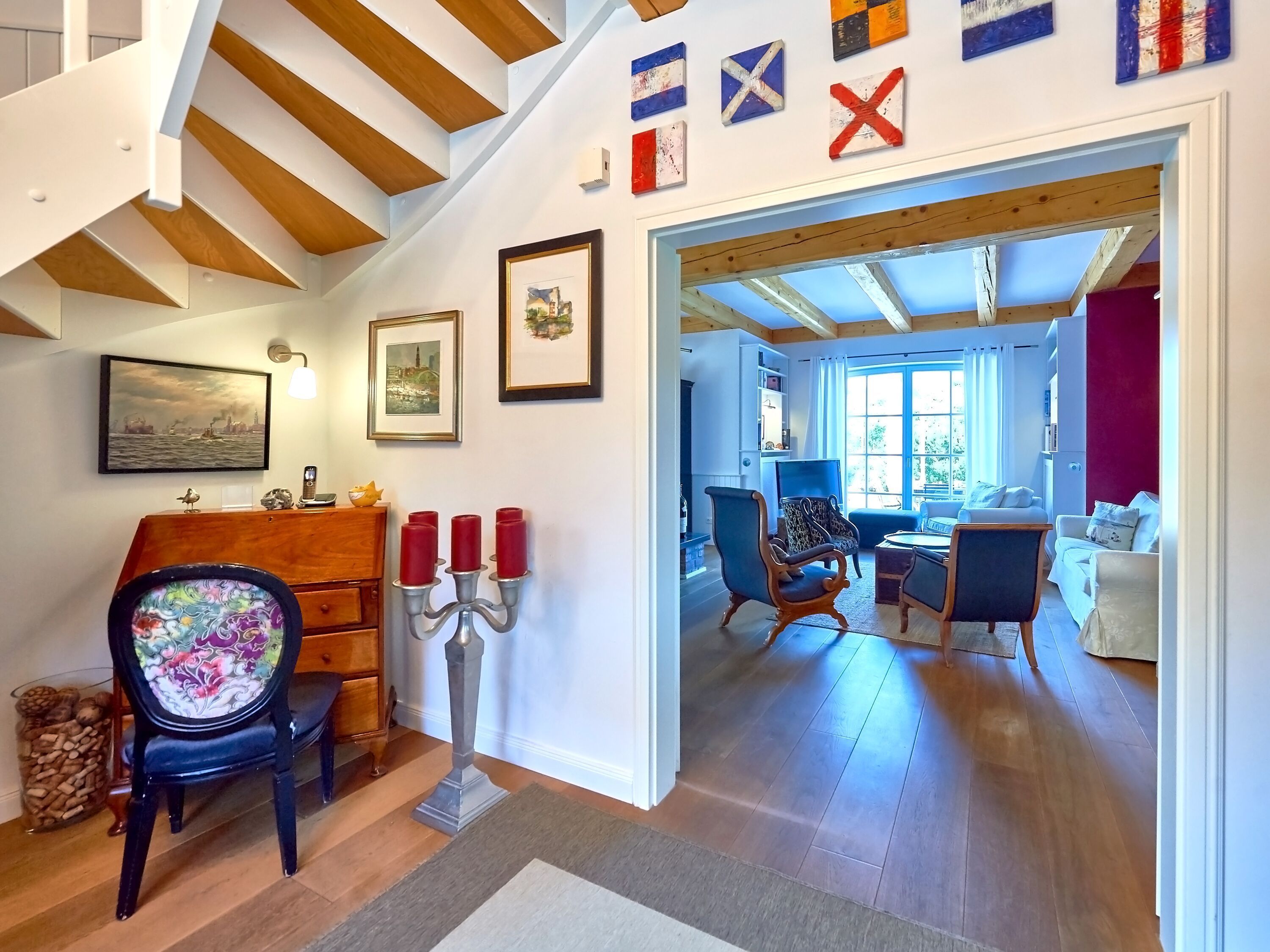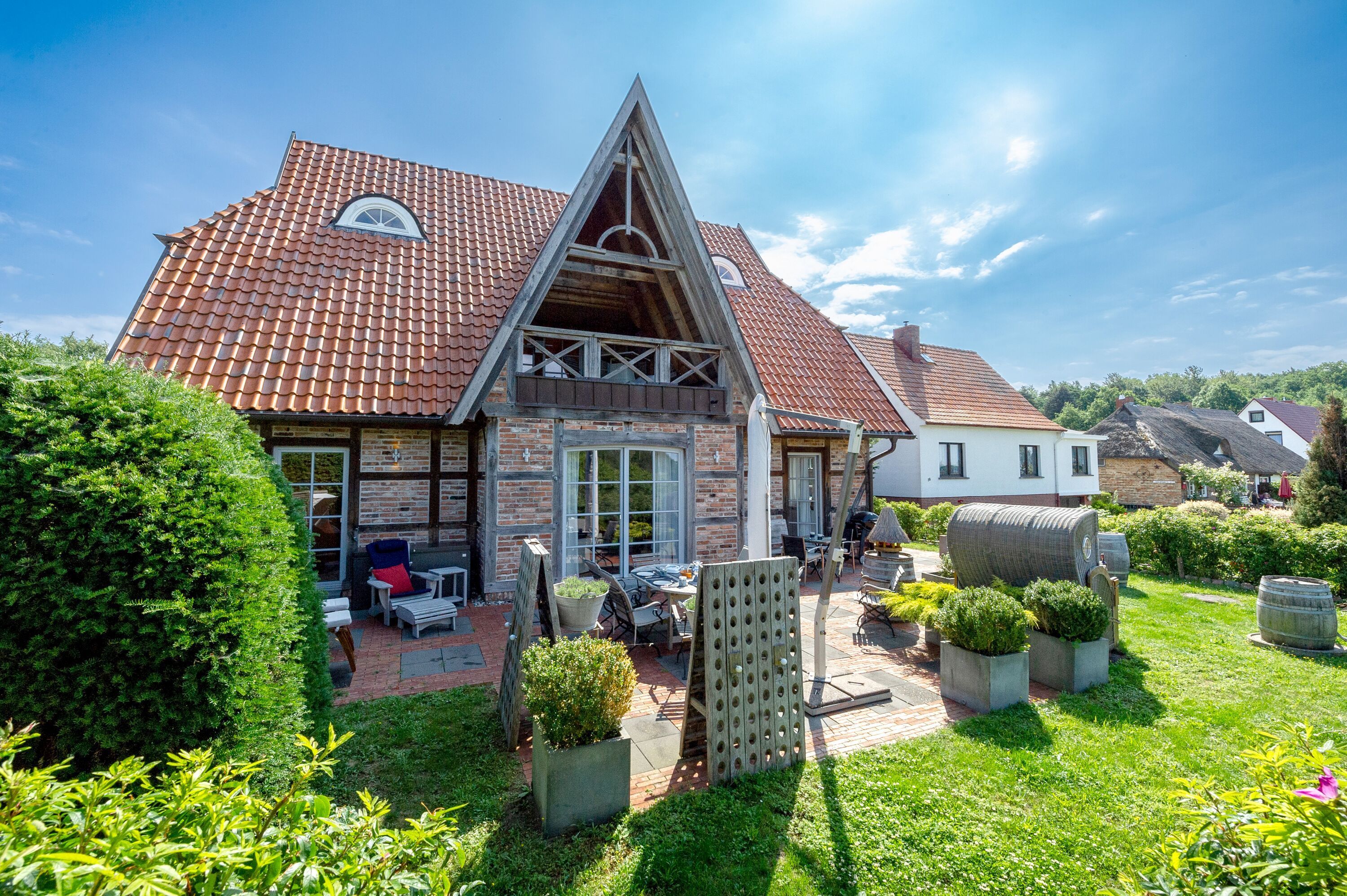 Die exklusive Fachwerkvilla Johanna Maria mit Blick über die Lanckener Beek und die zum Greifswalder Bodden gehörende Having bietet rund 210 qm Wohnfläche und verfügt über eine großzügige Gartenterrasse (ca. 35 m²) und einen erhöhten Pavillon zur Südwestseite. Das Haus erwartet Sie im Eingangsbereich mit einem Sekretär mit einem Telefon für kostenfreie Telefonate in das dt. Festnetz und einem Garderobenschrank im Biedermeierstil. Weiterhin gibt es im Erdgeschoss, das mit echten Eichendielen ausgelegt ist, ein modernes Gäste-WC, einen Hauswirtschaftsraum mit Waschmaschine, Trockner und Tiefkühlschrank und einen Wellnessraum mit einer Sauna, einem Hometrainer, einer Massagedusche unter Holzbalken und einem eigenem Zugang zur Terrasse.