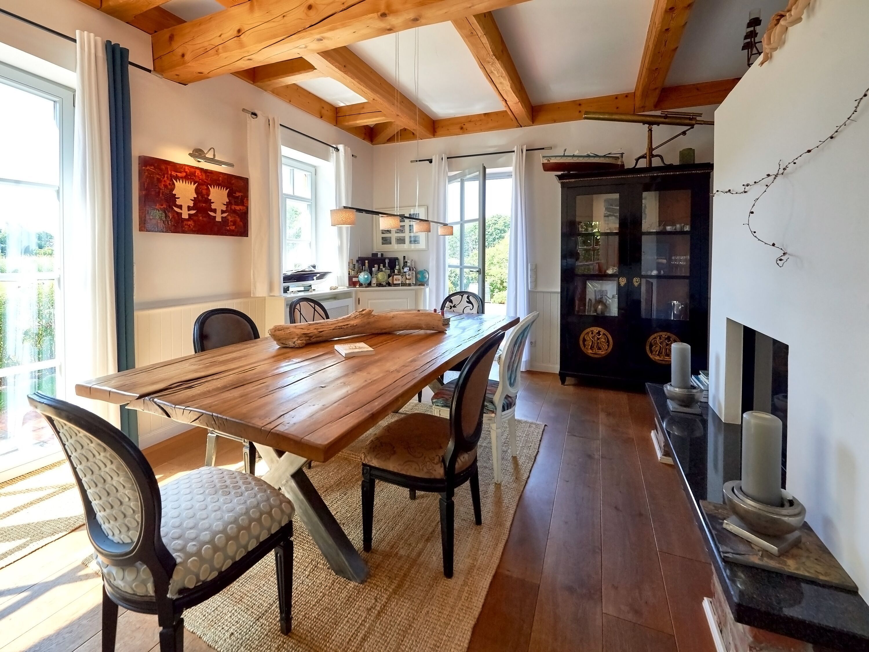 Im Essbereich erwartet Sie ein großer Esstisch für 6 - 8 Personen aus urwüchsiger Mooreiche, der mit den Designerbezügen der alten Kaffeehausstühle angenehm kontrastiert.