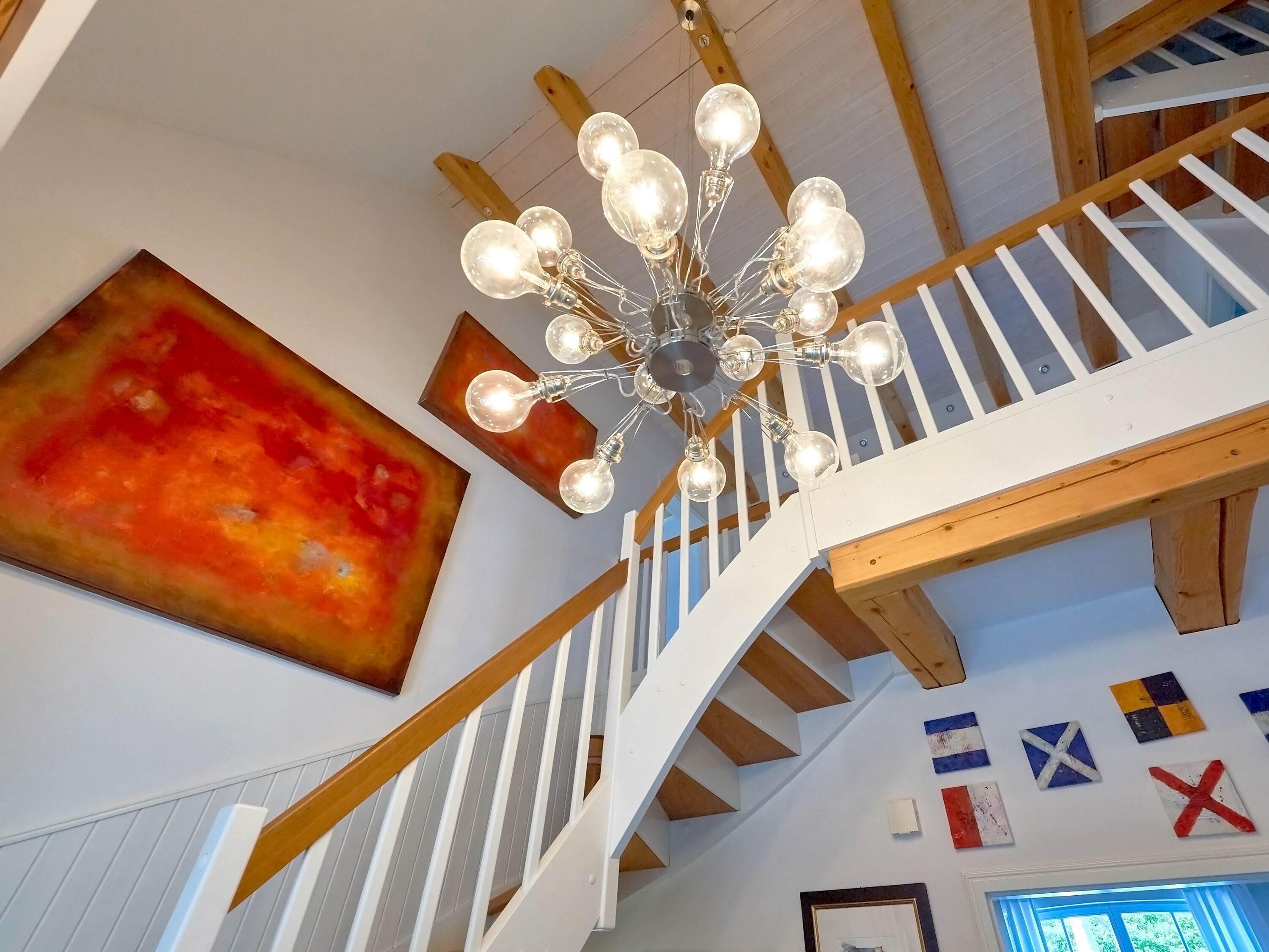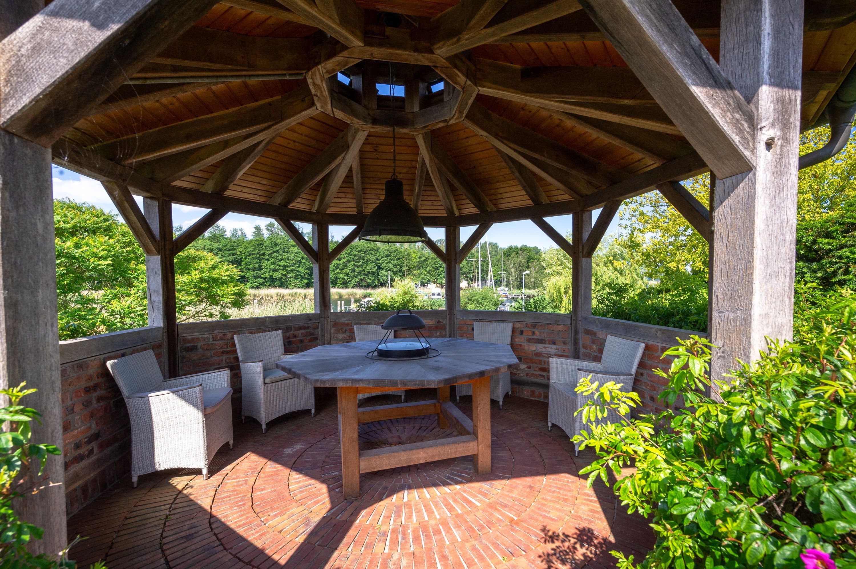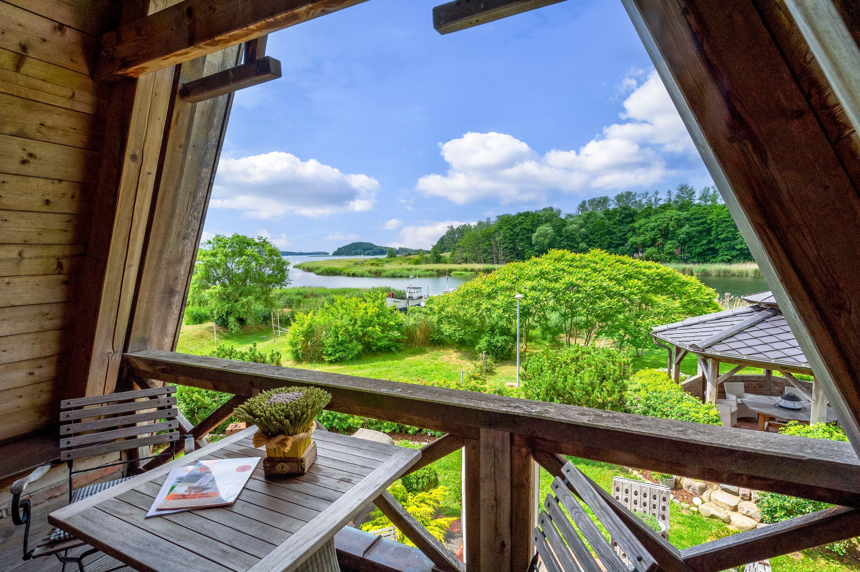 Die großzügig bestuhlte Loggia befindet sich unter einem Spitzgiebel und bietet unter Fachwerkbalken einen traumhaften wind- und wettergeschützten Ausblick über das Wasser.