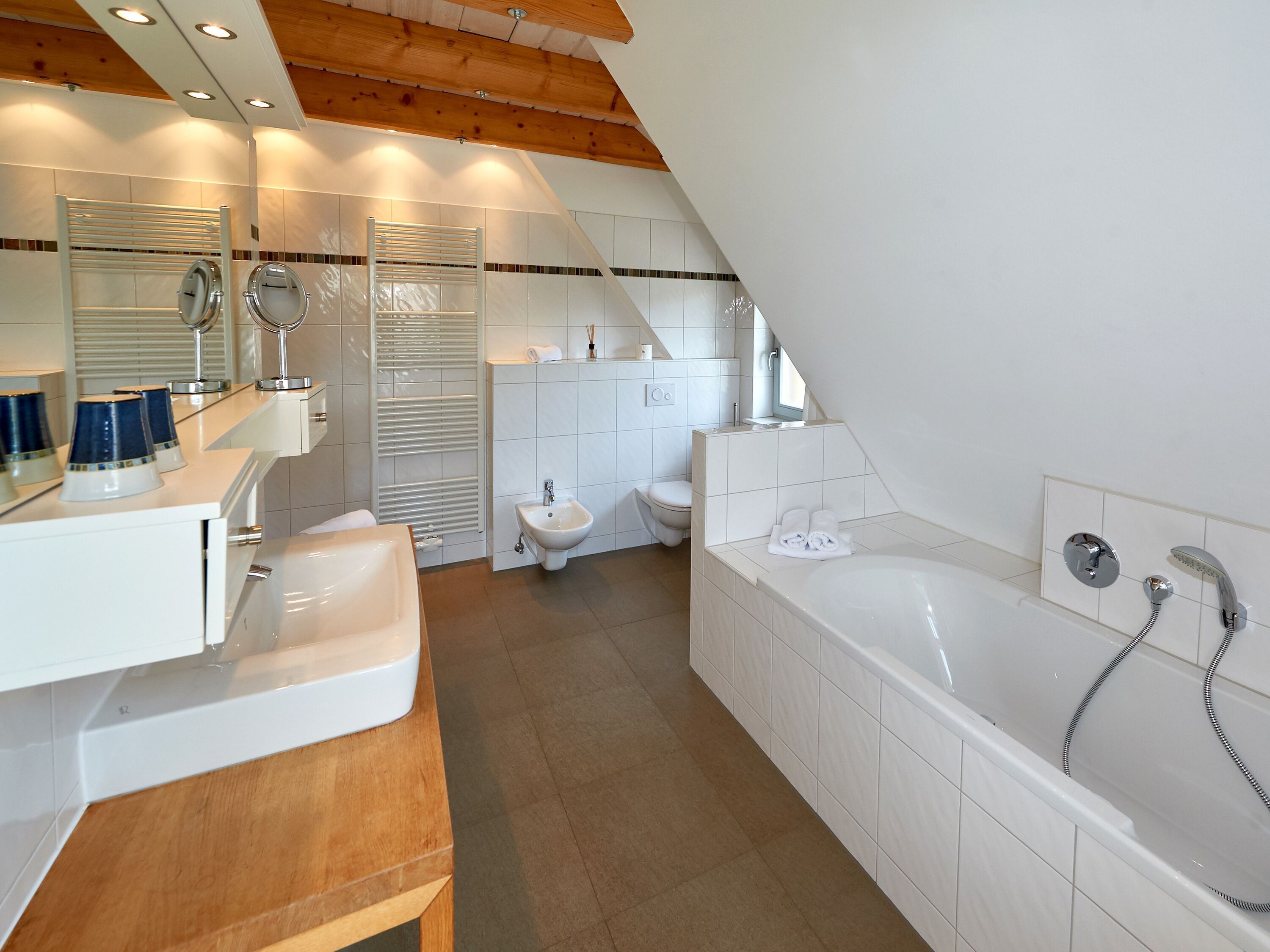 Im mit Laminat ausgelegten Obergeschoss befindet sich das große Schlafzimmer mit zwei Einzelbetten, die zu einem Doppelbett (200 x 200 cm) zusammen gestellt wurden. Ein Flachbild-TV, ein großer Kleiderschrank sowie das angrenzende großzügige Badezimmer mit Dusche, WC, Bidet, Handtuchheizung, Badewanne und mit einem schönen Blick zur Having gehören ebenfalls dazu.