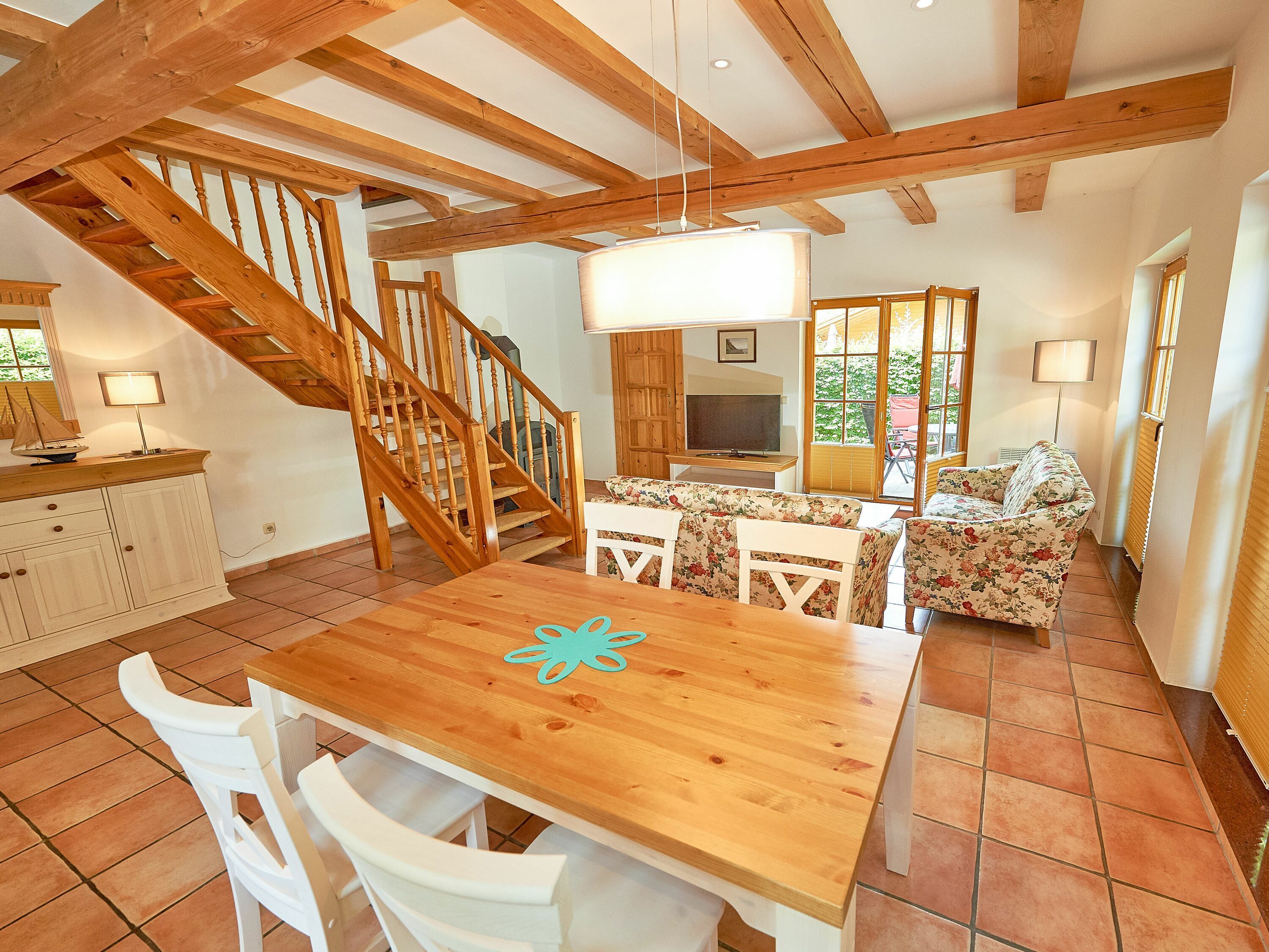 Die Haushälfte 4 begrüßt Sie an den hinteren Außenseite des Strandschlösschens Sellin mit auf zwei Ebenen verteilten Wohnfläche von rund 100 m² und vorgelagerter Terrasse. Wie in den anderen Haushälften auch, befindet sich das durch die offenen Balken besonders gemütlich wirkende Wohnzimmer im Erdgeschoss.