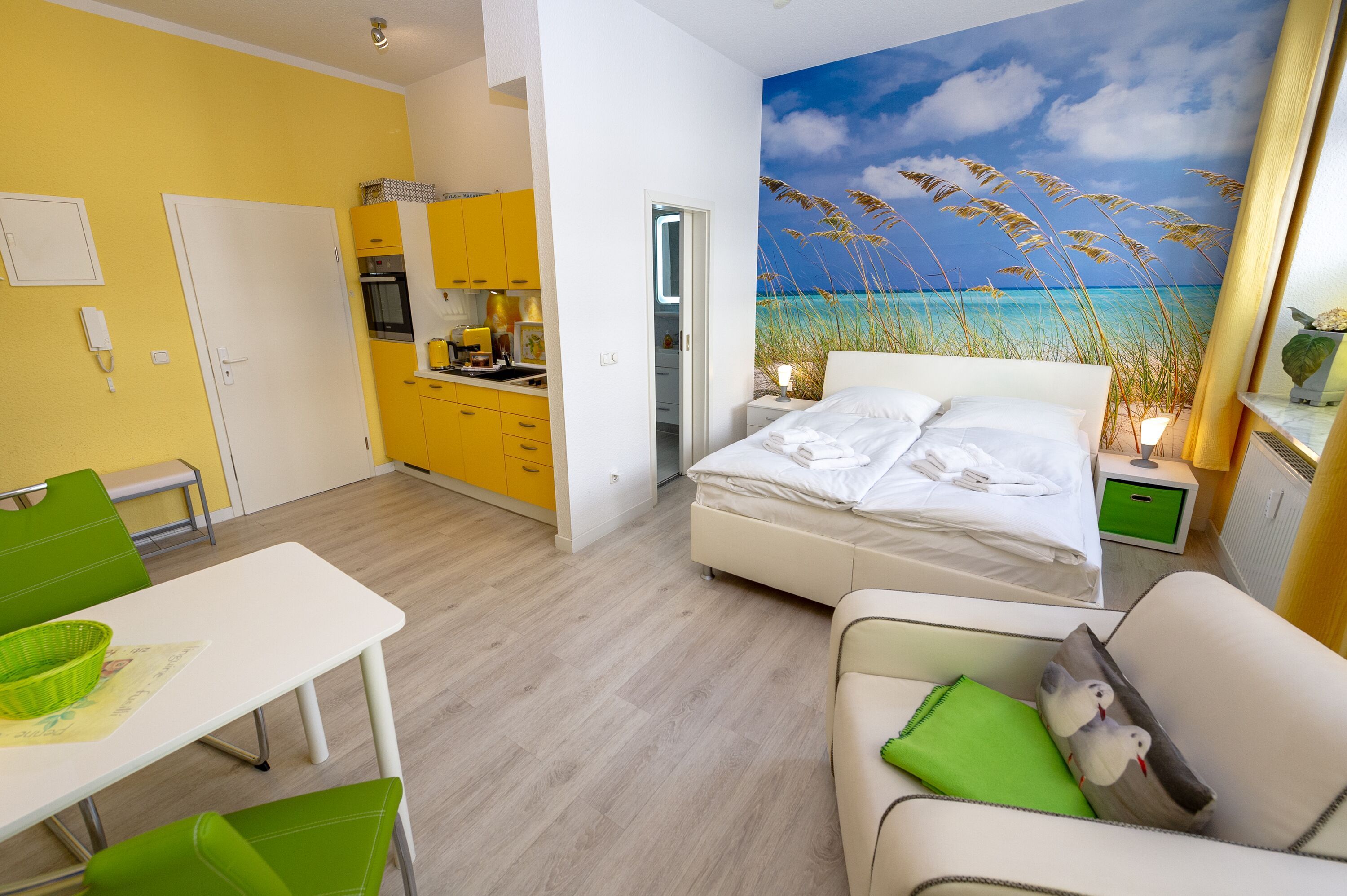 Dieses angenehm ruhig gelegene 1-Raum-Appartement erwartet Sie im ersten Obergeschoss der Villa Sirene. Ihr Zuhause auf Zeit ist rund 28 m² groß und strahlt durch seine moderne, freundliche Einrichtung eine behagliche Wohlfühl-Atmosphäre aus. Wenn Sie eines der großen Fenster öffnen und hinausschauen, können Sie einen seitlichen Blick aufs Meer erhaschen.