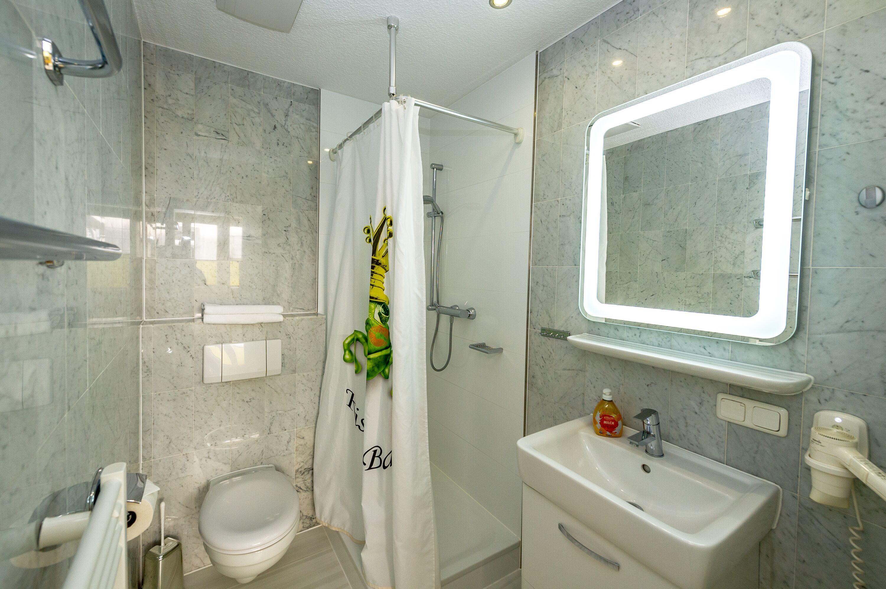 Im elegant gefliesten Duschbad mit WC, Waschtisch und Spiegel stehen Ihnen ein Haartrockner, ein Handtuch-Heizkörper und natürlich auch Ablageflächen für Ihre persönlichen Utensilien zur Verfügung.
