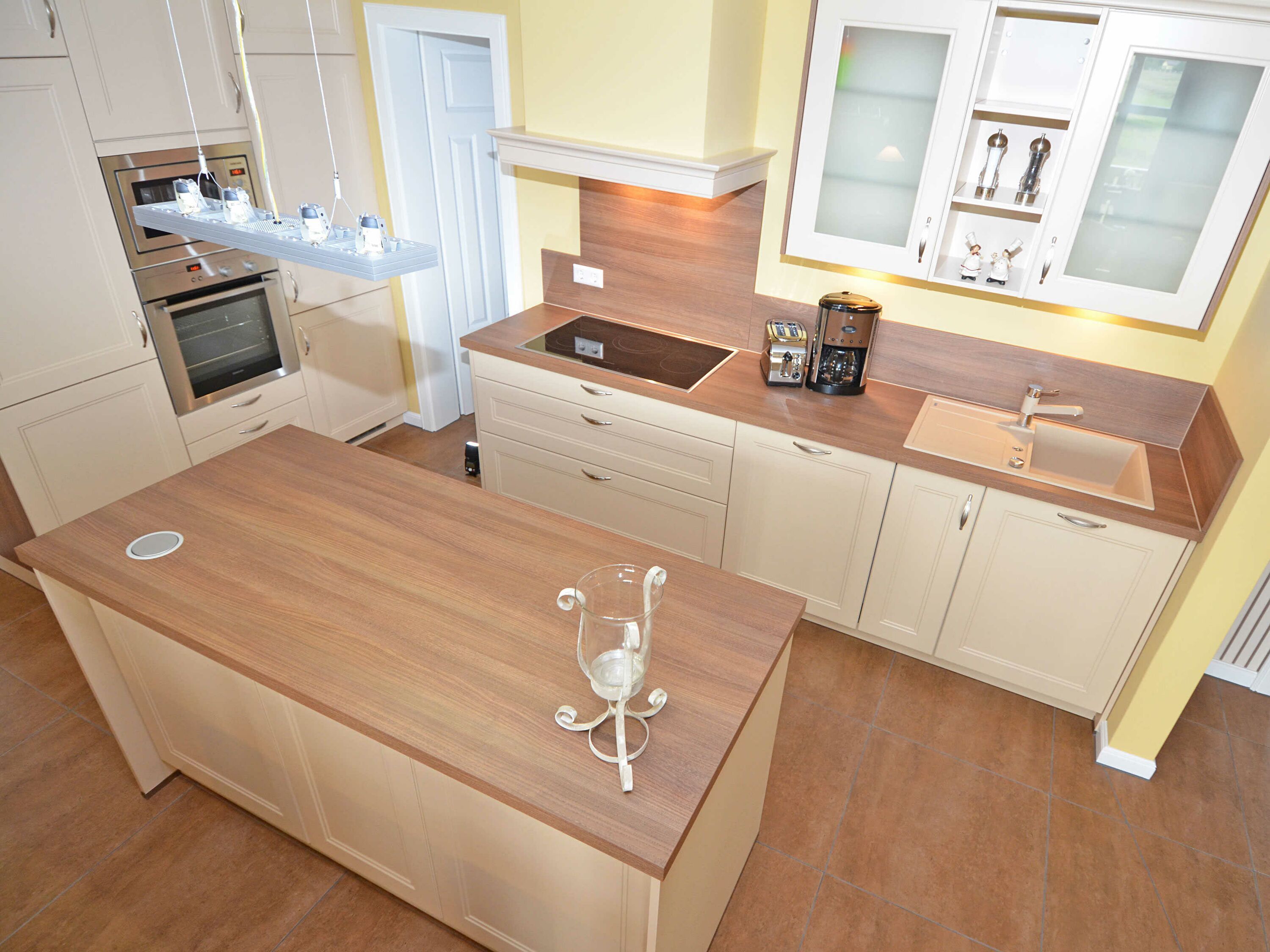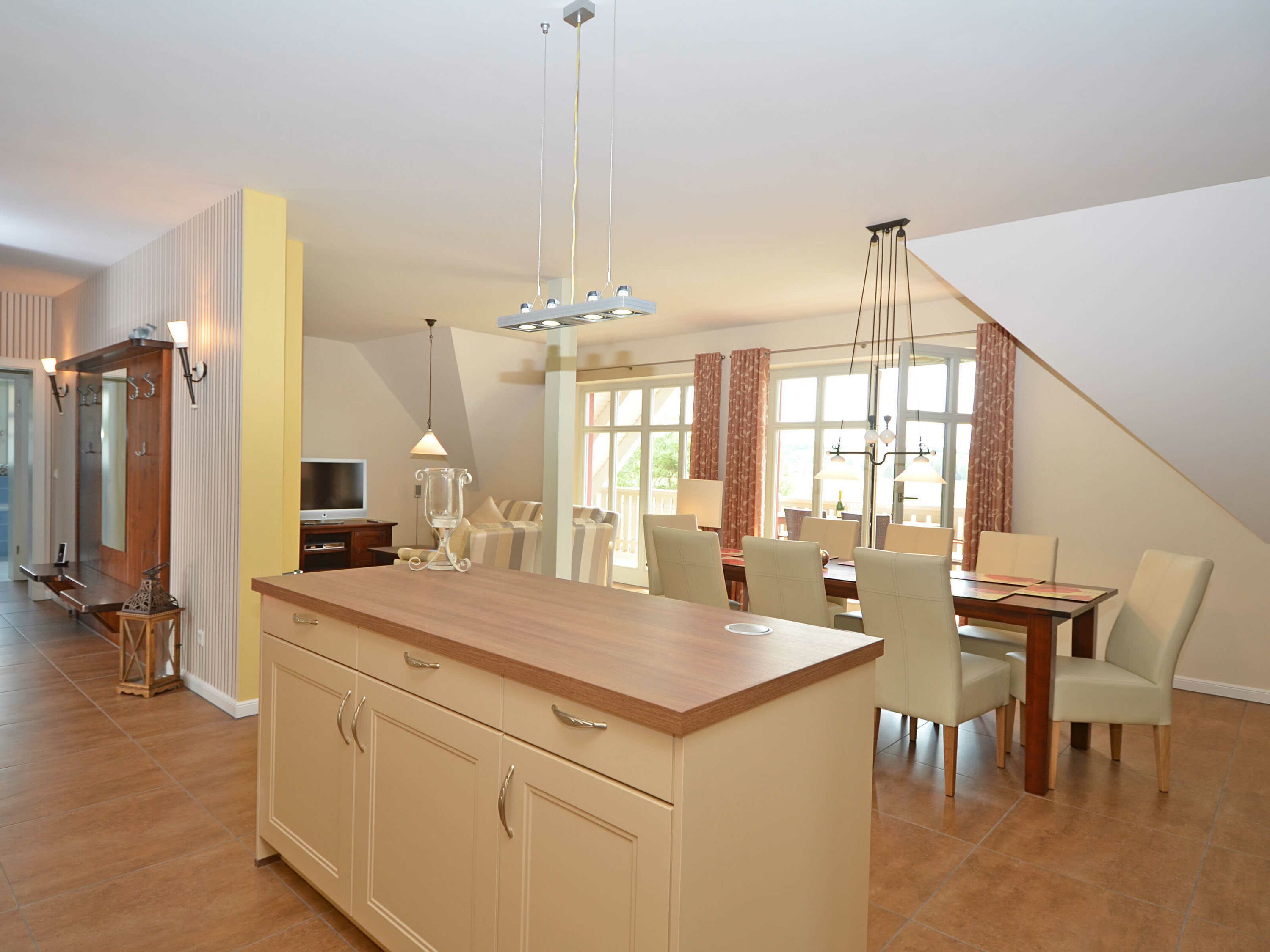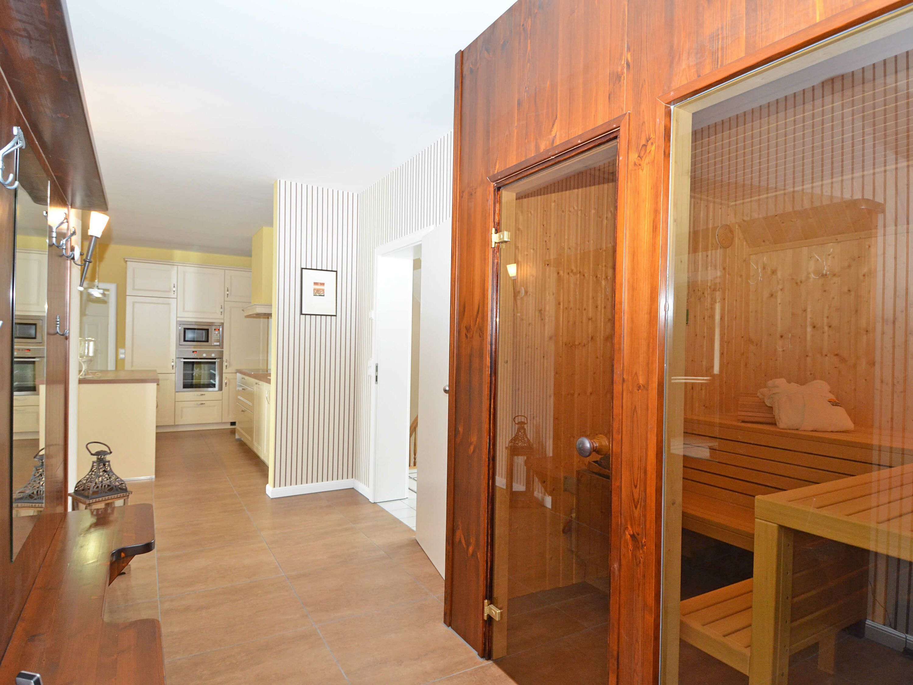Die harmonisch im Wohnbereich integrierte, hochwertige Küche in modernster champagner-beige farbigen Optik verfügt über einen Kühlschrank mit Gefrierschrank, ein Cerankochfeld, einen Backofen, eine geräuscharme Spülmaschine, eine Mikrowelle, Kaffeemaschine, Wasserkocher, Toaster, Brot-und Wurstschneidermaschine und diverse Kleinutensilien, die die Küchenausstattung komplettieren. Die große Speisekammer bietet Ihnen ausreichend Stauraum für die Urlaubsverpflegung.