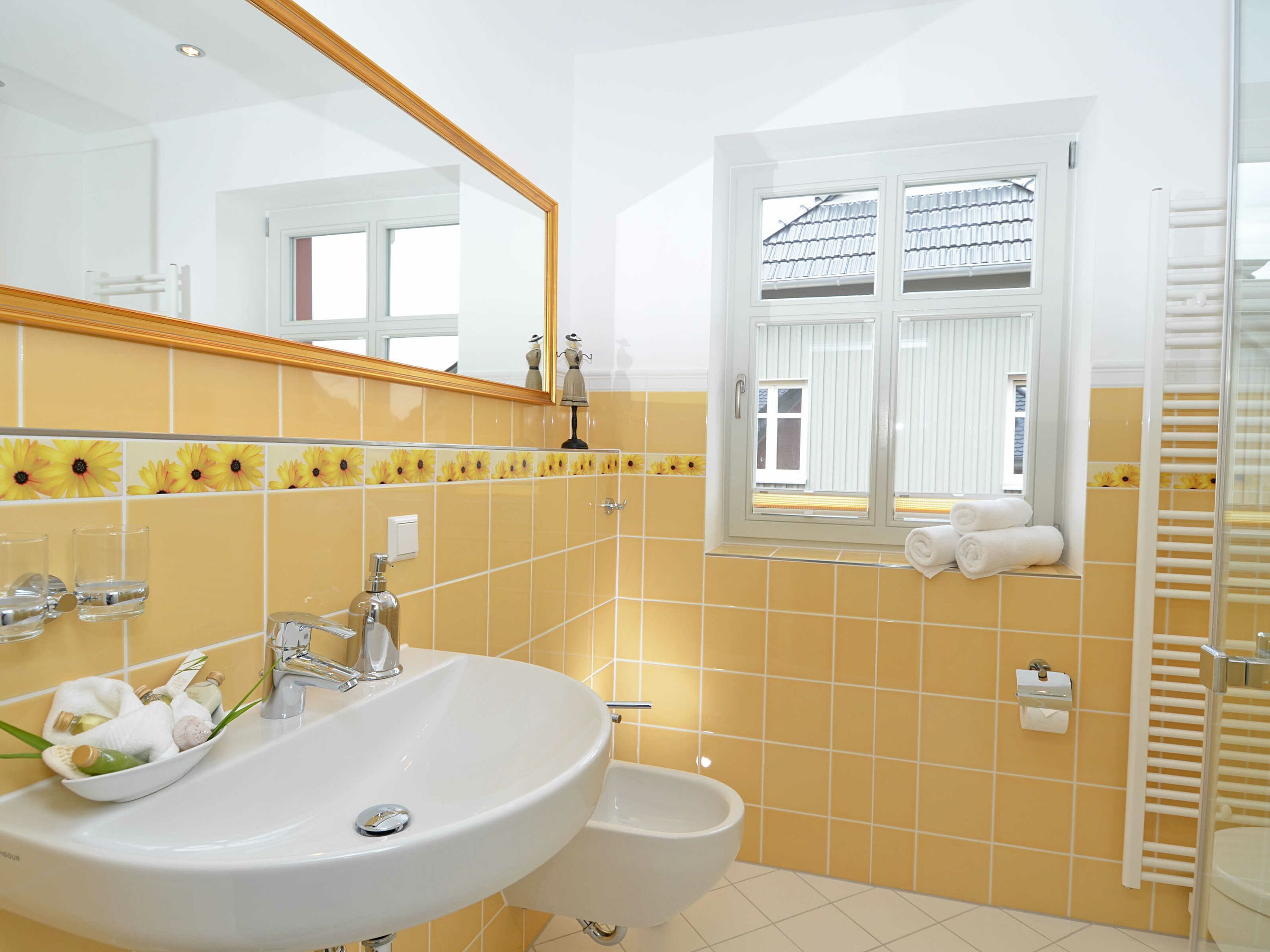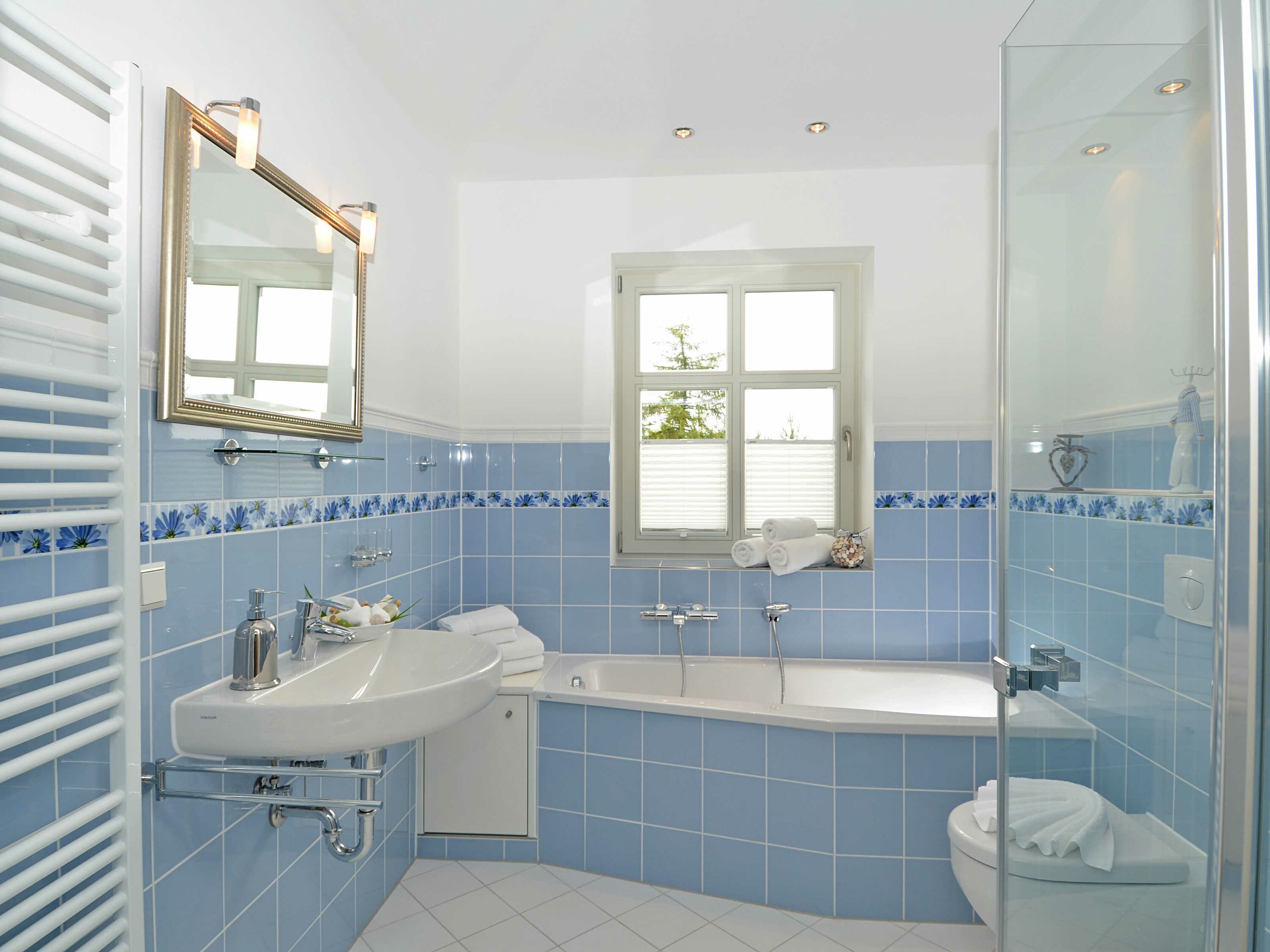 Die zwei lichtdurchfluteten Bäder sind mit Villeroy & Boch Fliesen gestaltet und moderner Sanitärkeramik ausgestattet, mit jeweils einem großen Waschbecken, flacher Ganzglasdusche und WC. Das größere der beiden Bäder verfügt zusätzlich über eine Badewanne, das Kleinere über ein Bidet.
