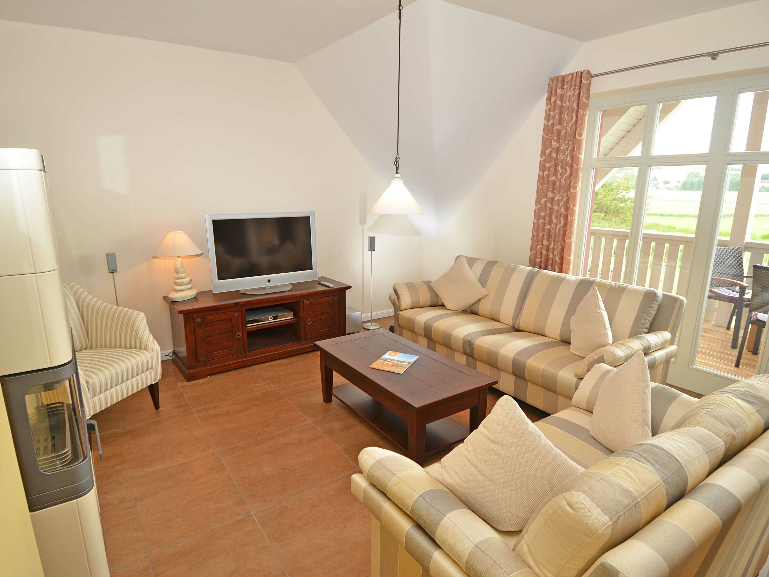 Der Fußboden ist im Wohn- und Küchenbereich mit Bodenfliesen in einem warmen braunen Ton versehen, welcher ebenso wie alle anderen Räume, über eine regulierbare Fußbodenheizung verfügt. Für die kuschligen Wochen gibt es einen Kaminofen von CONTURA mit Speicherfunktion in passender Kacheloptik.