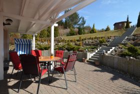 Die große Terrasse zur Südseite ist mit hochwertigen Terrassenmöbeln, Sonnenliegen sowie einem Grill versehen.