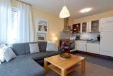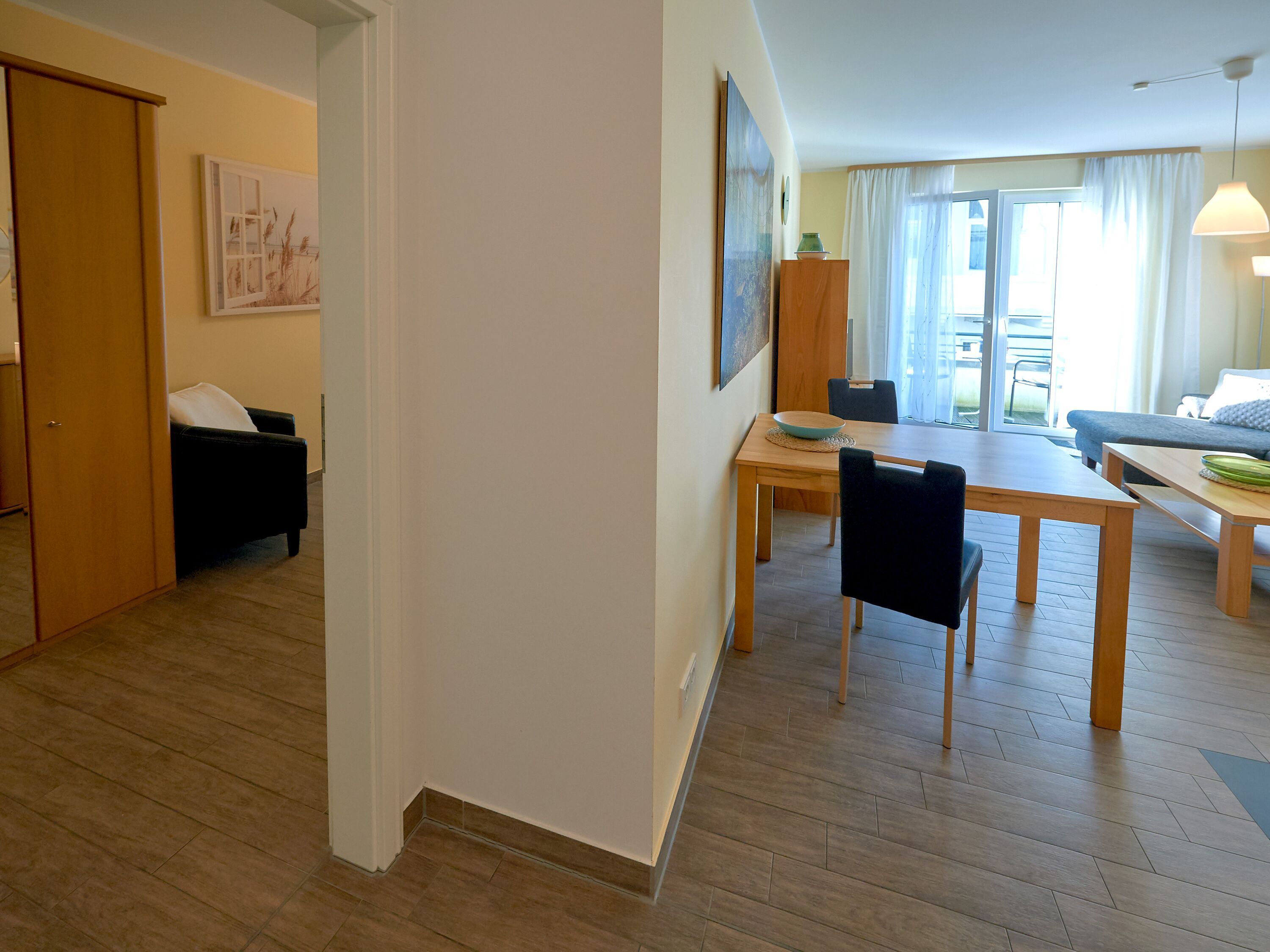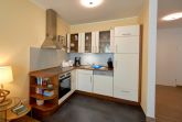 Die harmonisch im Wohnbereich integrierte Küchenzeile ist mit einem Kühlschrank mit Gefrierfach, einem Backofen, einem 4-Zonen-Cerankochfeld sowie einer Spülmaschine und diversem Kleininventar, das die Küchenausstattung komplettiert, eingerichtet. Bis zum nächsten Bäcker und zum Edeka-Einkaufsmarkt sind es nur jeweils ein paar Gehminuten. Speisen können Sie wahlweise am Esstisch im Wohnzimmer oder nach Belieben gern auch draußen auf dem möblierten Balkon.
