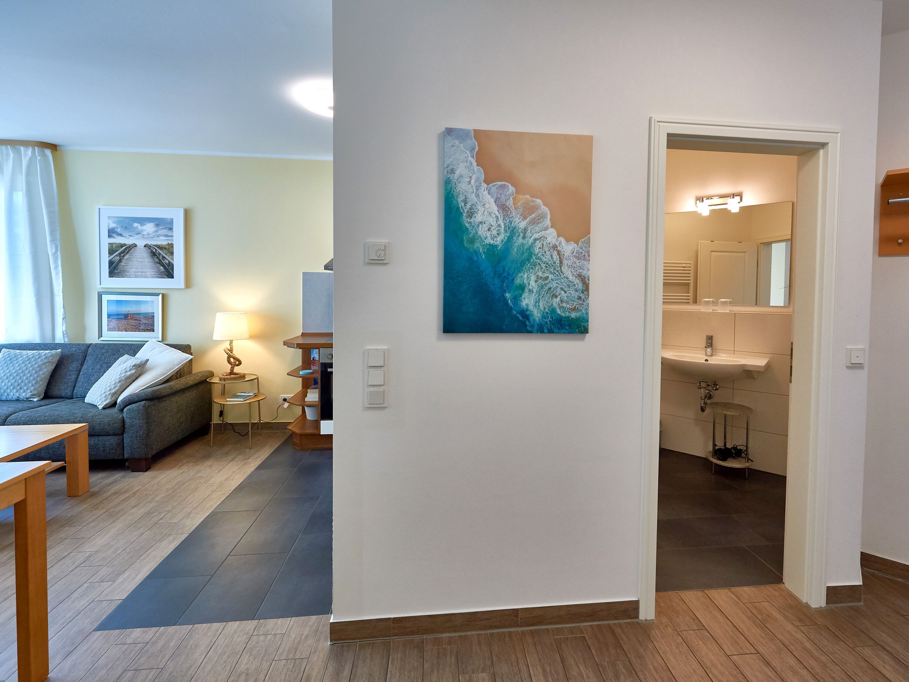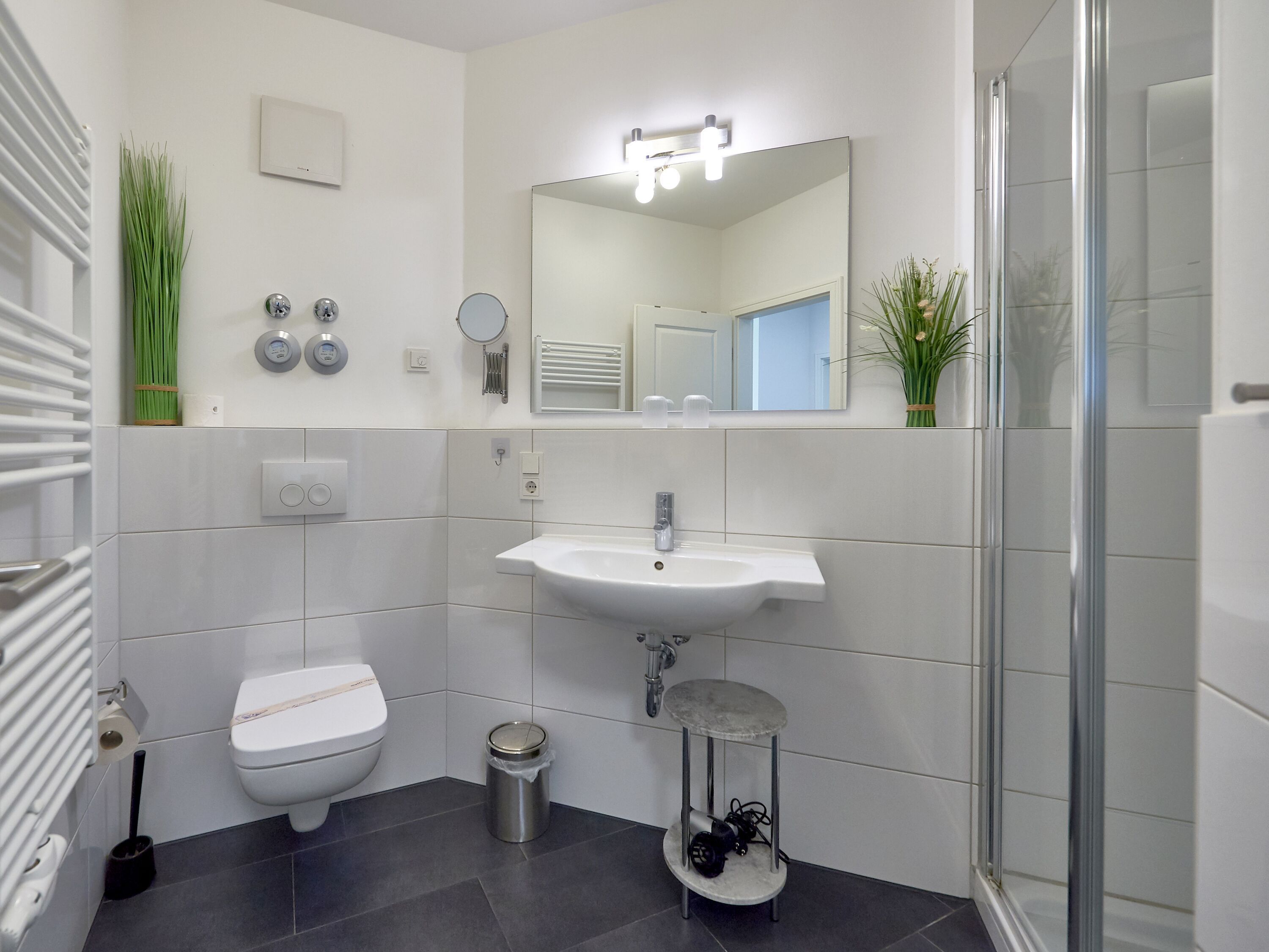 Das Appartement verfügt über ein großzügiges modernes Duschbad mit WC, beleuchtetem Waschtisch, Handtuchwärmer und Fön.